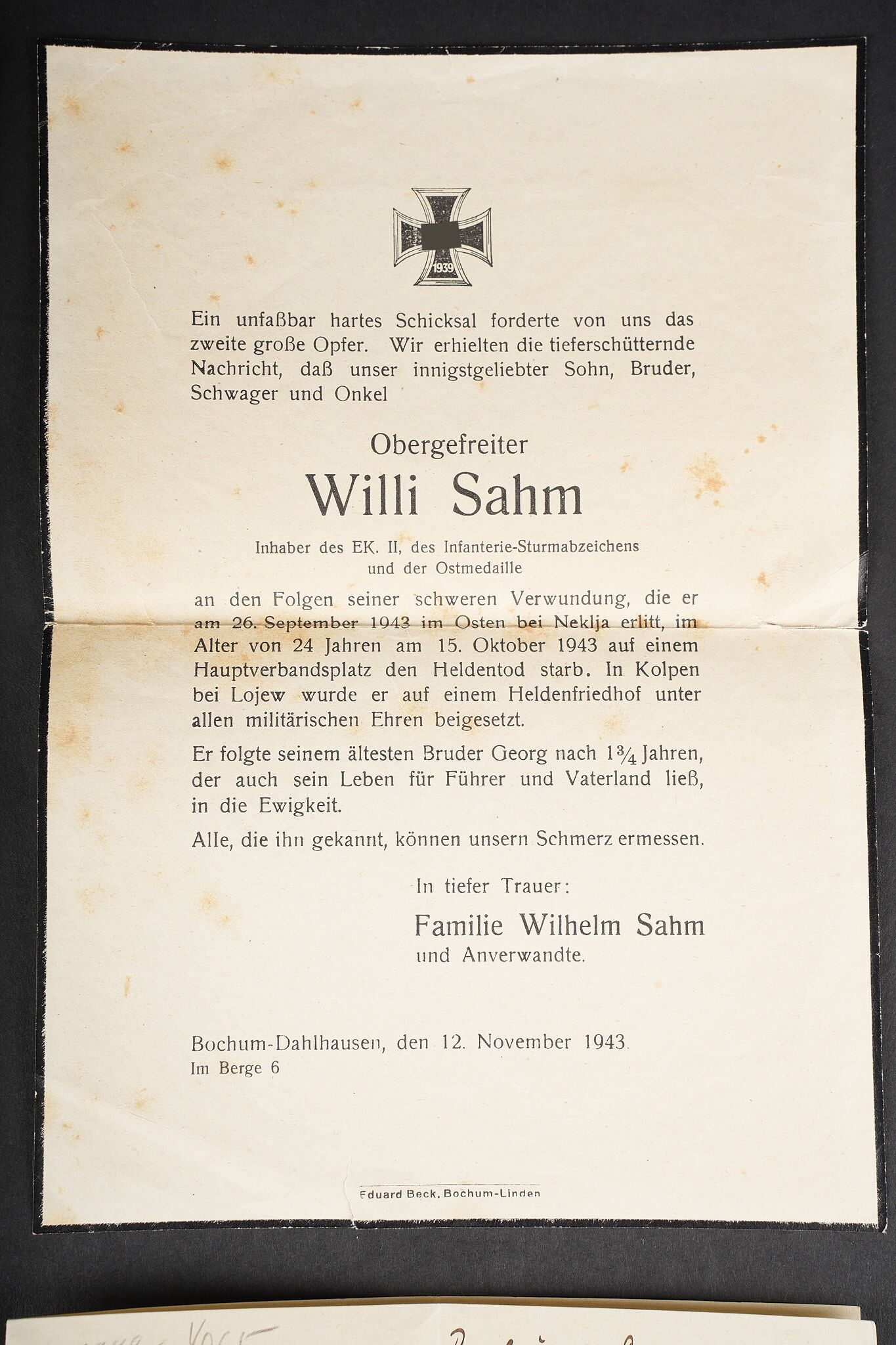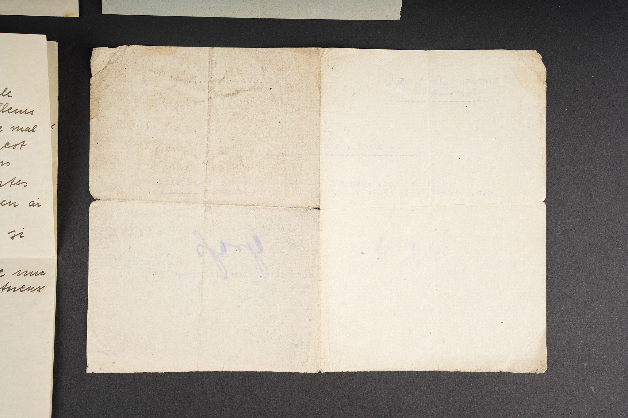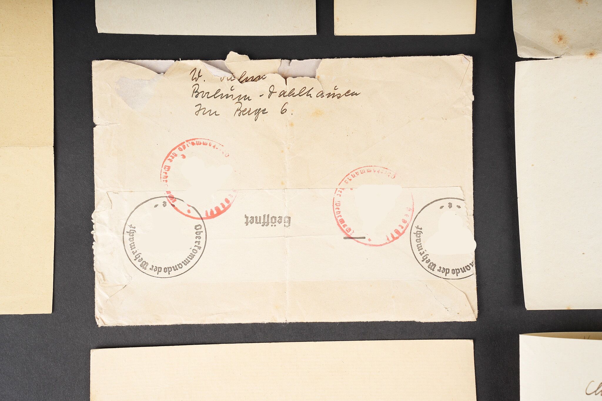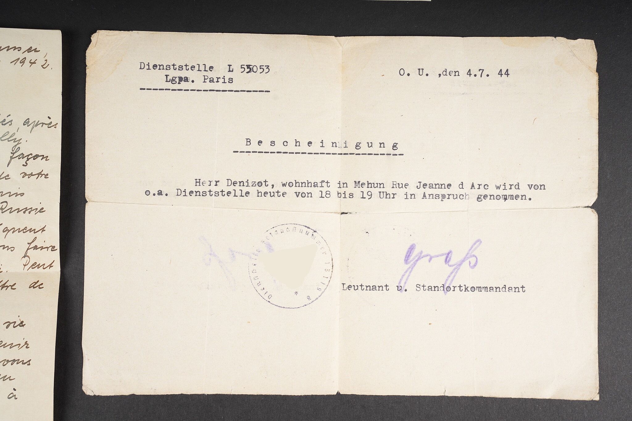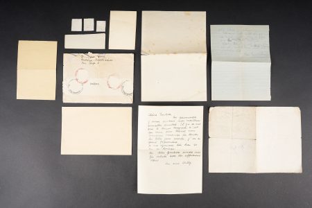 Correspondance entre un Soldat Allemand et une Française. Bel ensemble de document comprenant une lettre envoyée en septembre 1942 par le soldat Allemand Willi Sahm , rédigée en Français et adressée à Marcelle M. Domiciliée à Mehun sur Yèvre dans le Cher. Une seconde lettre rédigée en allemand depuis Mehun sur Yèvre par madame D. Une photo de Willi Sahm en uniforme de la Wehrmacht. L’avis de décès de l’obergefreiter Willi Sahm en octobre 1943 sur le Front de l’est. Une lettre tapuscrit envoyée par la famille Sahm en 1943 à la famille D. Un certificat de réquisition à propos d’un bureau de la Famille D. par la Wehrmacht. Une pub du magasin d’Alimentation Générale de la famille D. Portant le nom de Willi Sahm . L’ensemble des documents se trouve dans une enveloppe envoyée par le soldat Allemand Sahm à Marcelle M. Quelques pliures et déchirures. Correspondence between a German soldier and a French woman. Fine document group including a letter sent in September 1942 by the German soldier Willi Sahm written in French and addressed to Marcelle M. living in Mehun-sur-Yèvre in the Cher. A second letter in German from Mehun-sur-Yèvre by Mrs D. A photograph of Willi Sahm in Wehrmacht uniform. Death notice of Obergefreiter Willi Sahm in October 1943 on the Eastern Front. A typed letter sent in 1943 by the Sahm family to the D. family. A Wehrmacht requisition certificate concerning a desk belonging to the D. family. An advertising leaflet from the D. family grocery bearing the name of Willi Sahm. The whole kept in the envelope sent by Sahm to Marcelle M. Some folds and tears.