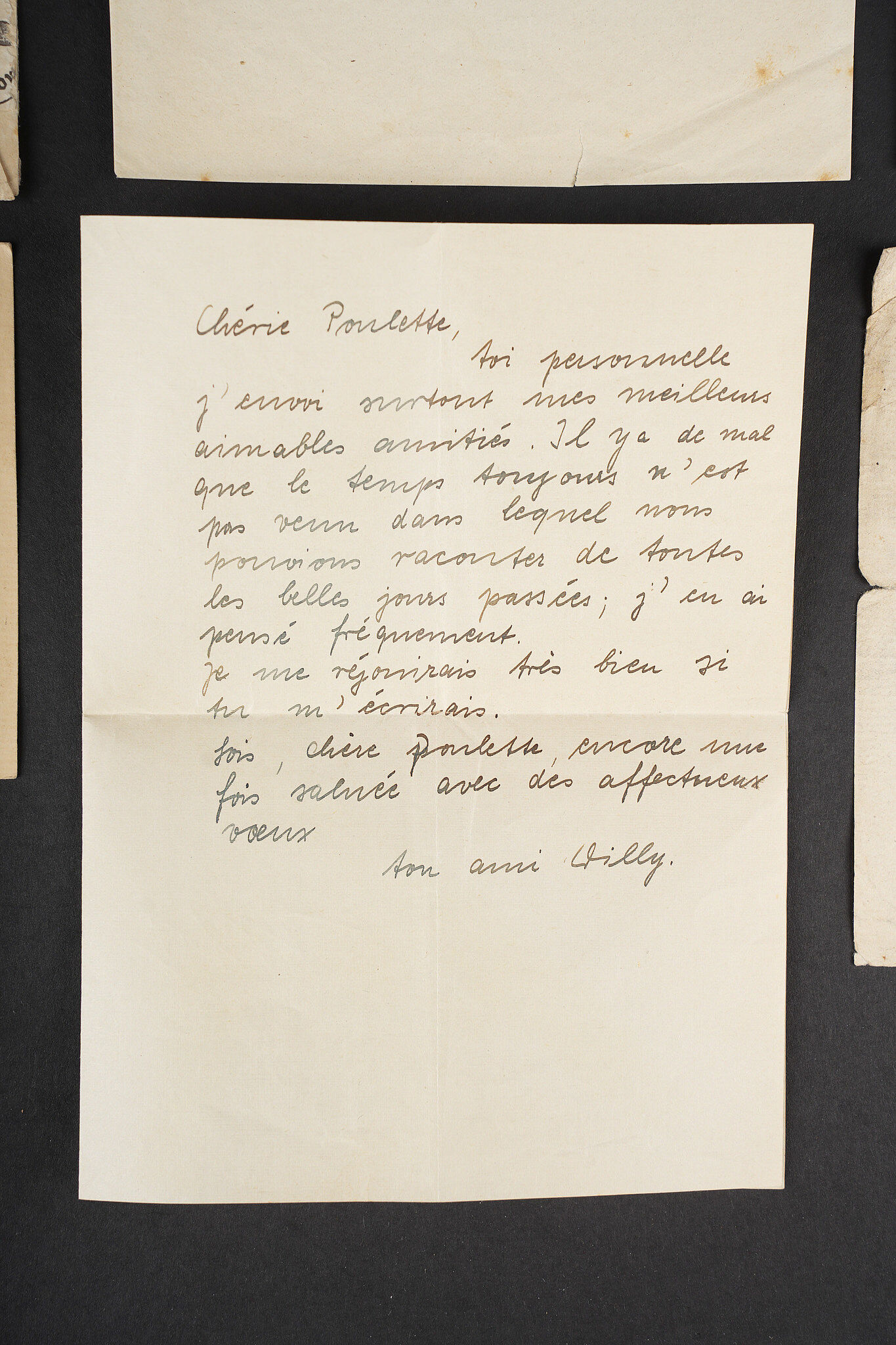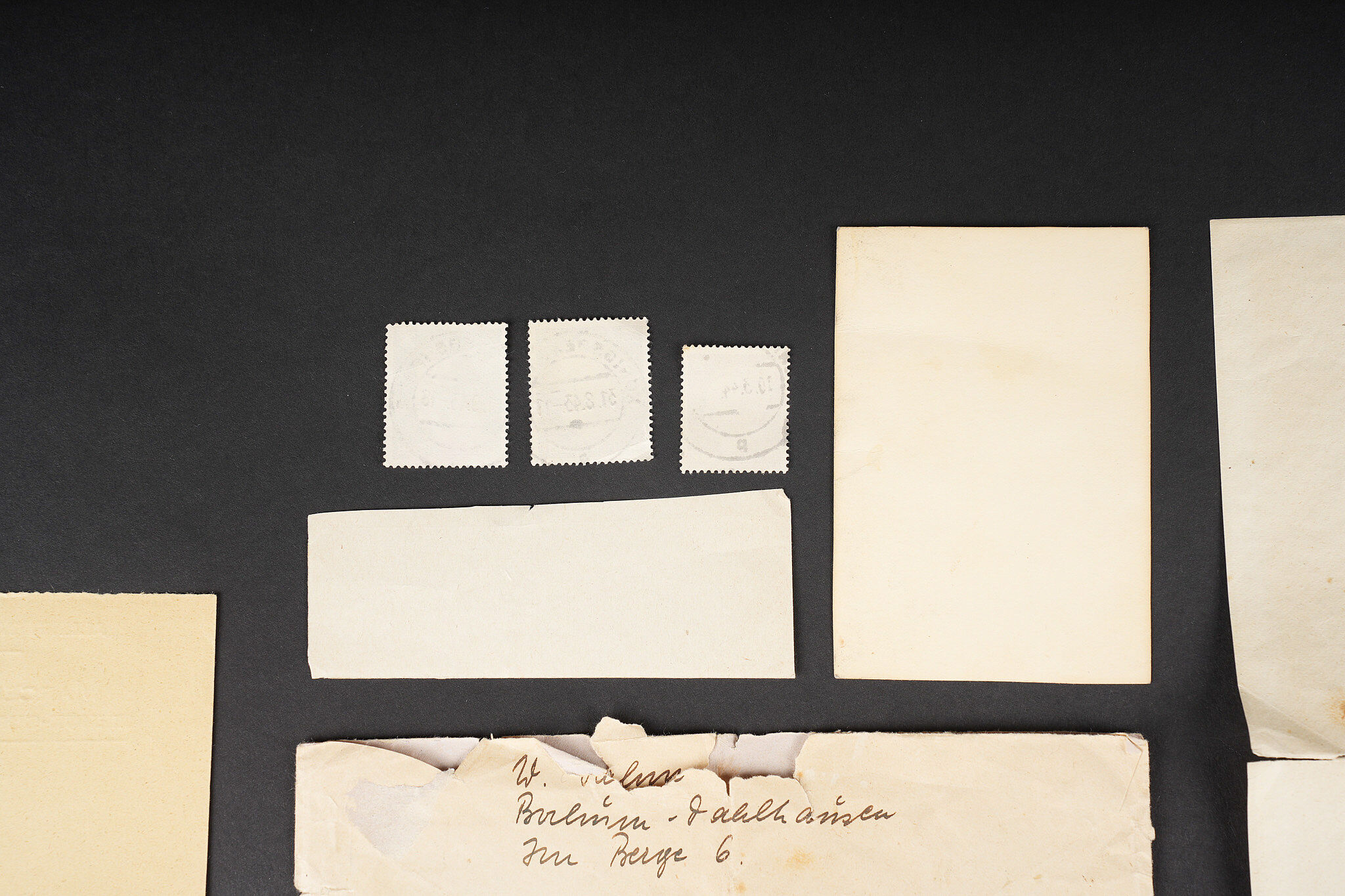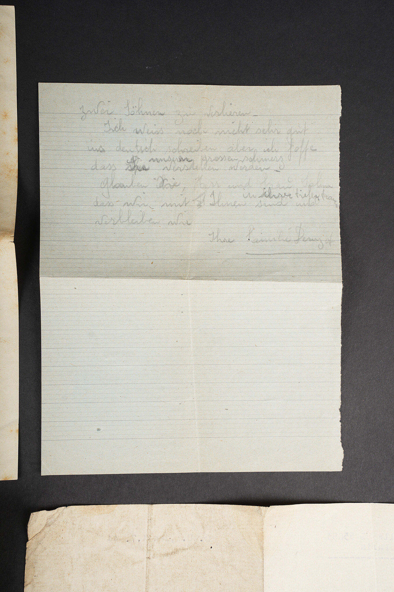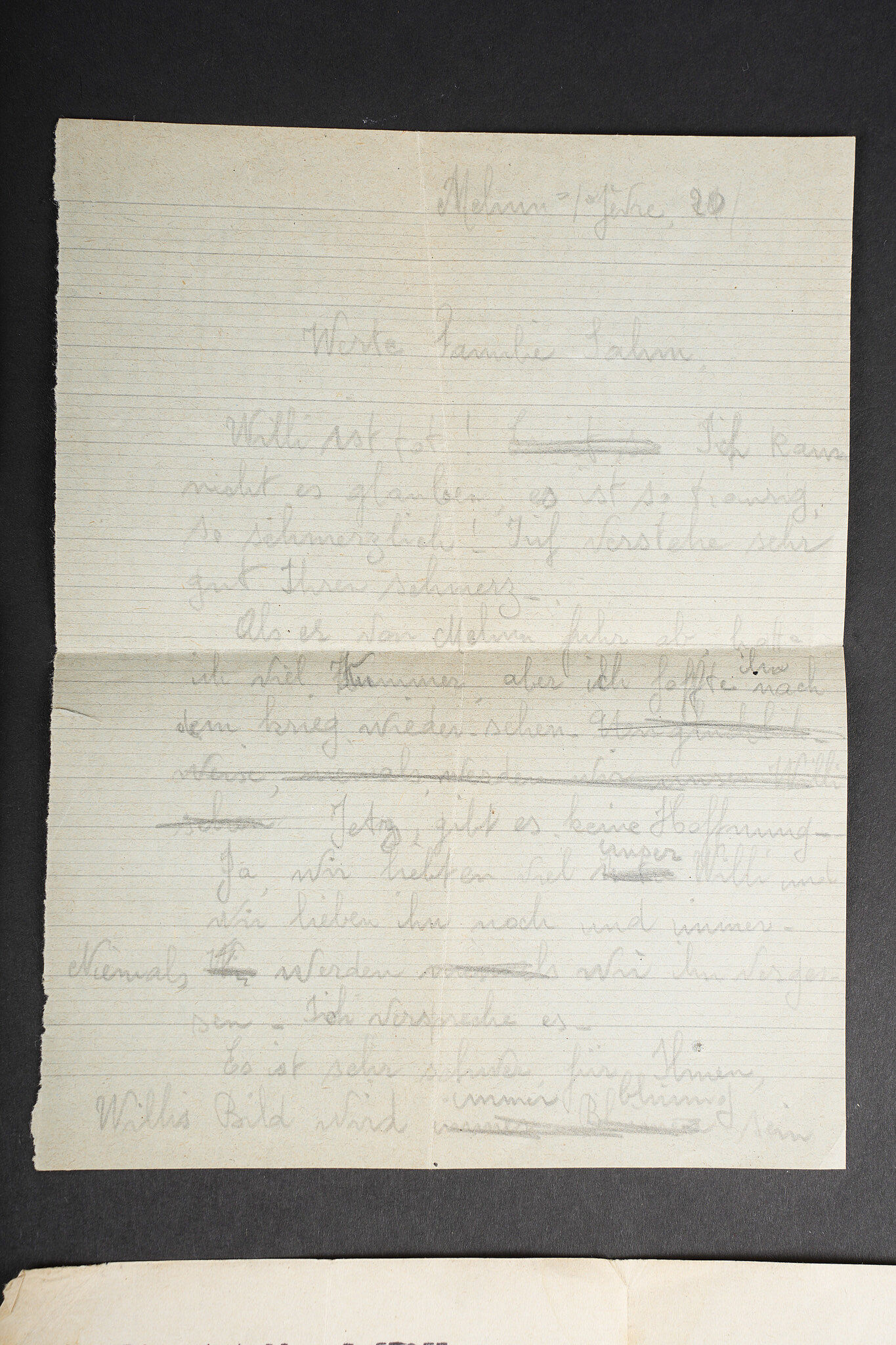 Correspondance entre un Soldat Allemand et une Française. Bel ensemble de document comprenant une lettre envoyée en septembre 1942 par le soldat Allemand Willi Sahm , rédigée en Français et adressée à Marcelle M. Domiciliée à Mehun sur Yèvre dans le Cher. Une seconde lettre rédigée en allemand depuis Mehun sur Yèvre par madame D. Une photo de Willi Sahm en uniforme de la Wehrmacht. L’avis de décès de l’obergefreiter Willi Sahm en octobre 1943 sur le Front de l’est. Une lettre tapuscrit envoyée par la famille Sahm en 1943 à la famille D. Un certificat de réquisition à propos d’un bureau de la Famille D. par la Wehrmacht. Une pub du magasin d’Alimentation Générale de la famille D. Portant le nom de Willi Sahm . L’ensemble des documents se trouve dans une enveloppe envoyée par le soldat Allemand Sahm à Marcelle M. Quelques pliures et déchirures. Correspondence between a German soldier and a French woman. Fine document group including a letter sent in September 1942 by the German soldier Willi Sahm written in French and addressed to Marcelle M. living in Mehun-sur-Yèvre in the Cher. A second letter in German from Mehun-sur-Yèvre by Mrs D. A photograph of Willi Sahm in Wehrmacht uniform. Death notice of Obergefreiter Willi Sahm in October 1943 on the Eastern Front. A typed letter sent in 1943 by the Sahm family to the D. family. A Wehrmacht requisition certificate concerning a desk belonging to the D. family. An advertising leaflet from the D. family grocery bearing the name of Willi Sahm. The whole kept in the envelope sent by Sahm to Marcelle M. Some folds and tears.