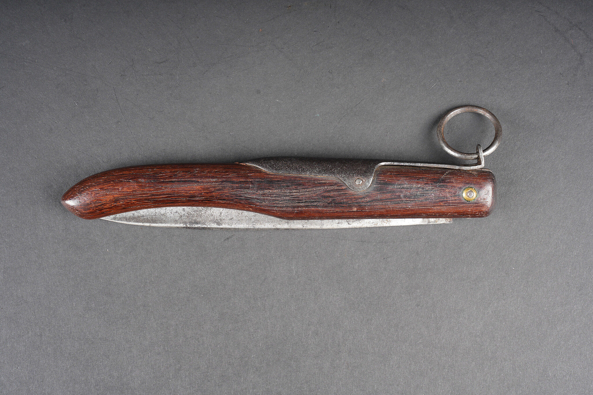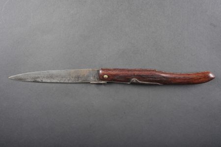 Couteau à cran d’arrêt. Cran bien fonctionne, lame en bon état sans marquage fabricant. Longueur totale 33cm. Ce type de couteau a notamment été commandé par l’état major en 1915 et utilisé par les corps francs. Clasp knife. Locking mechanism in good working order blade in good condition without maker mark. Overall length 33 centimetres. This type of knife was ordered by headquarters in 1915 and used by shock troops.