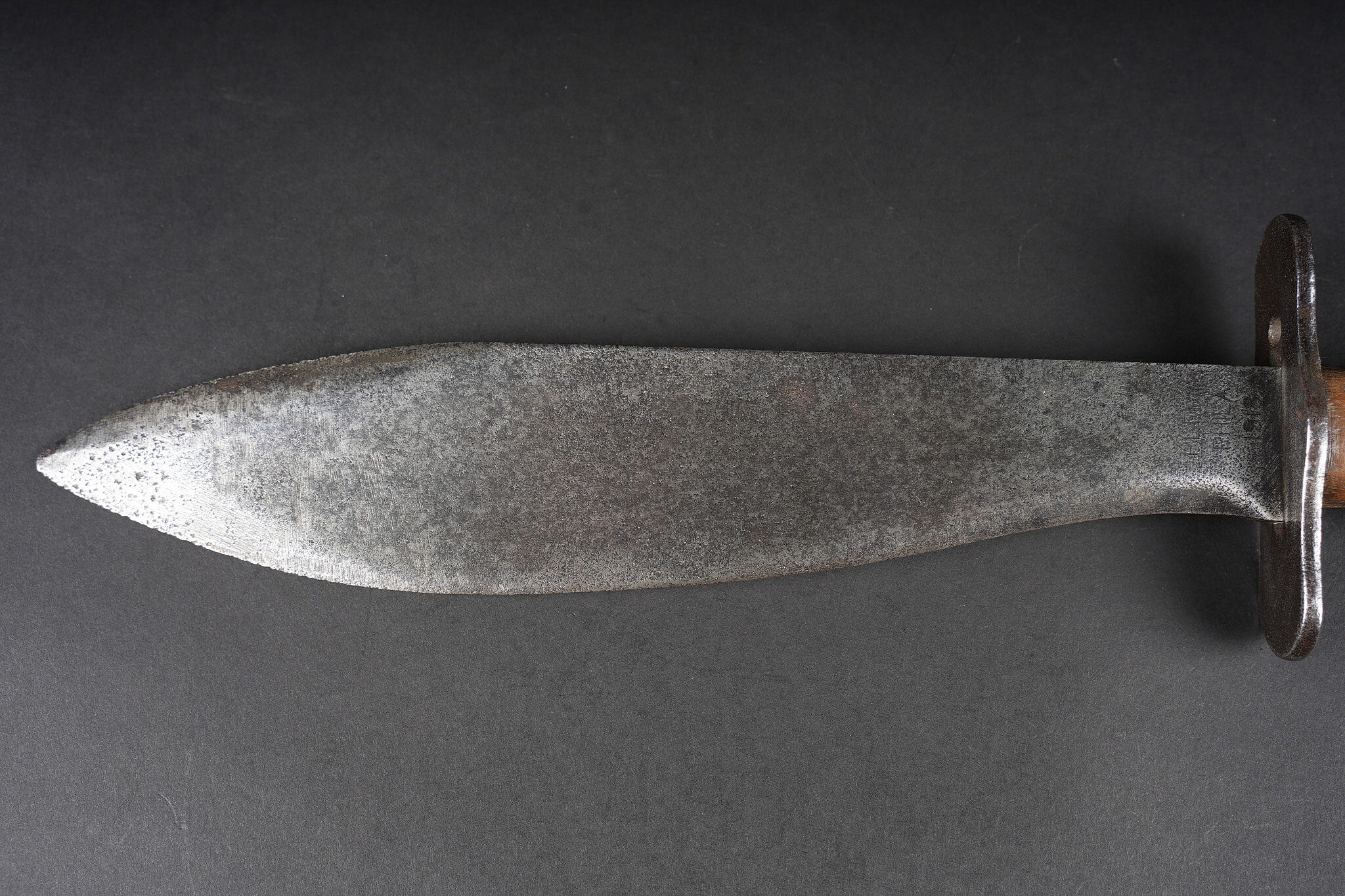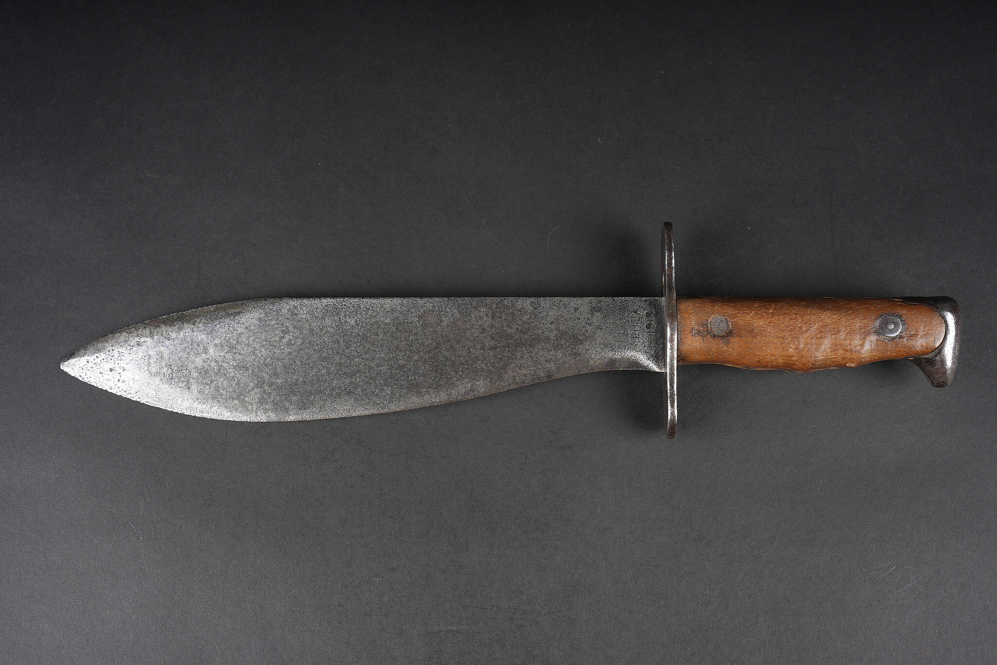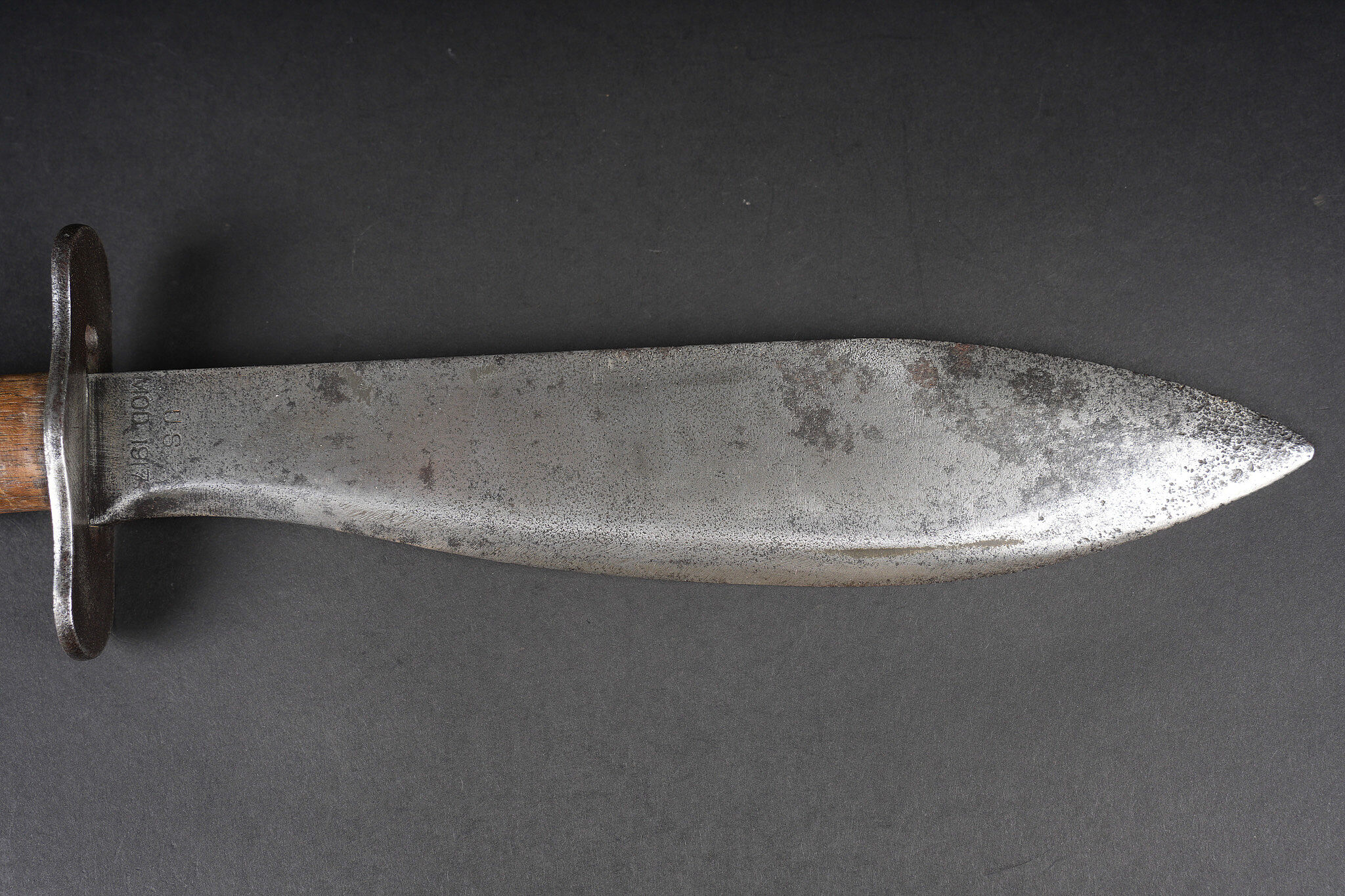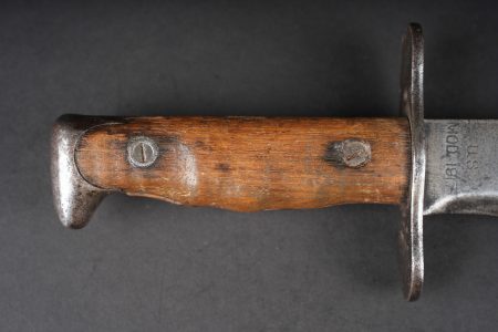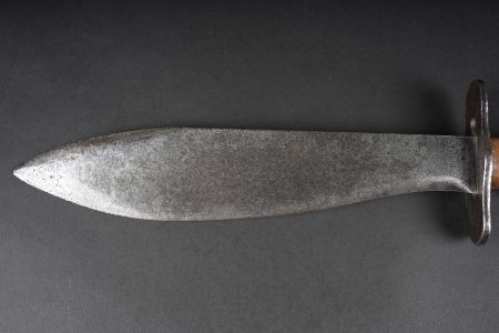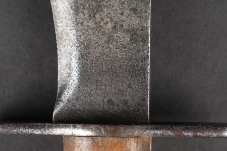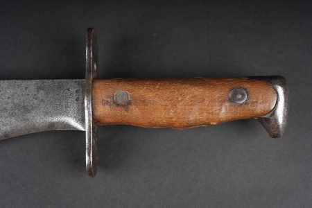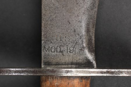 Couteau Bolo US. Poignée composée de deux plaquettes en bois, garde en fer présentant des traces de nettoyage. Lame dans sa longueur d’origine portant le marquage US Mod 1917 Phila 1918. US Bolo knife. Handle with two wooden grip scales, iron guard showing cleaning traces. Blade in its full original length stamped US Mod 1917 Phila 1918.