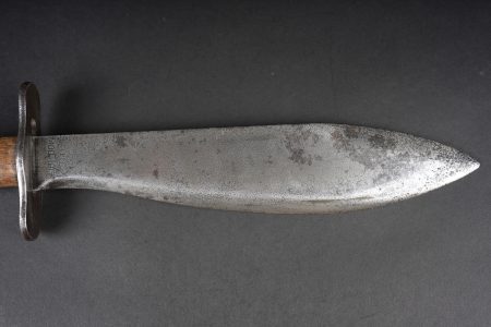 Détails de la vente >Couteau Bolo US. Poignée composée de deux plaquettes en bois, garde en fer présentant des traces de nettoyage. Lame dans sa longueur d’origine portant le marquage US Mod 1917 Phila 1918.... en savoir plus