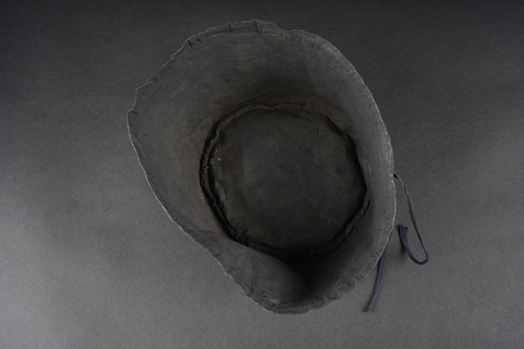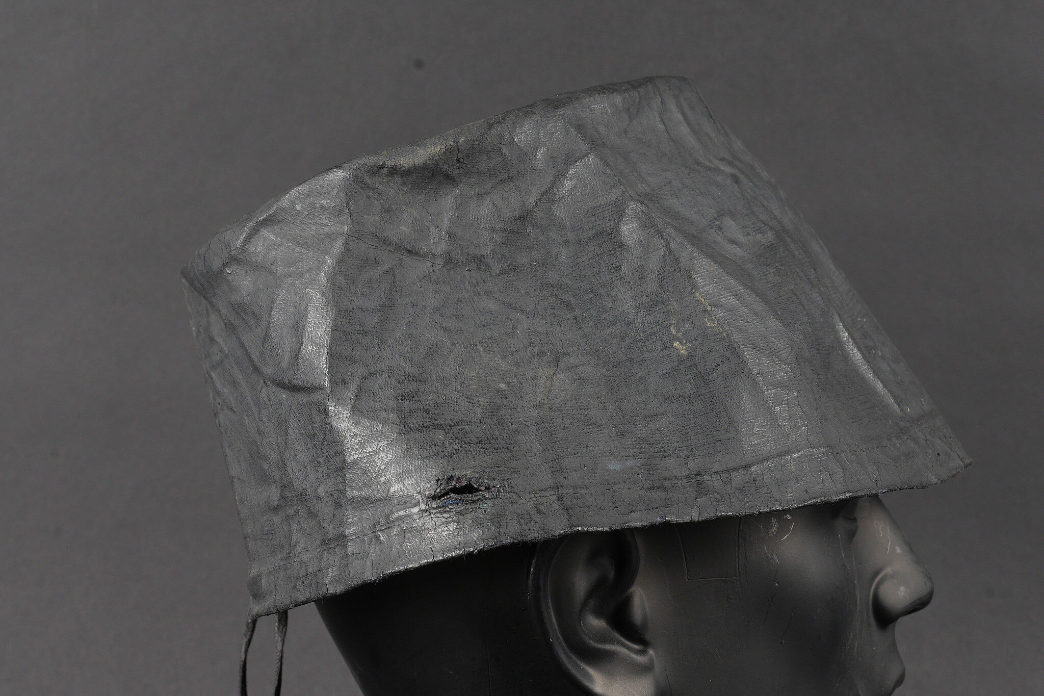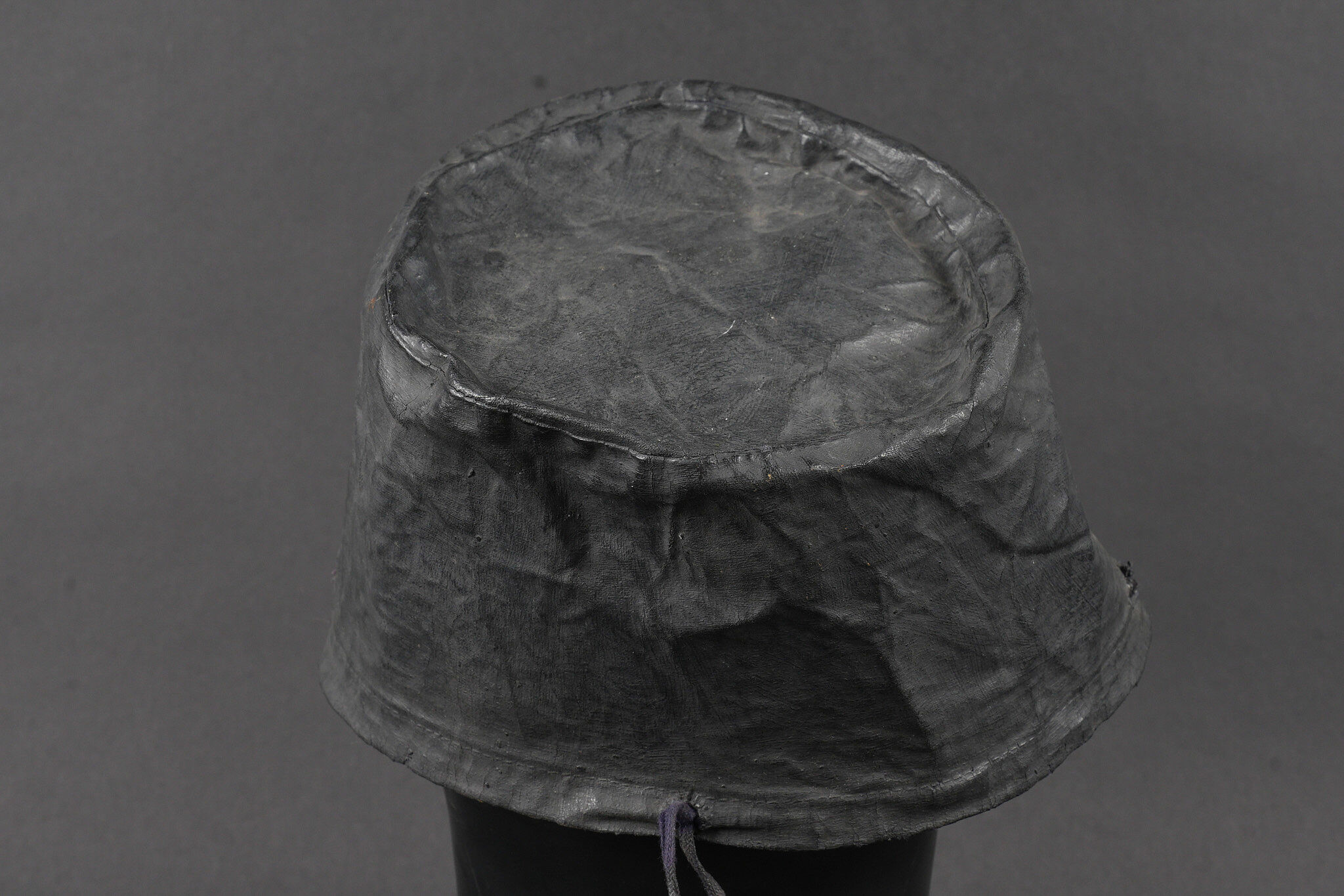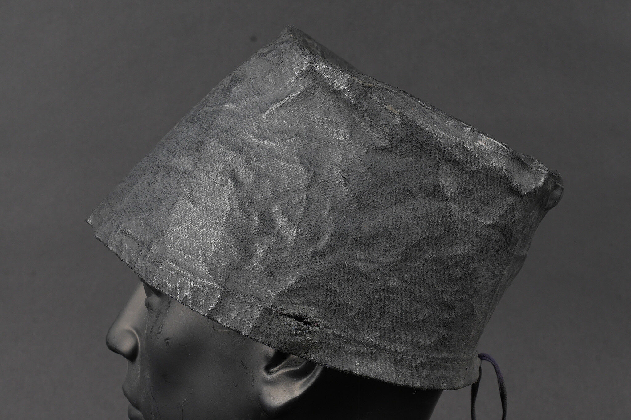 Couvre képi 1873. En toile cirée noire, deux boutonnière et un cordon de serrage en coton gris de fer bleuté. Hauteur à l’arrière 13cm. Kepi cover Model 1873 in black oilcloth, with two buttonholes and a bluish iron-grey cotton drawstring. Rear height 13 cm.