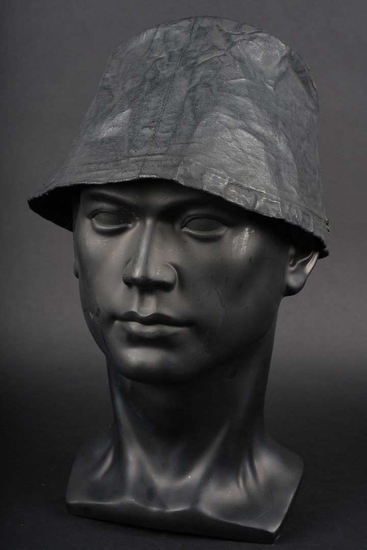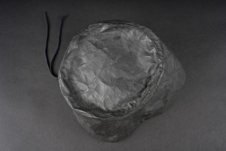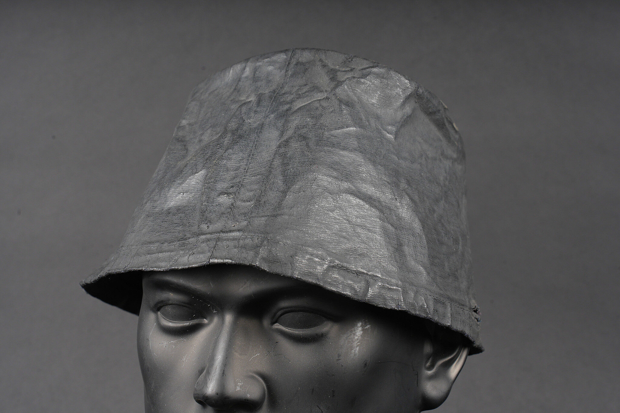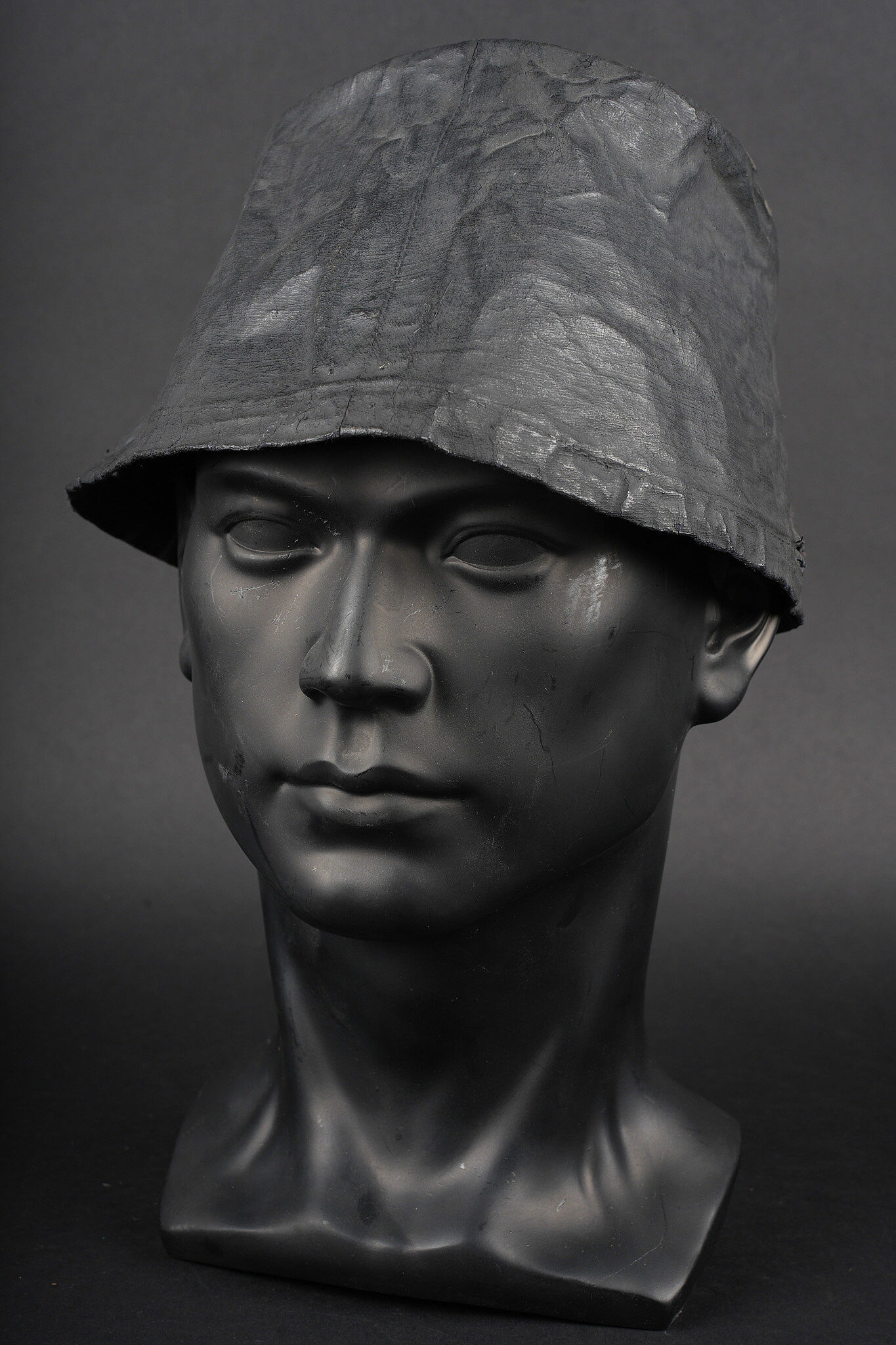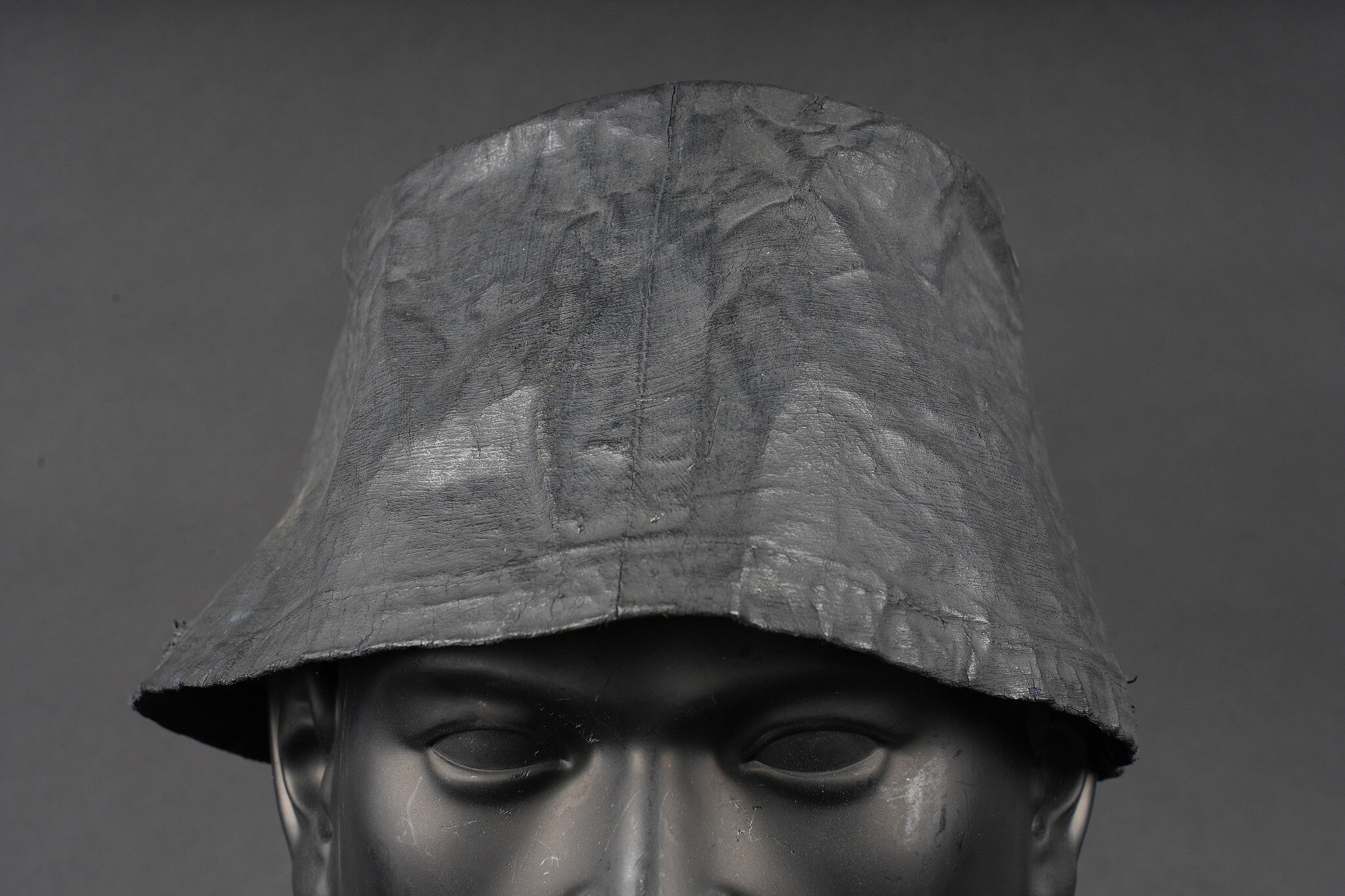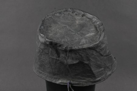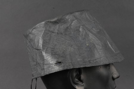 Couvre képi 1873. En toile cirée noire, deux boutonnière et un cordon de serrage en coton gris de fer bleuté. Hauteur à l’arrière 13cm. Kepi cover Model 1873 in black oilcloth, with two buttonholes and a bluish iron-grey cotton drawstring. Rear height 13 cm.