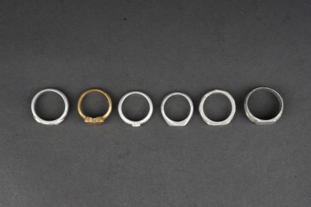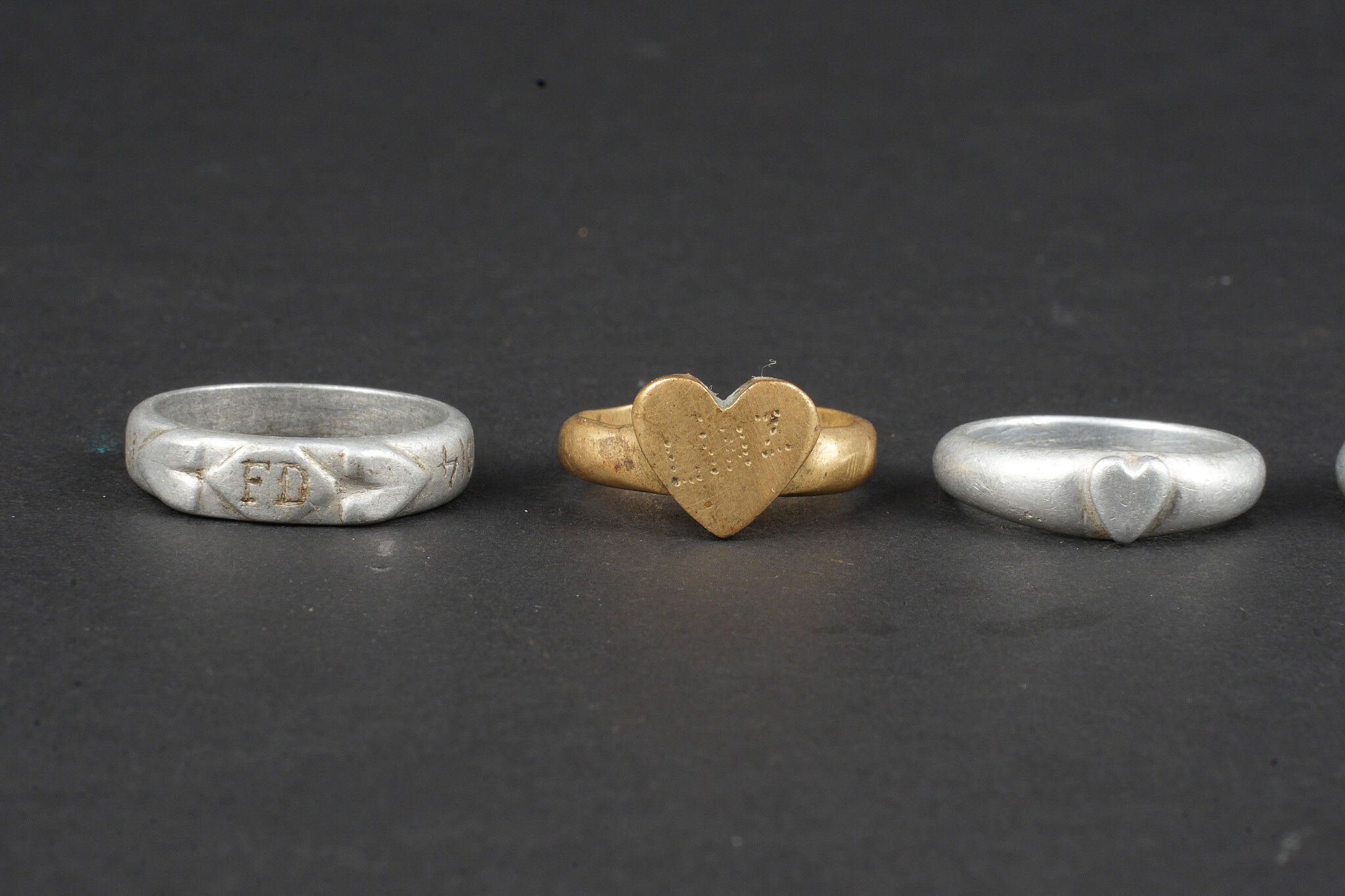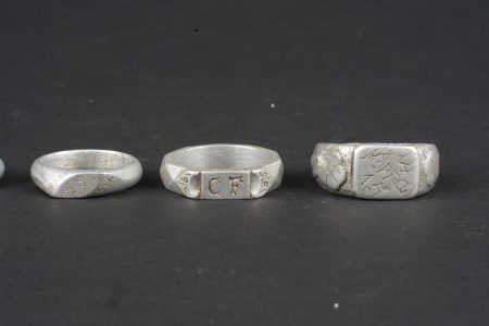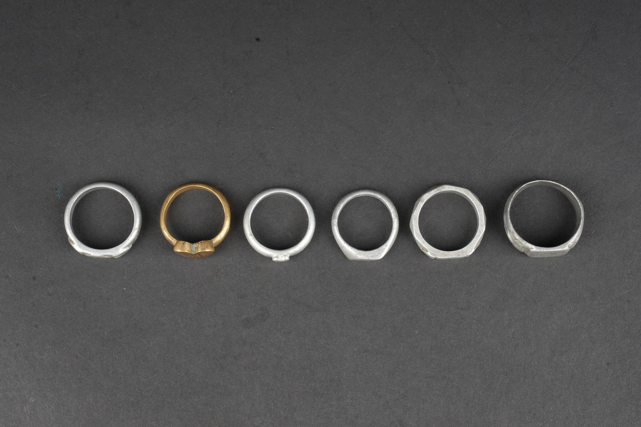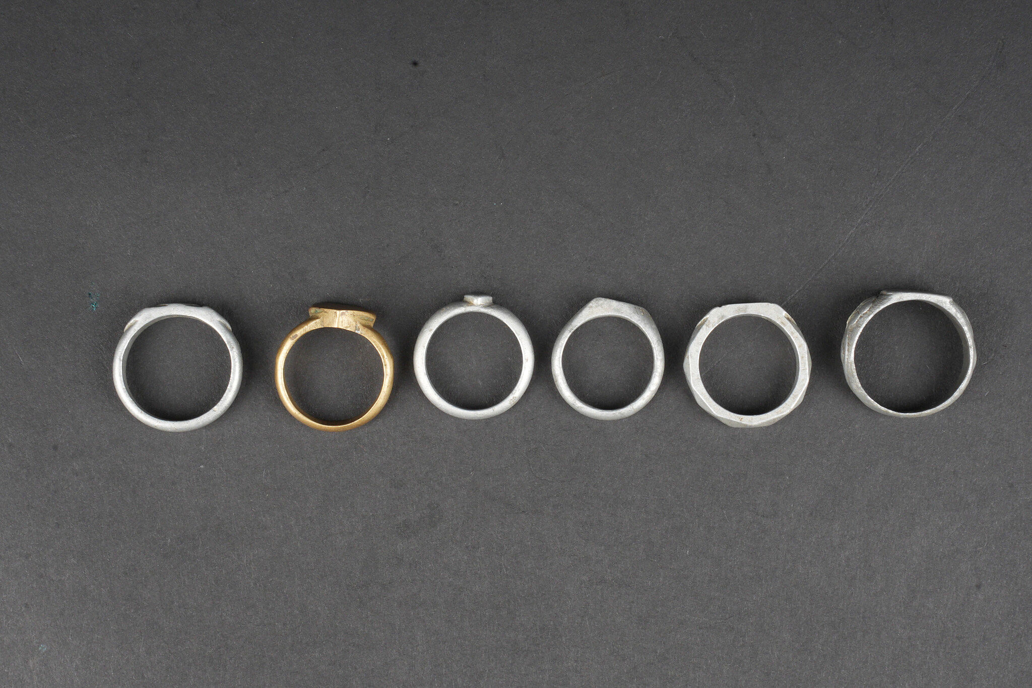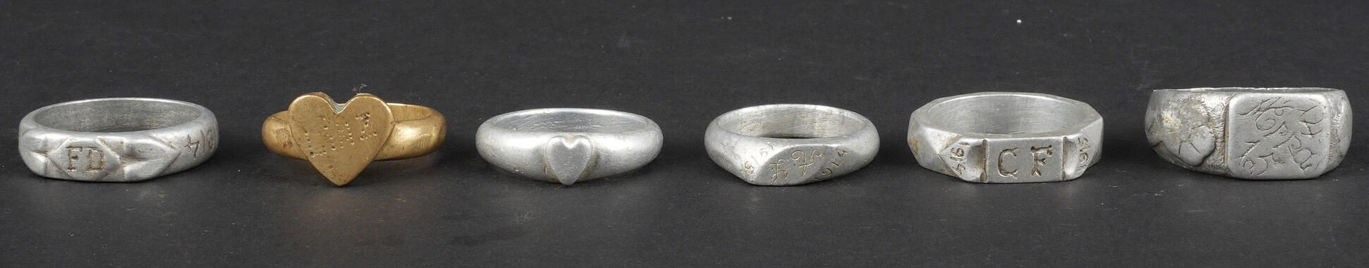 Ensemble de 6 bagues artisanat de tranchée. 5 en aluminium, 1 en laiton, certaines avec initiales ou nom, 4 d’entre elles comportent des dates 1914 et/ou 1915. Usure d’usage. Set of six trench art rings Comprising five aluminium examples and one brass example, several engraved with initials or names, four of them dated 1914 and/or 1915. Showing normal service wear.