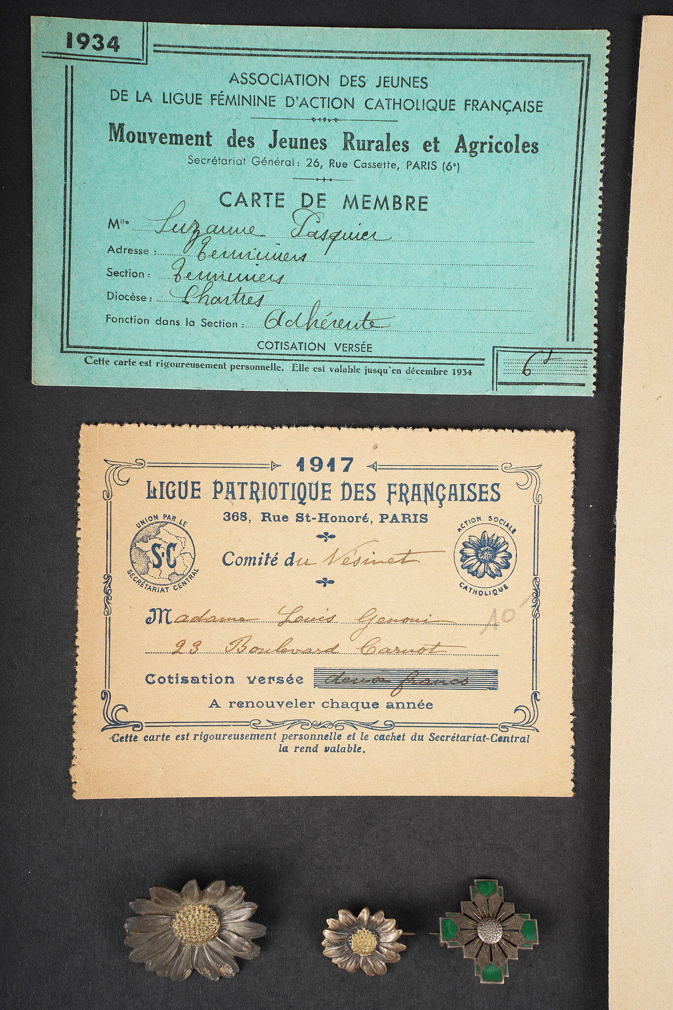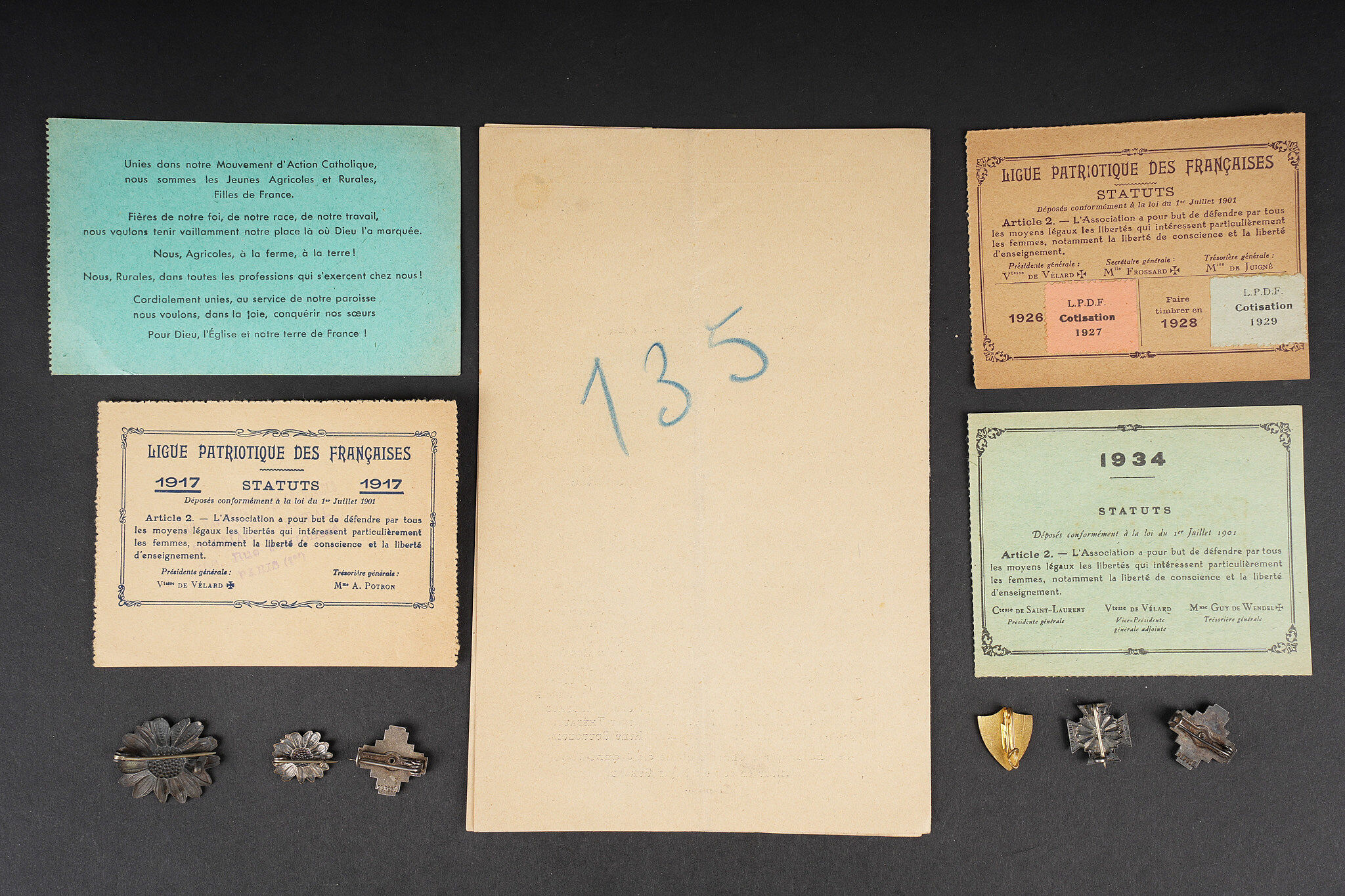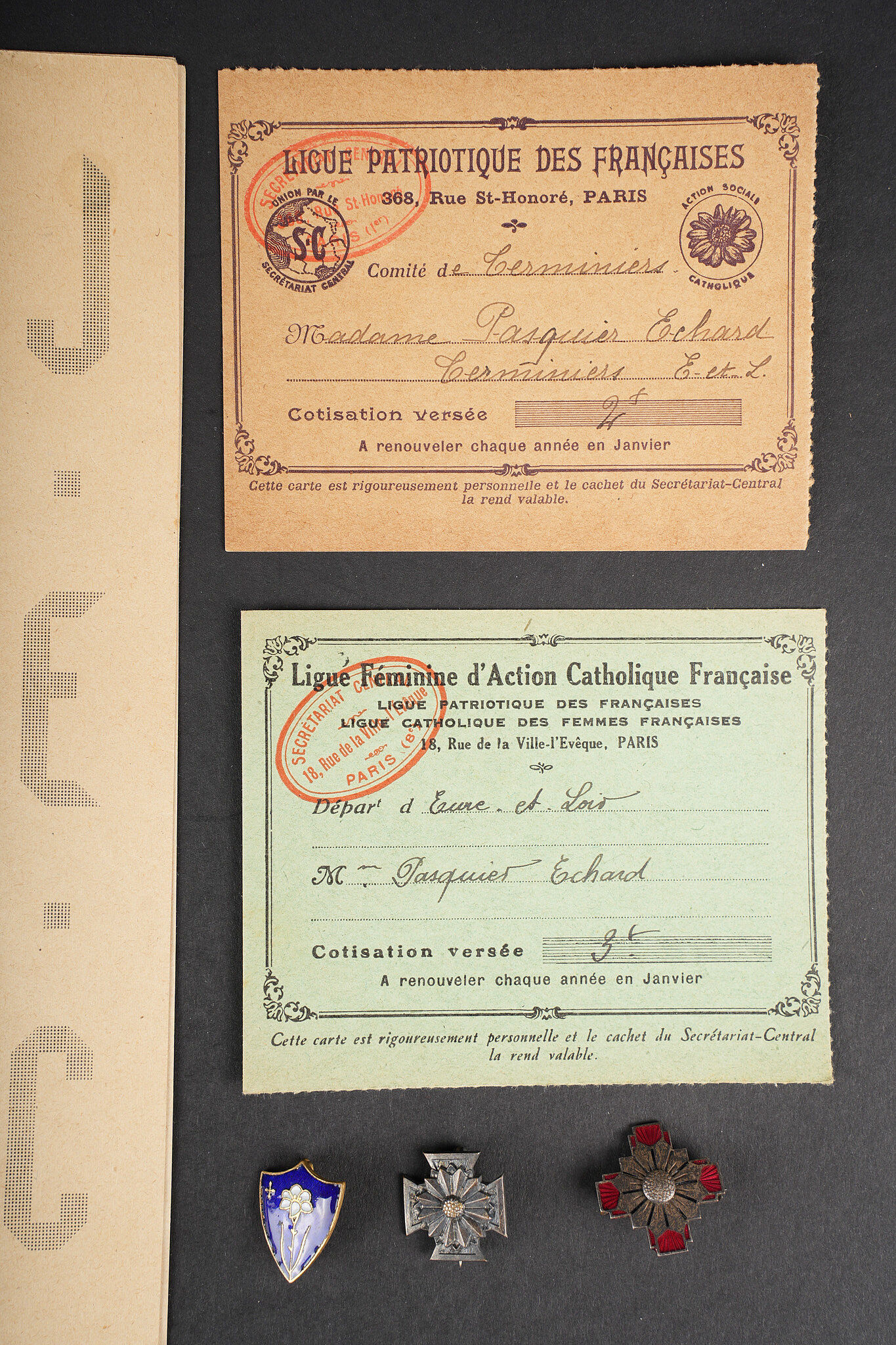 Ensemble de cartes Ligues Féminines et Patriotiques. Ensemble comprenant une carte de la Ligue Patriotique des Françaises pour l’année 1917. Une carte d’adhérente à la Ligue Patriotique des Françaises du comité de Terminiers pour les années 1926 à 1929. Une carte de la Ligue Féminine d’Action Catholique Française du département d’Eure et Loir pour l’année 1934. Une carte de l’association des Jeunes de la Ligue Féminine d’Action Catholique Française et du Mouvement des jeunes Rurales et Agricoles, section Terminiers, pour l’année 1934. On y joint 6 insignes dont 2 insignes en métal émaillé des Ligues Patriotiques féminines. On y joint un programme des JEC du dimanche 27 Février 1944. Feminine and patriotic leagues membership cards grouping. Comprising a Ligue Patriotique des Françaises card for 1917. A membership card of the Ligue Patriotique des Françaises of the Terminiers committee for the years 1926 to 1929. A Ligue Féminine d’Action Catholique Française card for the Eure et Loir department for 1934. A card of the Jeunes de la Ligue Féminine d’Action Catholique Française and the Mouvement des Jeunes Rurales et Agricoles section Terminiers for 1934. Included are six badges including two enamelled metal badges of the patriotic women’s leagues and a JEC programme for Sunday 27 February 1944.