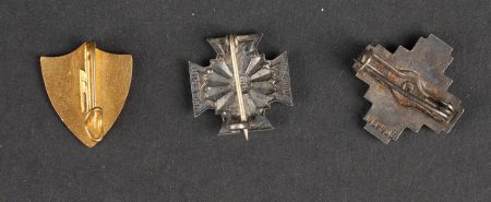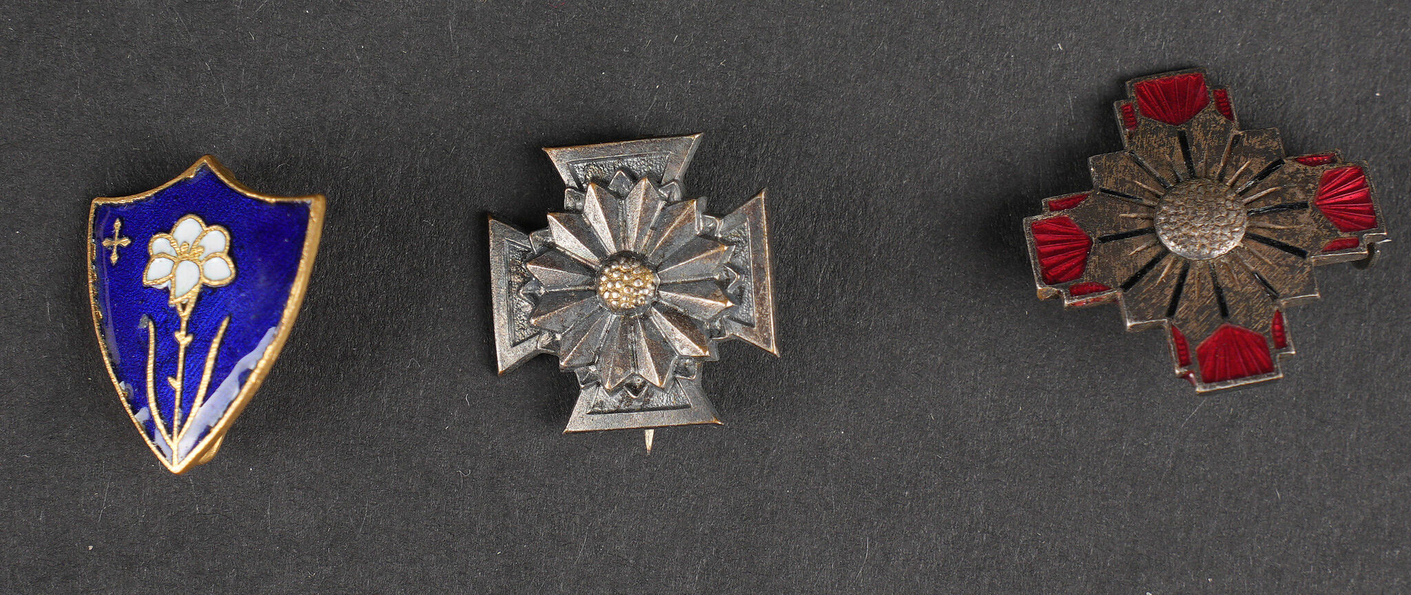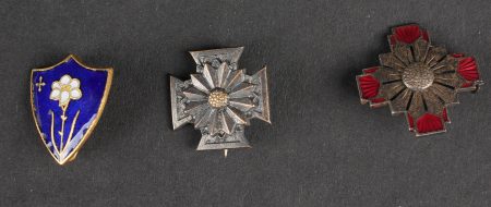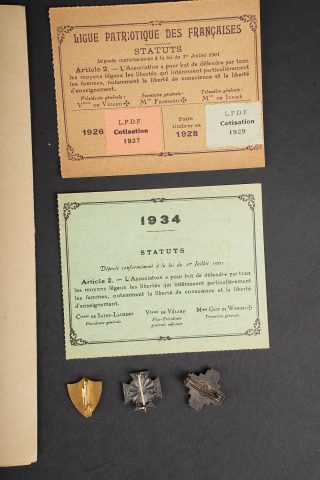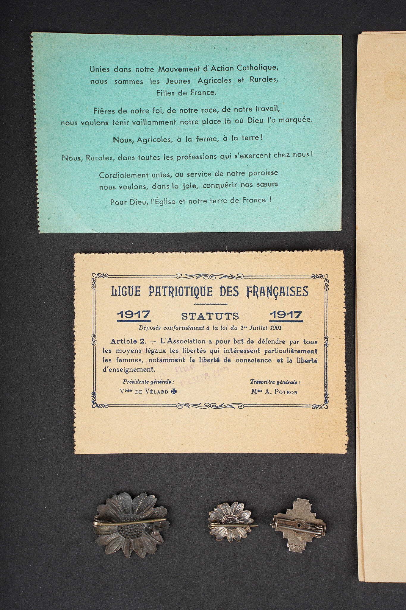 Ensemble de cartes Ligues Féminines et Patriotiques. Ensemble comprenant une carte de la Ligue Patriotique des Françaises pour l’année 1917. Une carte d’adhérente à la Ligue Patriotique des Françaises du comité de Terminiers pour les années 1926 à 1929. Une carte de la Ligue Féminine d’Action Catholique Française du département d’Eure et Loir pour l’année 1934. Une carte de l’association des Jeunes de la Ligue Féminine d’Action Catholique Française et du Mouvement des jeunes Rurales et Agricoles, section Terminiers, pour l’année 1934. On y joint 6 insignes dont 2 insignes en métal émaillé des Ligues Patriotiques féminines. On y joint un programme des JEC du dimanche 27 Février 1944. Feminine and patriotic leagues membership cards grouping. Comprising a Ligue Patriotique des Françaises card for 1917. A membership card of the Ligue Patriotique des Françaises of the Terminiers committee for the years 1926 to 1929. A Ligue Féminine d’Action Catholique Française card for the Eure et Loir department for 1934. A card of the Jeunes de la Ligue Féminine d’Action Catholique Française and the Mouvement des Jeunes Rurales et Agricoles section Terminiers for 1934. Included are six badges including two enamelled metal badges of the patriotic women’s leagues and a JEC programme for Sunday 27 February 1944.