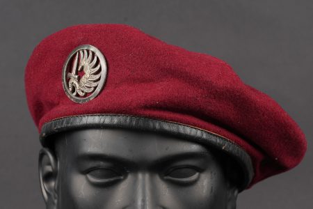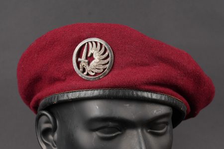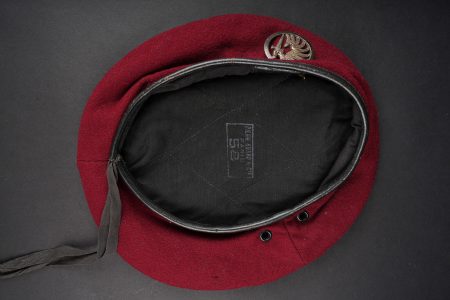 Ensemble de coiffures parachutistes. Comprenant un béret commando modèle 1946 réalisé en trois parties en laine amarante. Deux œillets en peinture d’origine. Doublure en coton noir... en savoir plus