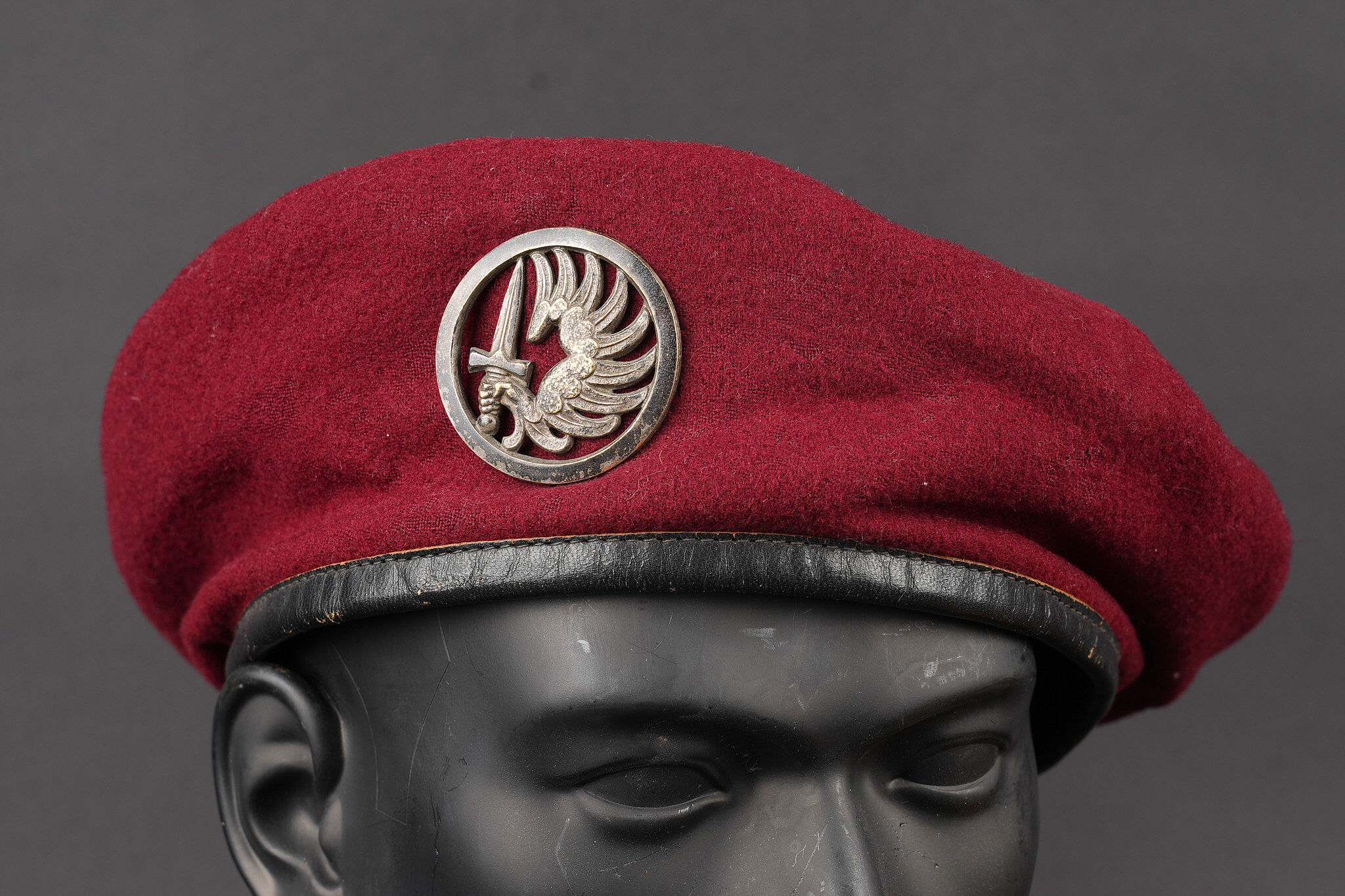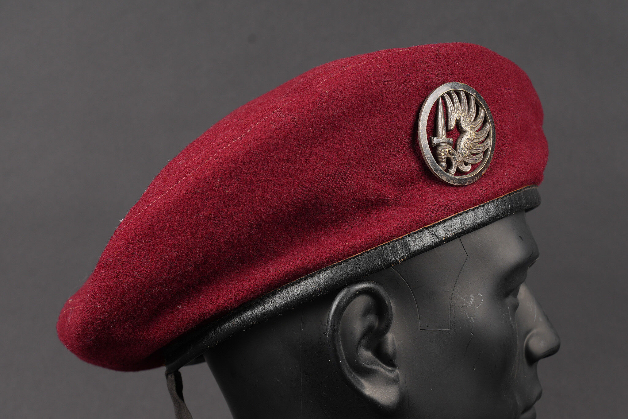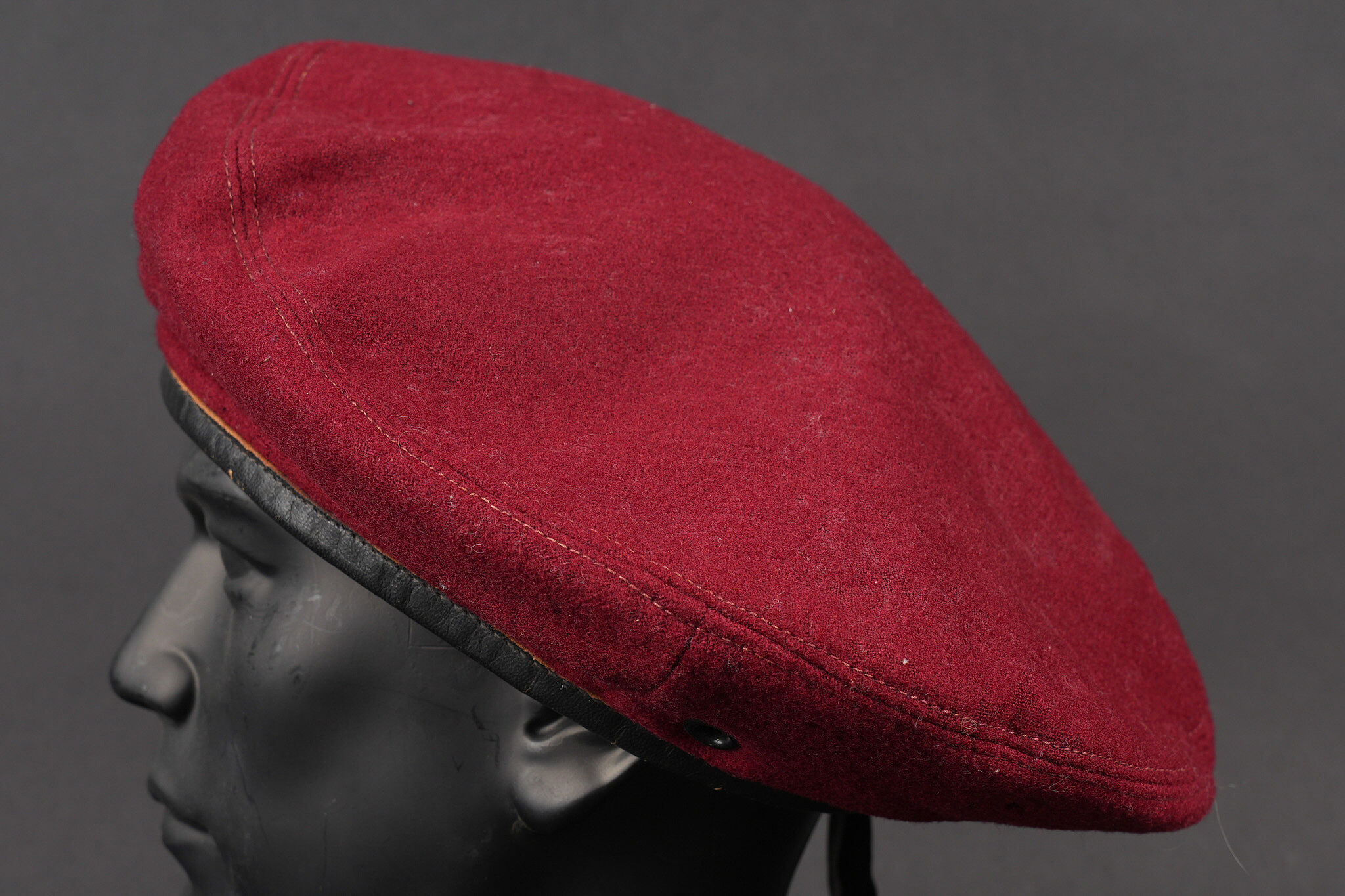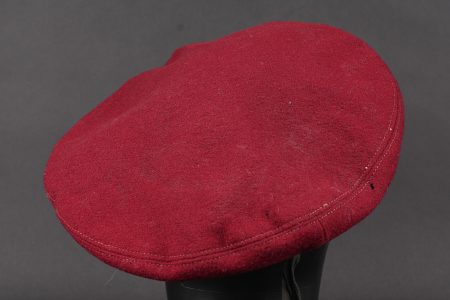 Détails de la vente >Ensemble de coiffures parachutistes. Comprenant un béret commando modèle 1946 réalisé en trois parties en laine amarante. Deux œillets en peinture d’origine. Doublure en coton noir... en savoir plus