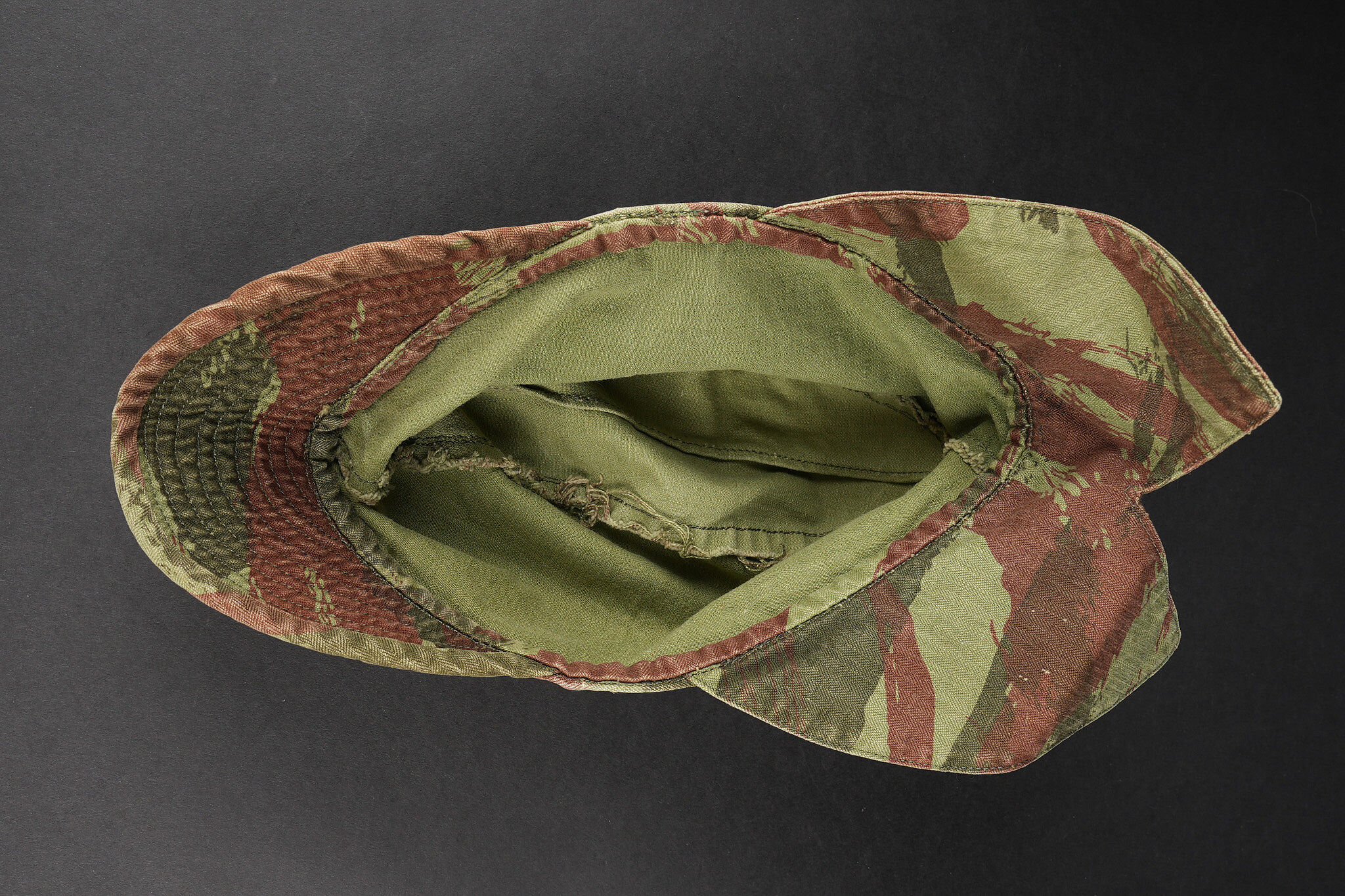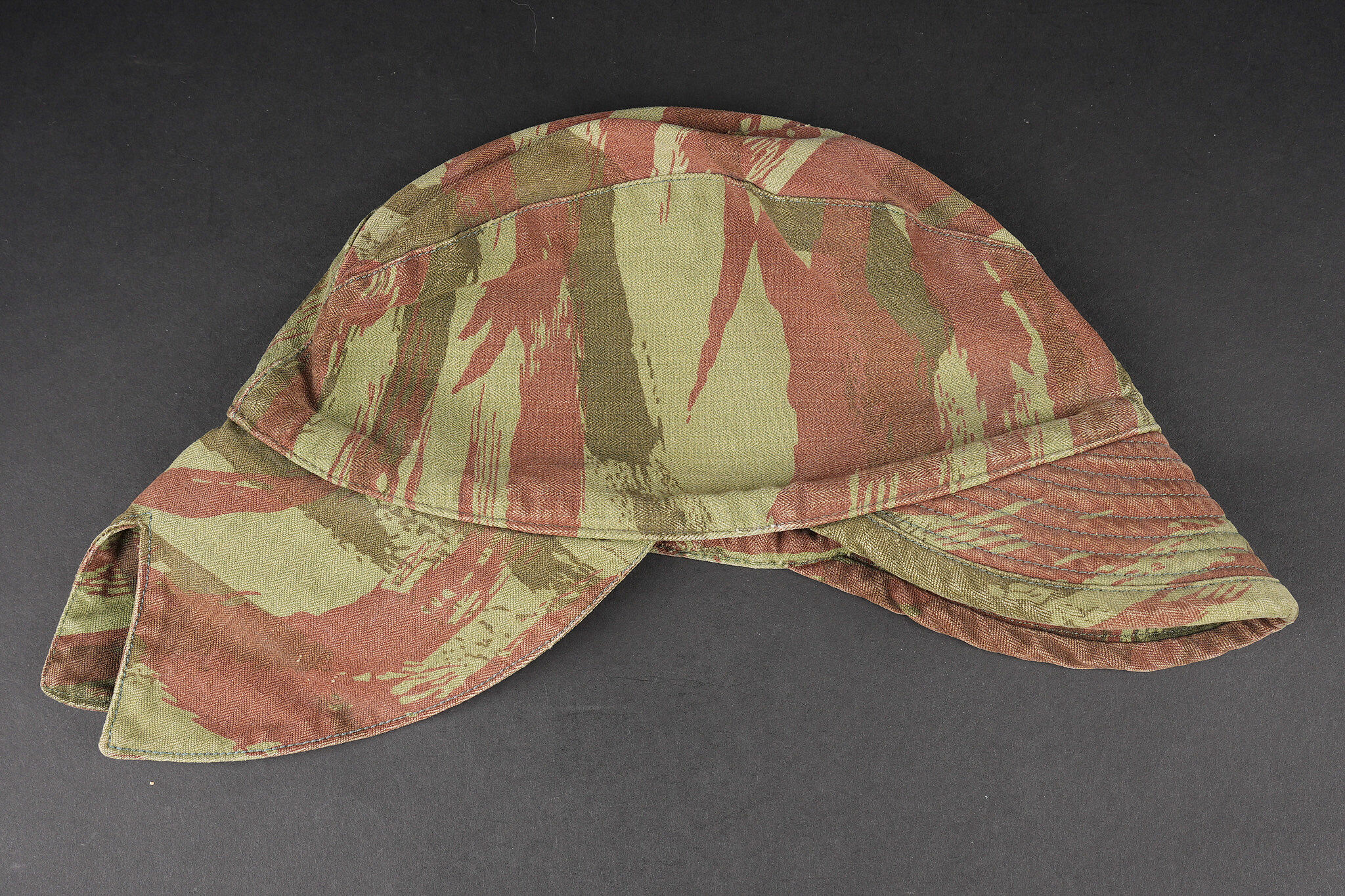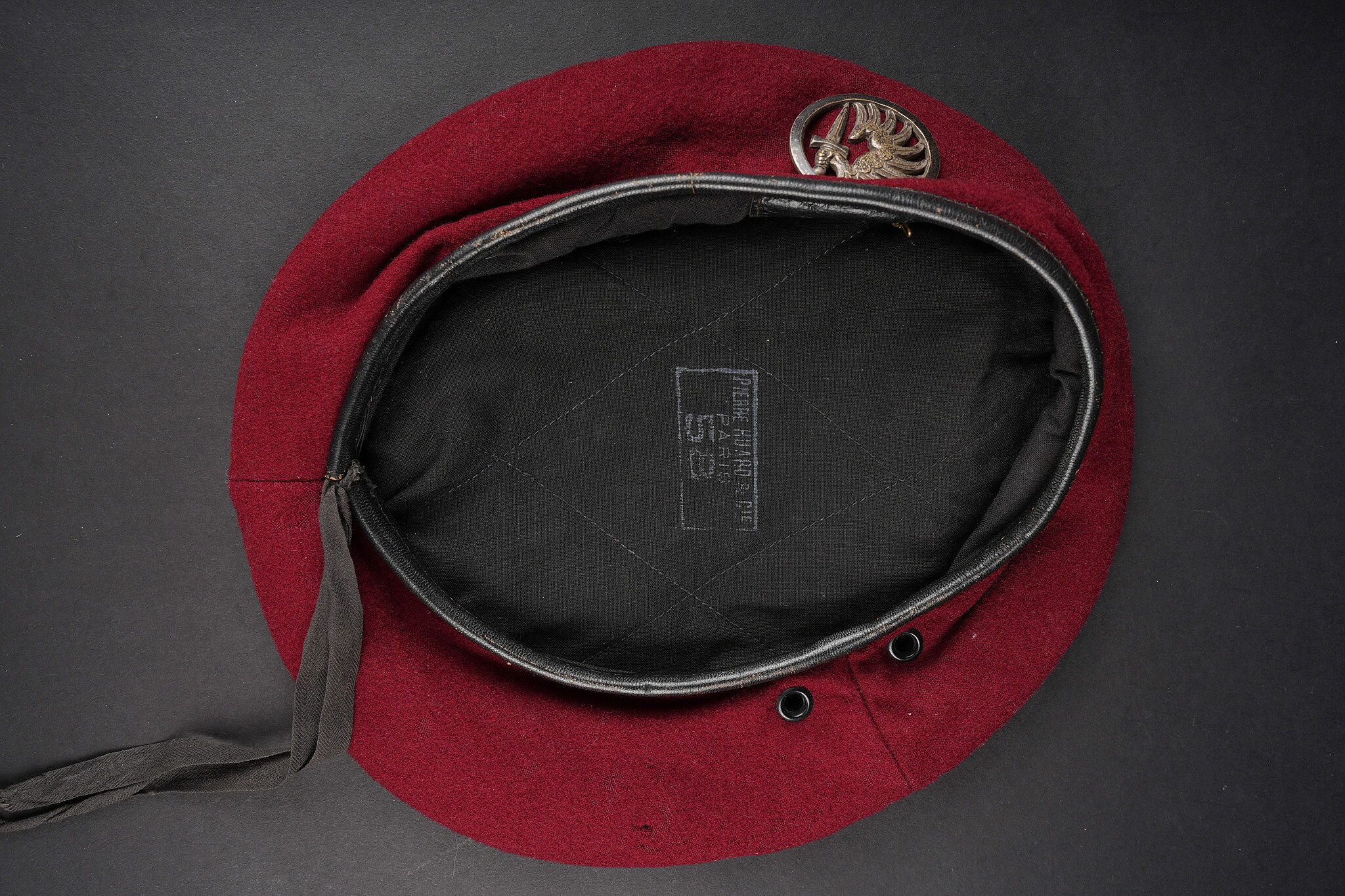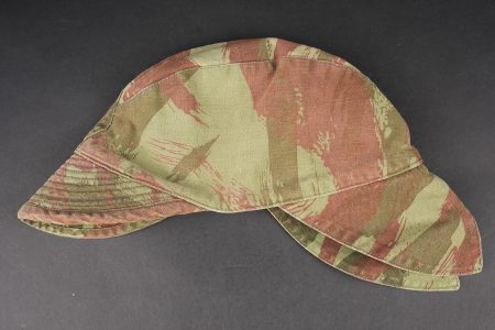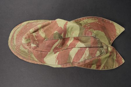 Ensemble de coiffures parachutistes. Comprenant un béret commando modèle 1946 réalisé en trois parties en laine amarante. Deux œillets en peinture d’origine. Doublure en coton noir surpiqué en losange portant le marquage fabricant Huard ainsi que la taille 58. Insigne de béret TAP de fabrication Drago Béranger, quelques trous de mites. Une casquette type Bigeard en tissu camouflé 47/56, tampon de fabricant présent mais illisible. On joint un foulard TAP camouflé. Set of paratrooper headdress. Comprising a Model 1946 commando beret made in three-piece amaranth wool. Two original painted eyelets. Black quilted cotton lining with Huard maker’s mark and size 58. Drago Béranger TAP beret badge, some moth damage. A Bigeard-type cap in 47/56 camouflage fabric with maker’s stamp present but illegible. A camouflage TAP scarf is included.