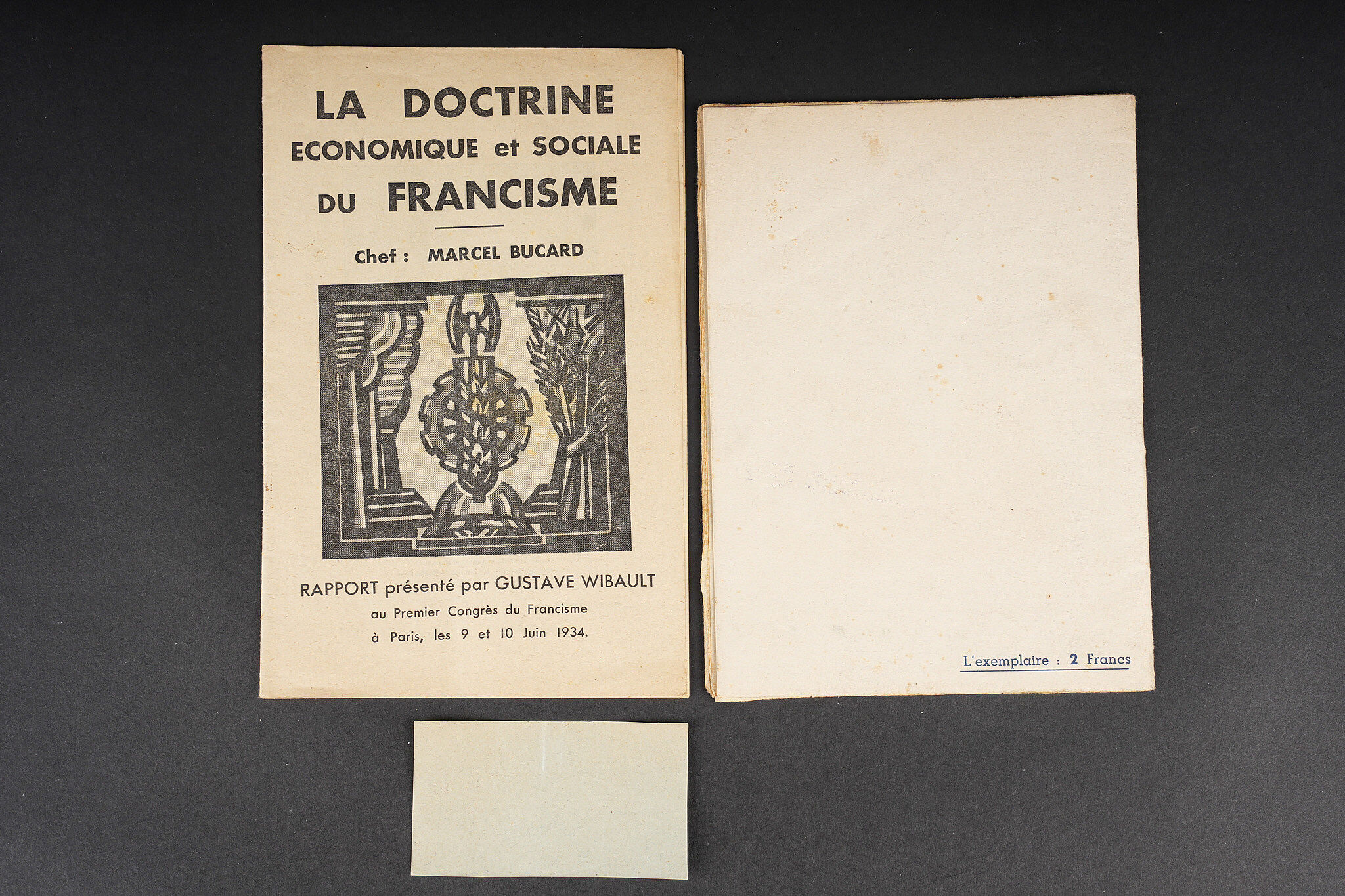 Ensemble de documents sur le Francisme. Ensemble comprenant La doctrine économique et sociale du Francisme, rapport présenté par Gustave Wibaut complet 15 pages. Un livret intitulé Vers un vrai Front populaire, Le franciste 27 boulevard des Italiens Paris tamponné sur la première page Cette brochure a été rédigée en Mai 1937 , complet 36 pages. Un tract papillon Oui il y a un fascisme en France c’est le Francisme. Group of documents relating to Francisme. Set including La doctrine économique et sociale du Francisme report by Gustave Wibaut complete with 15 pages. A booklet titled Vers un vrai Front populaire stamped Le Franciste 27 boulevard des Italiens Paris with the note This brochure was written in May 1937 complete with 36 pages. A leaflet Oui il y a un fascisme en France c’est le Francisme.