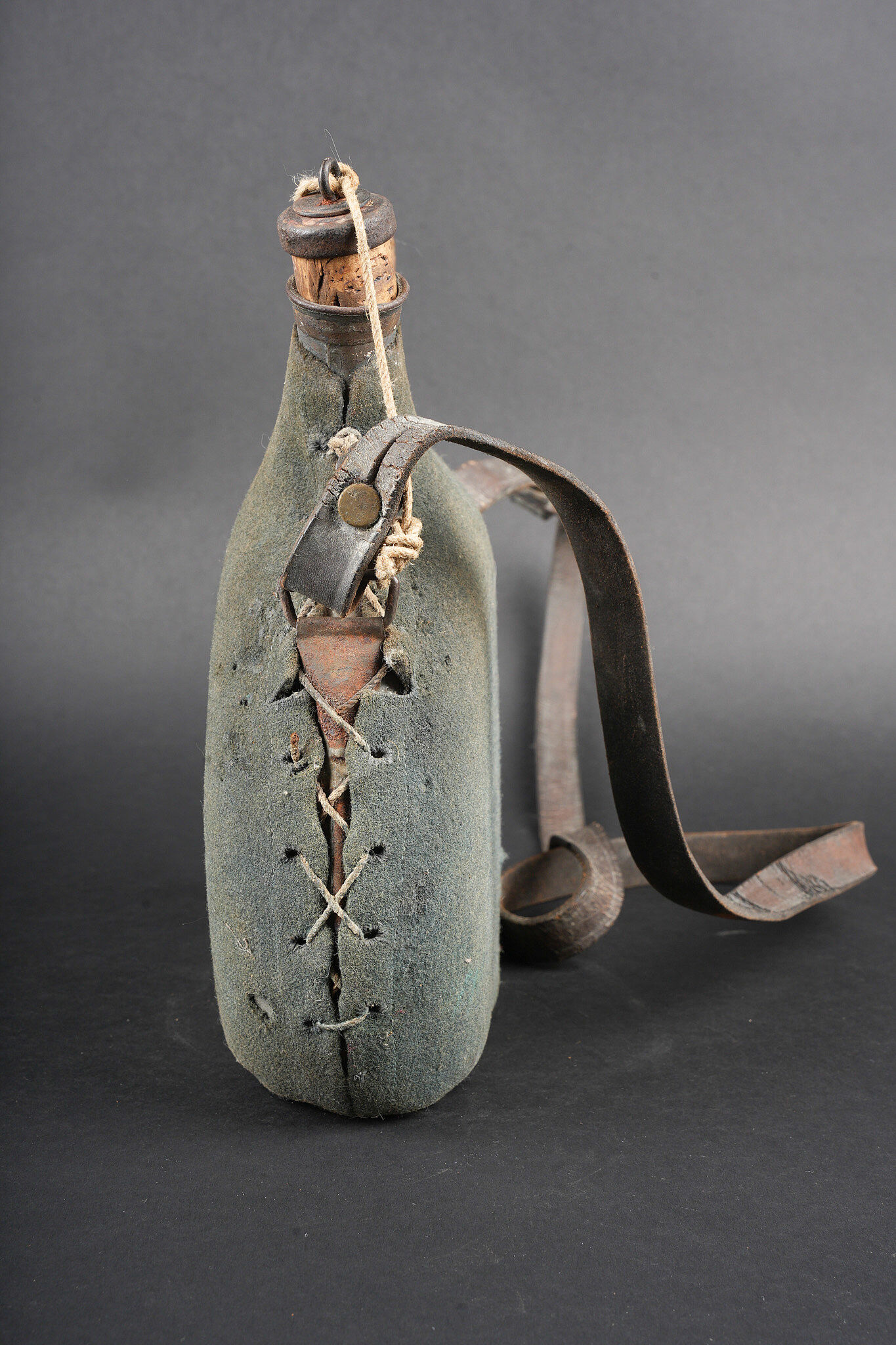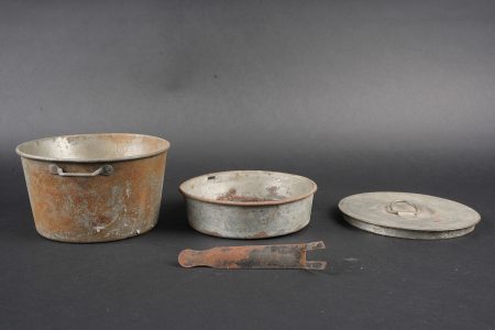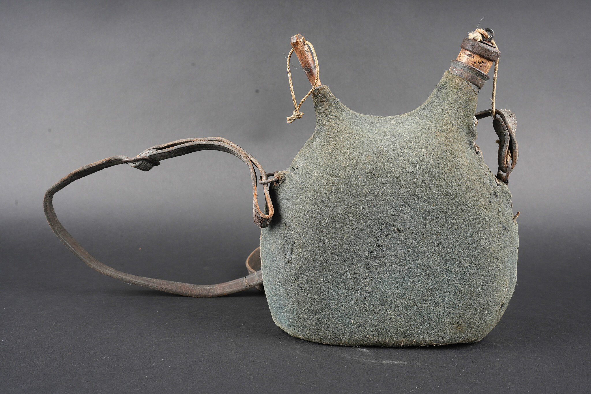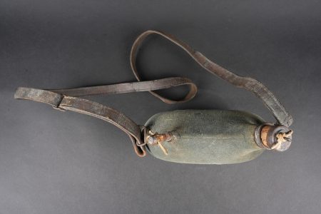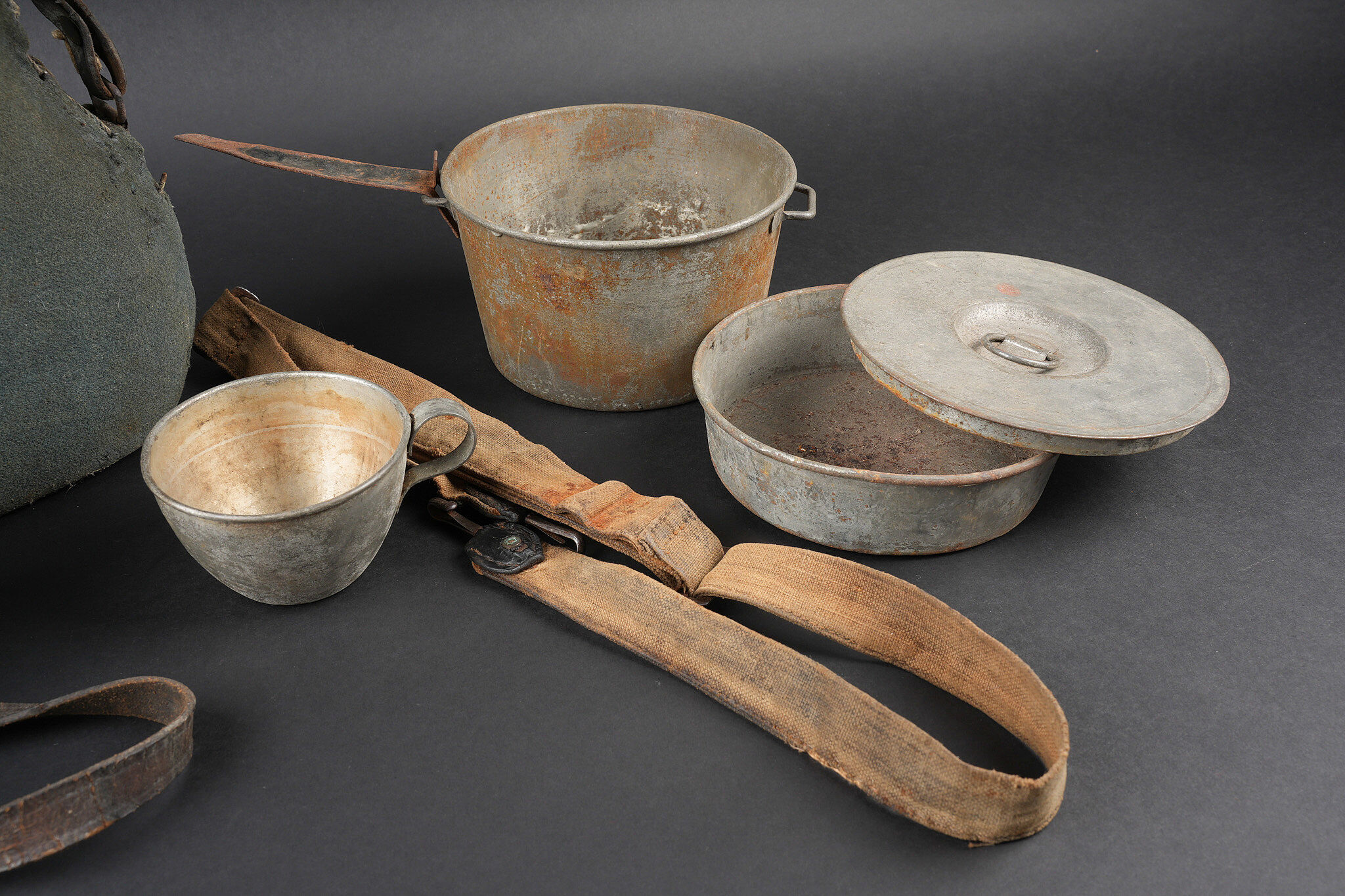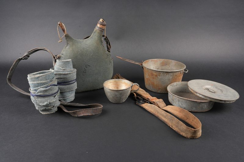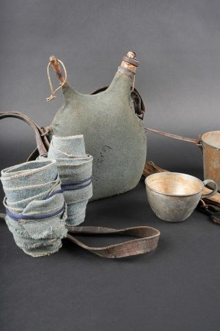 Ensemble d’équipements. Comprenant un bidon 1877 peint en bleu horizon et recouvert d’une housse teintée en bleu, un bouchon non conforme, courroie de transport d’origine. Une gamelle modèle 1852 en fer étamé, complète avec sa poignée et son plat. Un quart réglementaire. Une paire de bandes molletières cintrées en drap bleu horizon possédant des traces d’usage et des accrocs. Une bretelle de sac à pain allemand avec plusieurs réparations. Equipment set. Model 1877 water bottle painted horizon blue with a blue dyed cover and replacement stopper, original carrying strap. Model 1852 tinned steel mess tin complete with handle and inner tray. Regulation drinking cup. A pair of shaped horizon blue puttees showing wear and small damages. A German bread bag strap with several repairs.