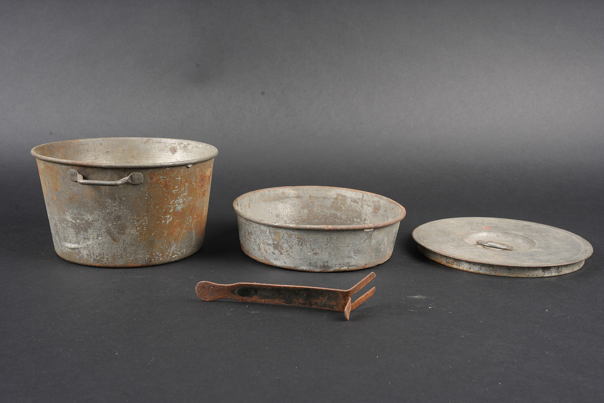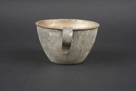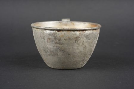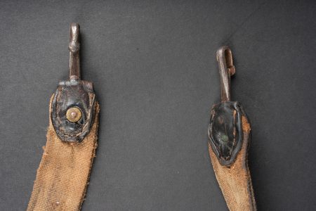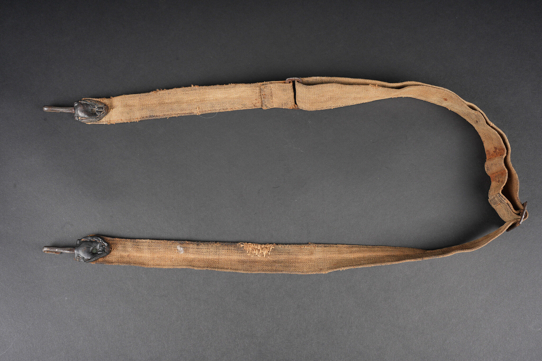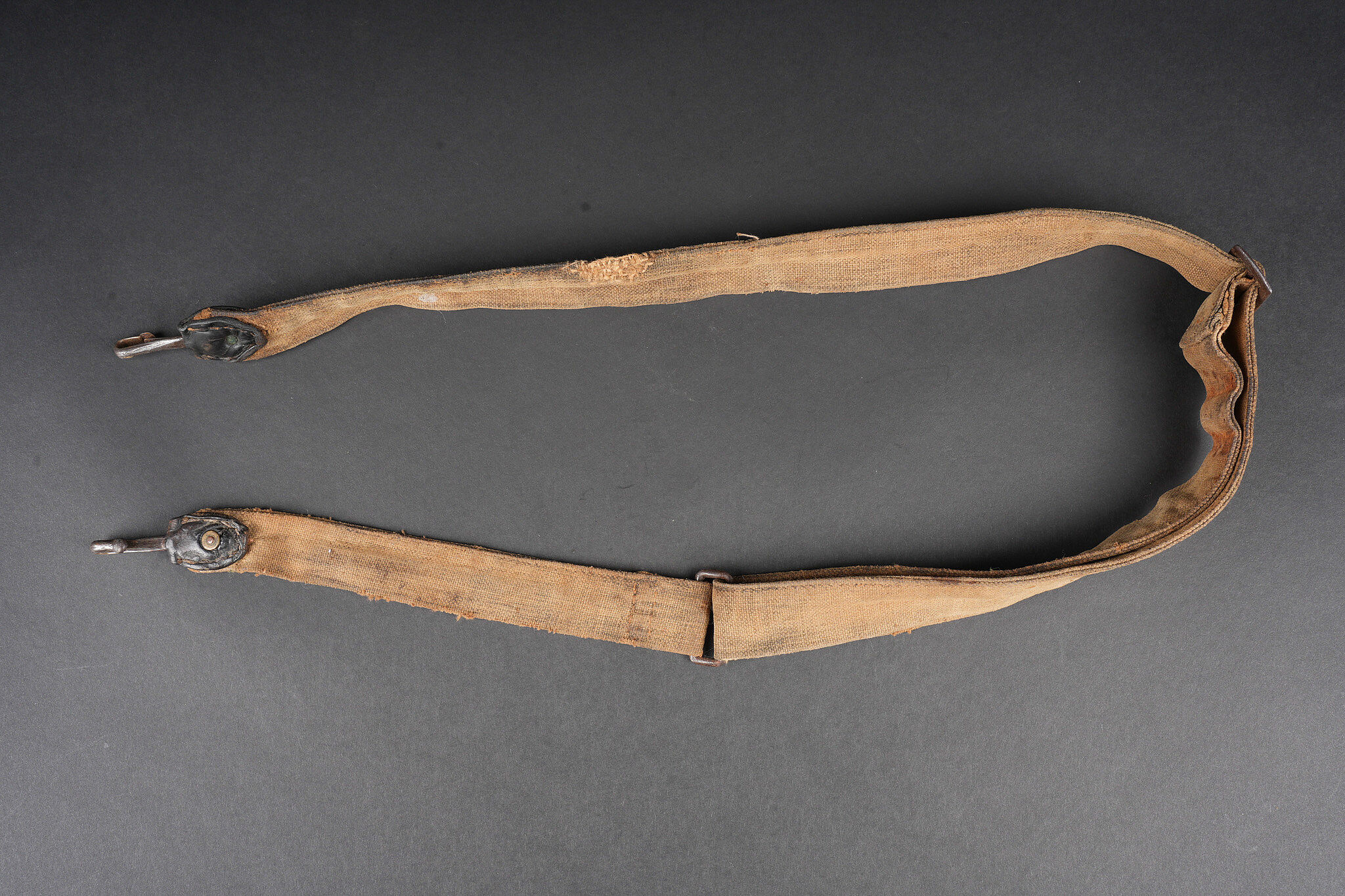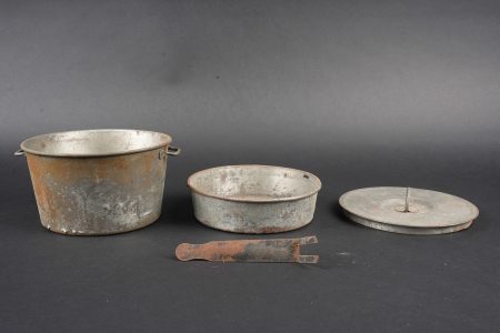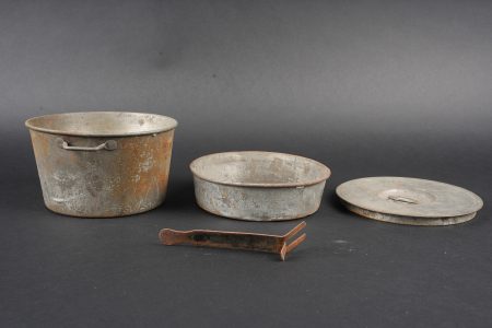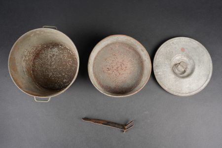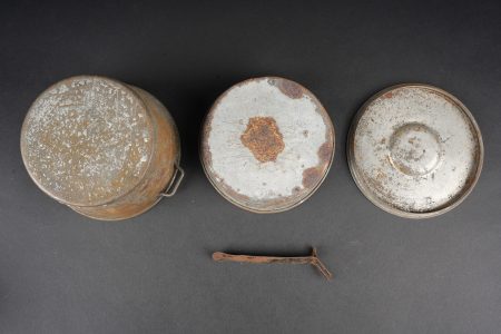Ensemble d’équipements. Comprenant un bidon 1877 peint en bleu horizon et recouvert d’une housse teintée en bleu, un bouchon non conforme, courroie de transport d’origine. Une gamelle modèle 1852 en fer étamé, complète avec sa poignée et son plat. Un quart réglementaire. Une paire de bandes molletières cintrées en drap bleu horizon possédant des traces d’usage et des accrocs. Une bretelle de sac à pain allemand avec plusieurs réparations. Equipment set. Model 1877 water bottle painted horizon blue with a blue dyed cover and replacement stopper, original carrying strap. Model 1852 tinned steel mess tin complete with handle and inner tray. Regulation drinking cup. A pair of shaped horizon blue puttees showing wear and small damages. A German bread bag strap with several repairs.