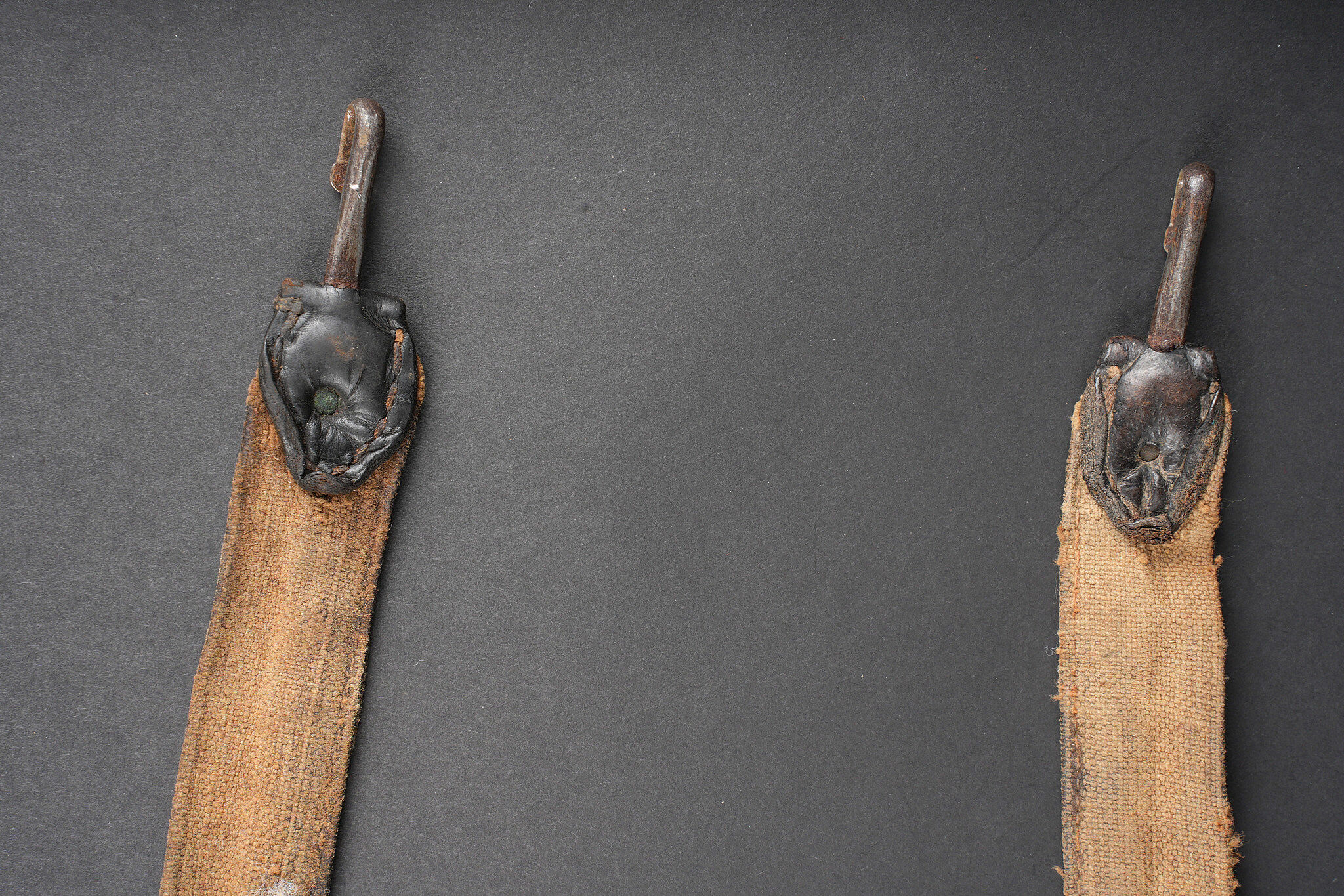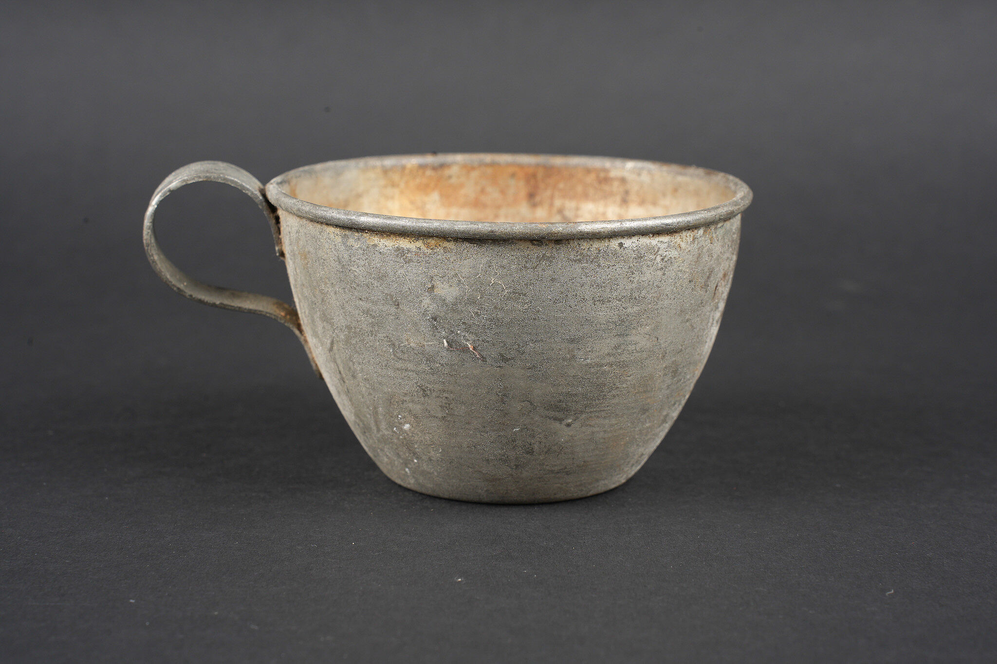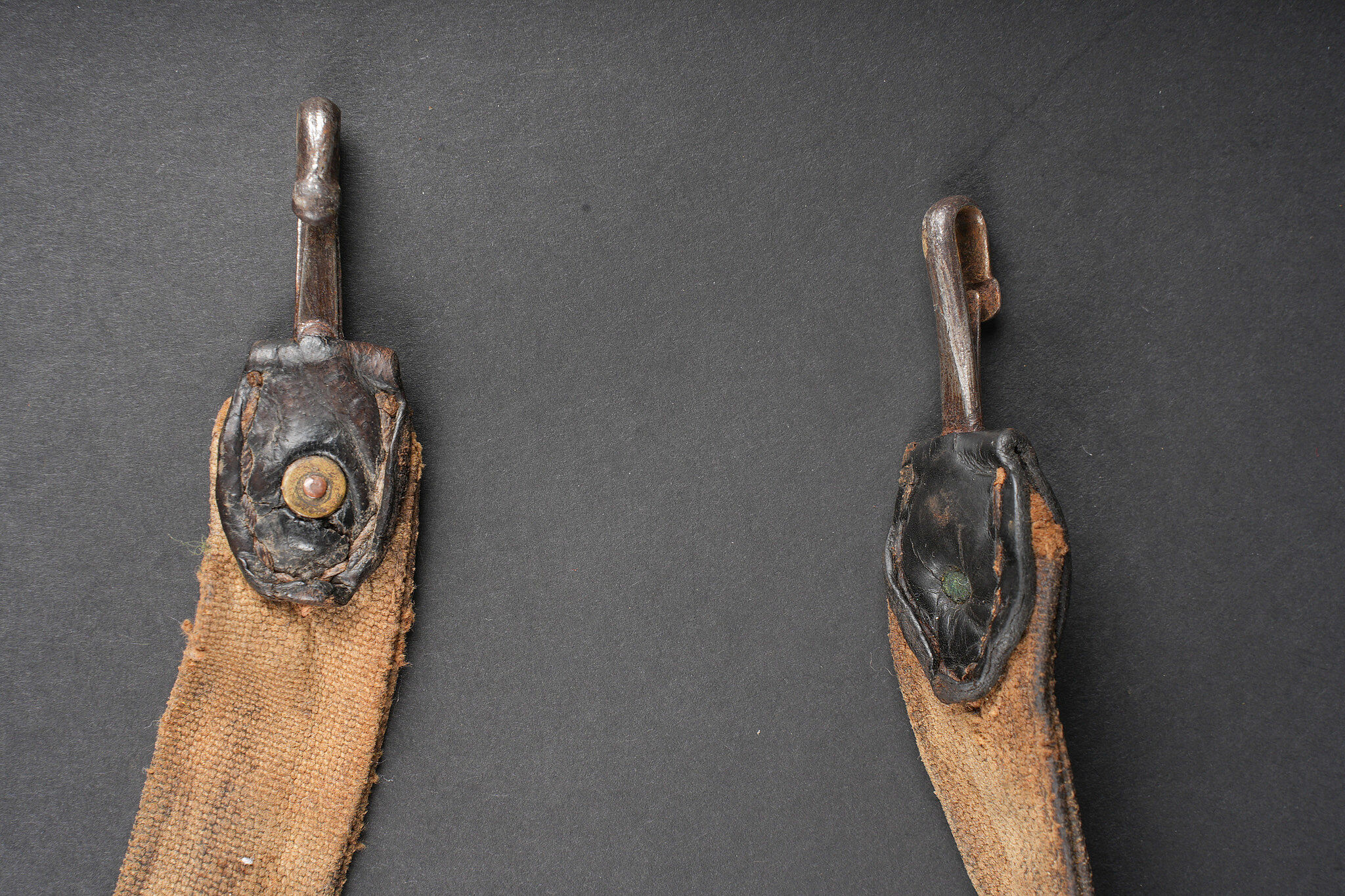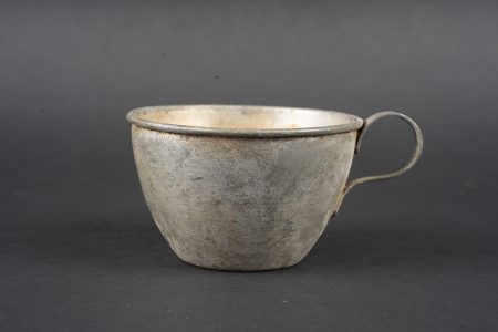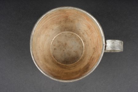 Ensemble d’équipements. Comprenant un bidon 1877 peint en bleu horizon et recouvert d’une housse teintée en bleu, un bouchon non conforme, courroie de transport d’origine. Une gamelle modèle 1852 en fer étamé, complète avec sa poignée et son plat. Un quart réglementaire. Une paire de bandes molletières cintrées en drap bleu horizon possédant des traces d’usage et des accrocs. Une bretelle de sac à pain allemand avec plusieurs réparations. Equipment set. Model 1877 water bottle painted horizon blue with a blue dyed cover and replacement stopper, original carrying strap. Model 1852 tinned steel mess tin complete with handle and inner tray. Regulation drinking cup. A pair of shaped horizon blue puttees showing wear and small damages. A German bread bag strap with several repairs.