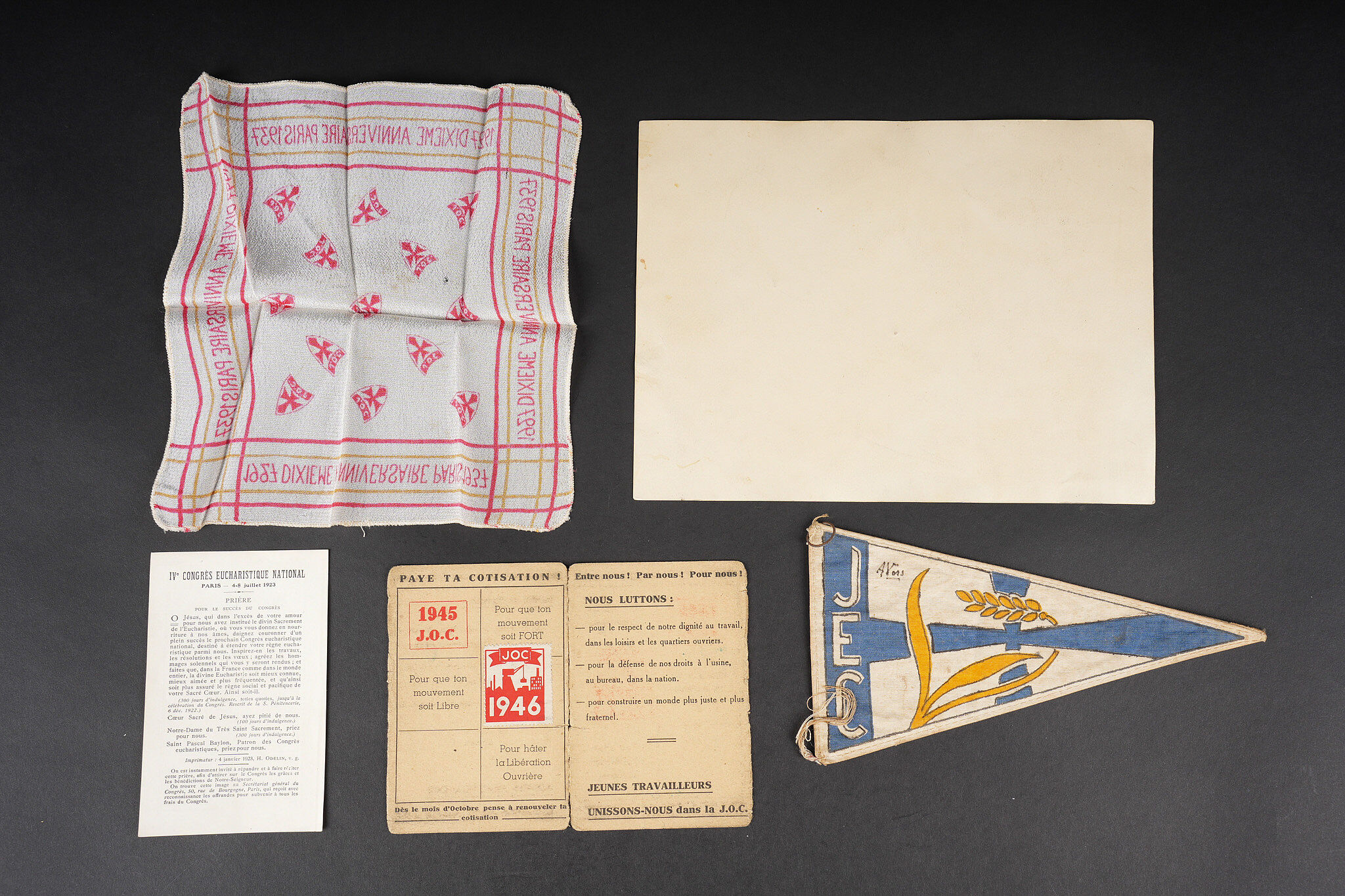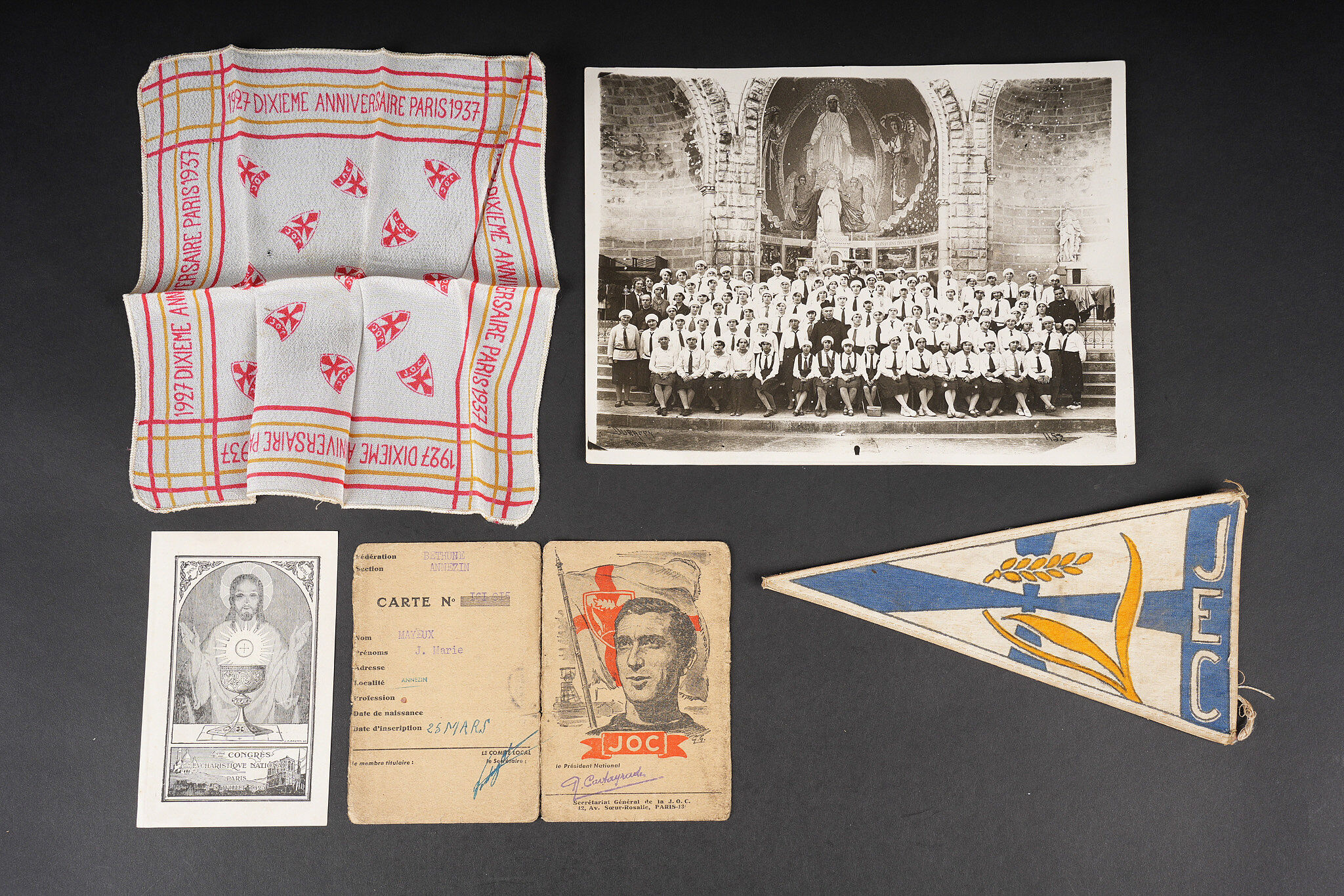 Ensemble fanion JEC et divers JOC. Ensemble comprenant une photo d’un groupe Féminin des JOC à Lourdes. Une carte d’adhérent des JOC pour les années 45 et 46de la Section de Béthune Annezin. Un petit mouchoir en soie pour le dixième anniversaire des JOC en 1937. Un petit fanion biface, peint des JOC et signé A.Vors . Une prière pour le IV Congrès Eucharistique National de juillet 1923. JEC fanion and miscellaneous JOC grouping. Comprising a photograph of a female JOC group at Lourdes. A JOC membership card for the years 1945 and 1946 of the Béthune Annezin section. A small silk handkerchief for the tenth anniversary of the JOC in 1937. A small double sided painted JOC fanion signed A Vors. A prayer for the Fourth National Eucharistic Congress of July 1923.