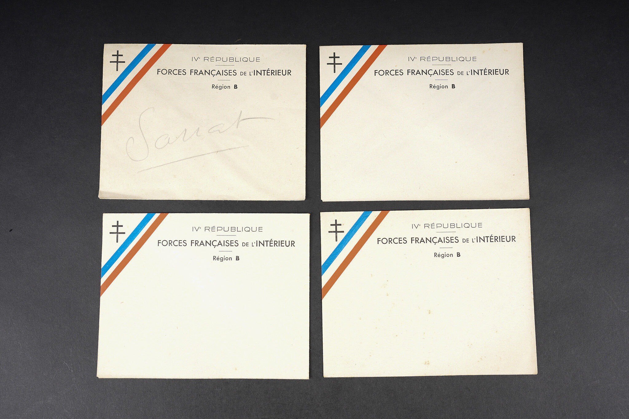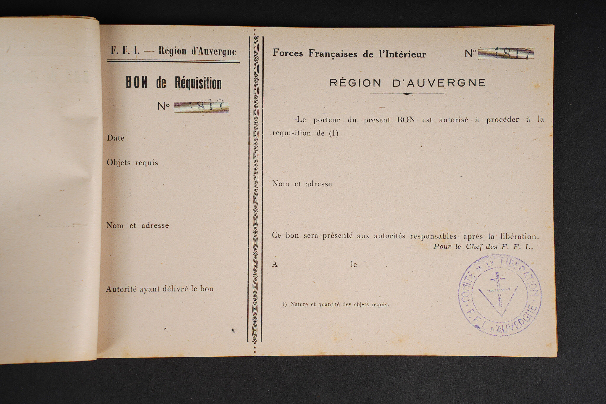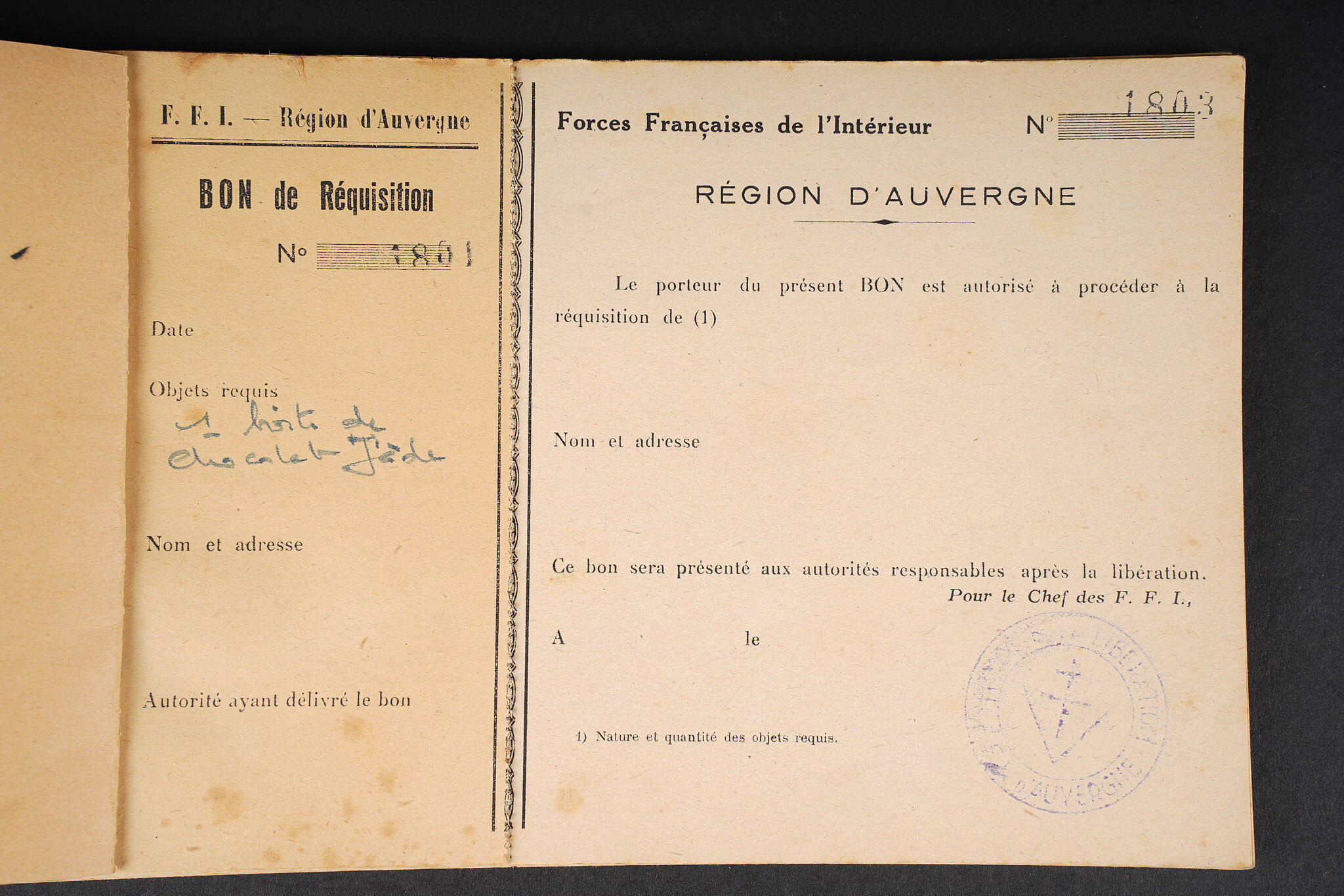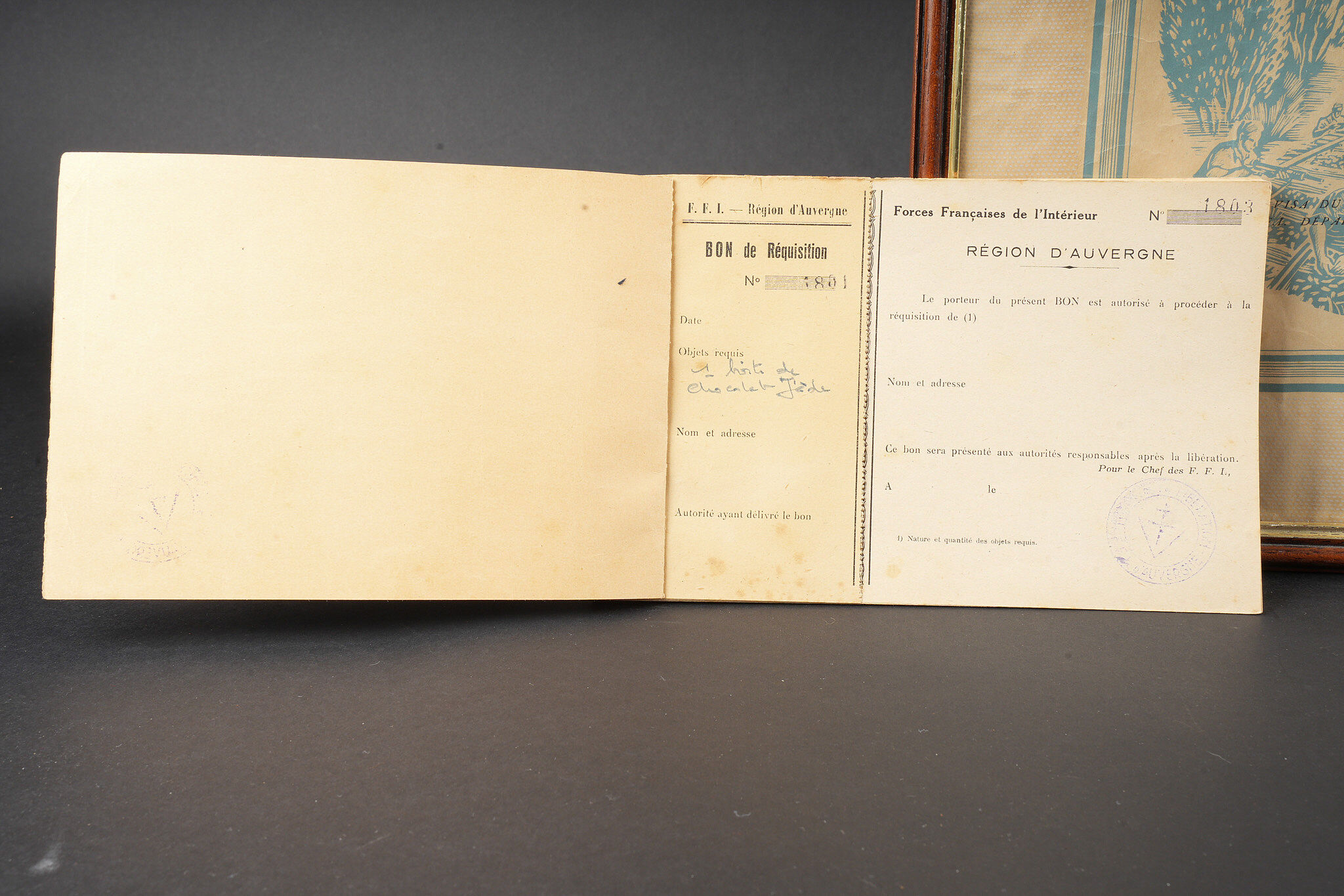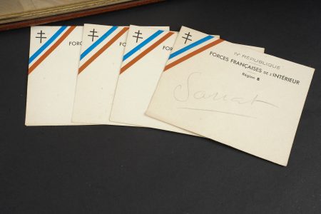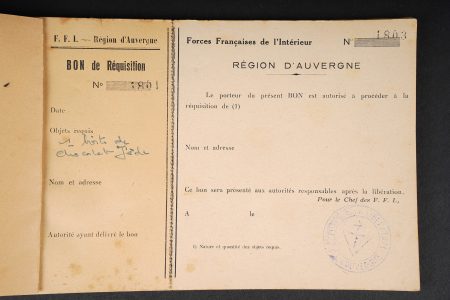 Ensemble FFI région Centre. Ensemble comprenant un diplôme de résistant de la Région 5 décerné à Monsieur Chenevat Roger pour les services rendus aux Forces Françaises de l’intérieur. Diplôme portant le numéro d’attribution 9. On y joint 4 enveloppes des Forces françaises de l’Intérieur Région B, un carnet FFI région Auvergne, complet comprenant plusieurs bon de réquisition, dont deux furent utilisés pour une boite de chocolat notamment. FFI region Centre grouping. Group comprising a Resistance diploma of Region 5 awarded to Roger Chenevat for services rendered to the Forces Françaises de l’Intérieur the diploma bearing attribution number 9. Included are four envelopes of the FFI Region B and an FFI Auvergne booklet complete with several requisition forms two of which were used including for a box of chocolates