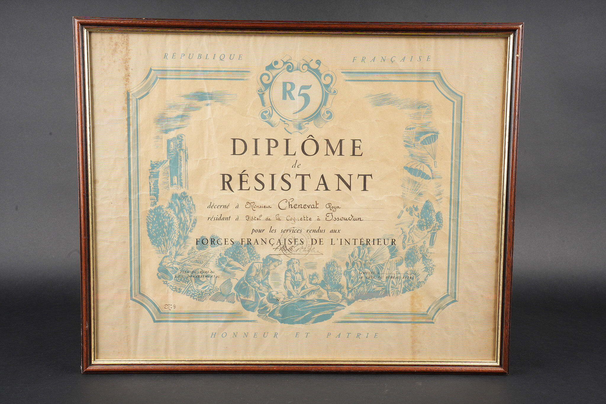 Détails de la vente >Ensemble FFI région Centre. Ensemble comprenant un diplôme de résistant de la Région 5 décerné à Monsieur Chenevat Roger pour les services rendus aux Forces Françaises de... en savoir plus