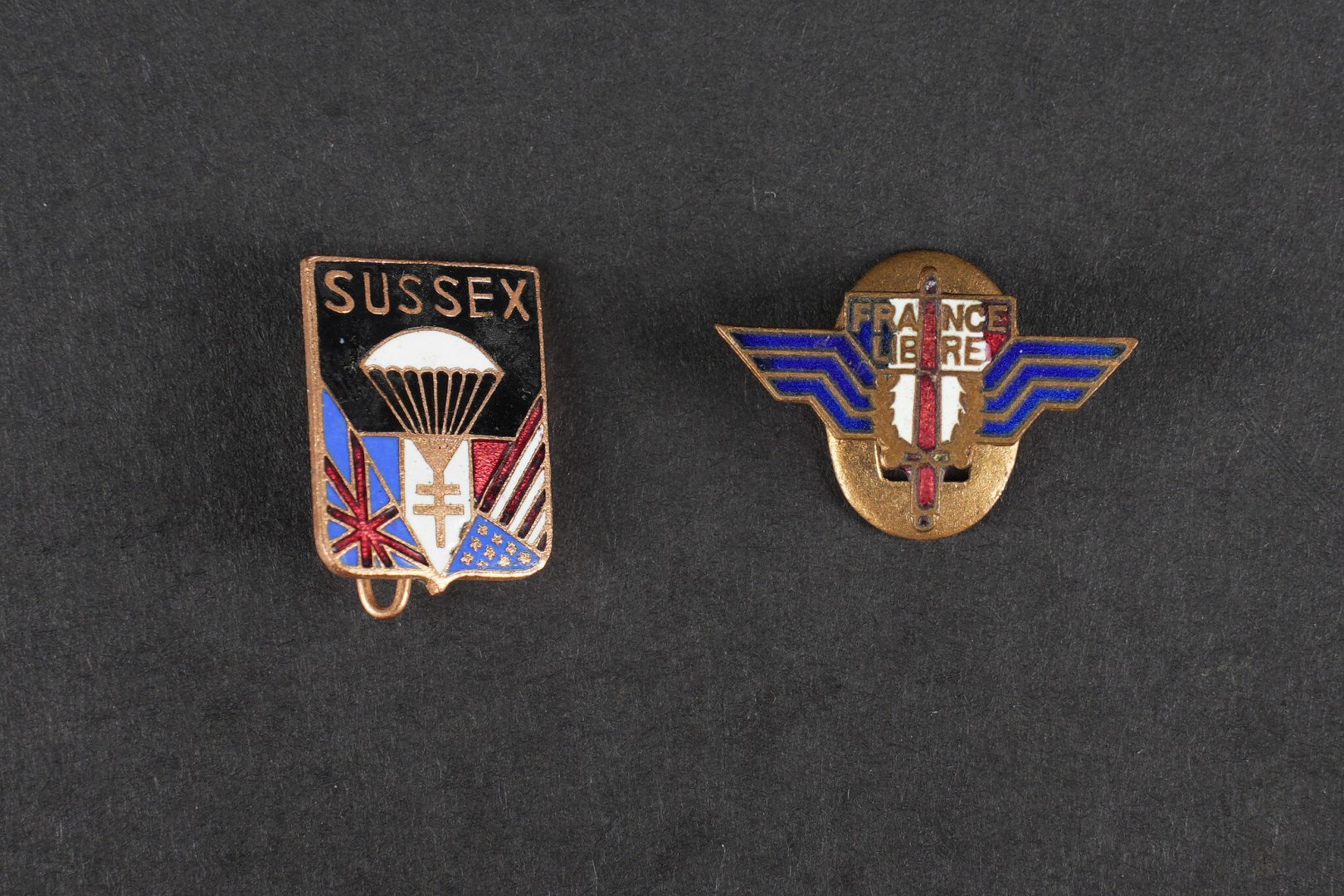 Ensemble réductions Insignes France libre et Sussex. Set of miniature badges France Libre and Sussex