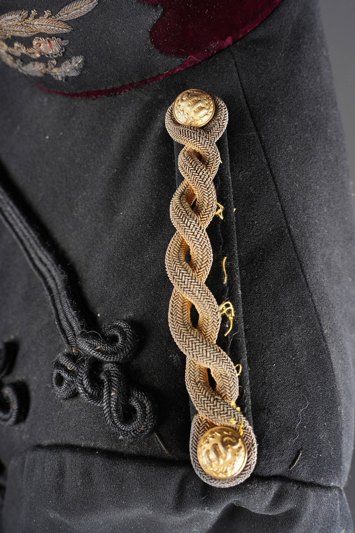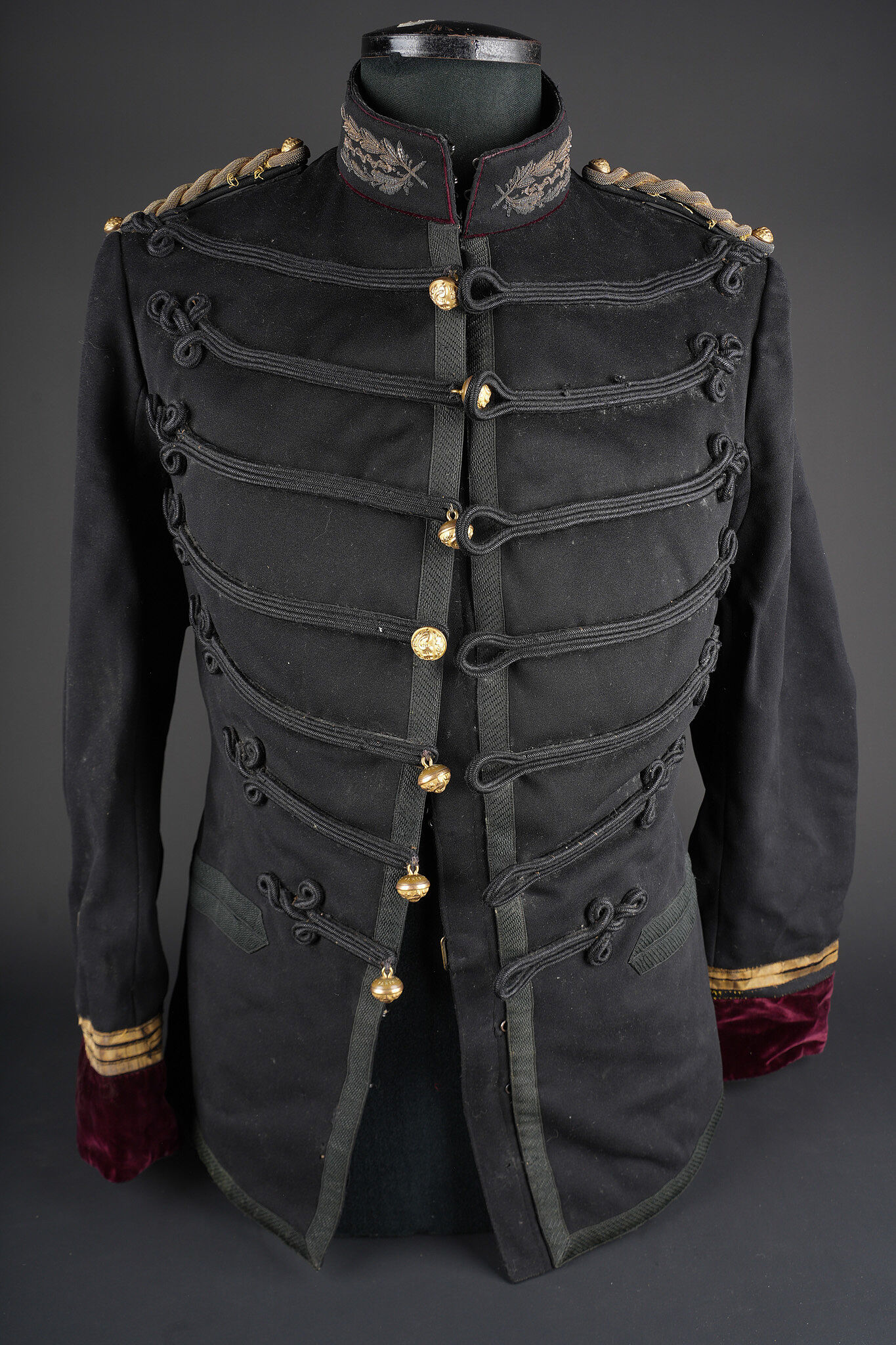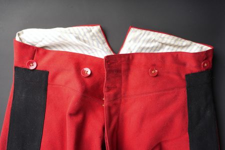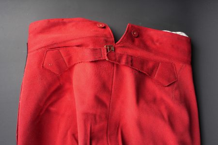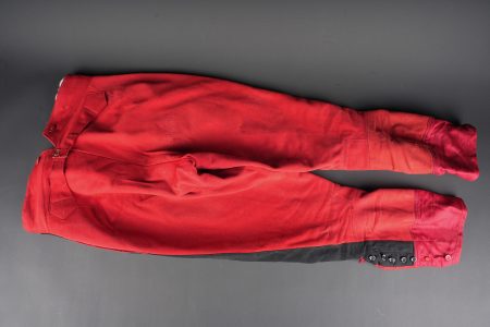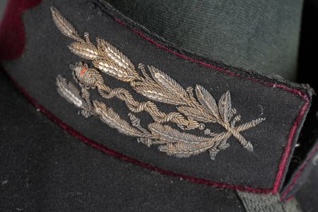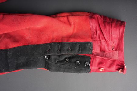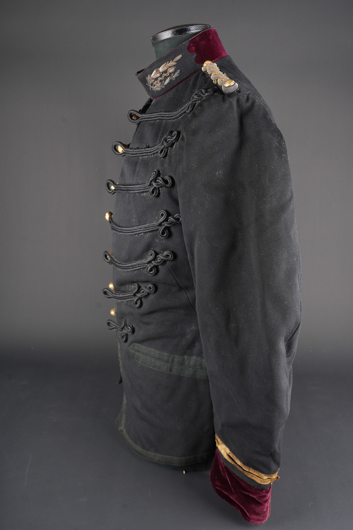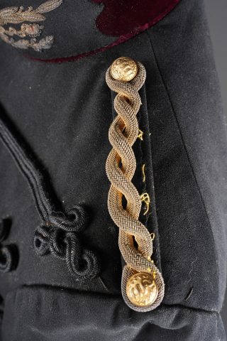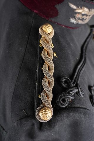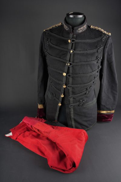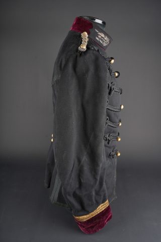 Ensemble service de santé. Comprenant une tunique à brandebourgs de capitaine médecin se fermant par sept boutons à l’arme du service de santé. Pattes de col du type officier brodées cannetille sur drap noir. Col et parements de manche en velours cramoisi, grades de capitaine cousus au bas de chaque manche dont un galon absent au bas de la manche gauche. Epaulettes tressées d’officier, doublure en rayonne noire portant l’étiquette du tailleur Rieu à Paris. On y joint une culotte d’officier en drap rouge garance à larges bandes noires. Manchettes se fermant par sept boutons dont quelques uns absents. Medical Service officer’s set. Comprising a captain-doctor’s frogged tunic fastening with seven Medical Service buttons. Officer-type collar patches in bullion embroidery on black cloth. Crimson velvet collar and cuffs, captain’s rank lace at the lower sleeves with one stripe missing on the left sleeve. Officer’s plaited epaulettes. Black rayon lining with the tailor’s label Rieu, Paris. Together with an officer’s madder-red breeches with wide black side stripes, cuffs fastening with seven buttons, several missing, striped cotton lining. Doublure en coton rayé.