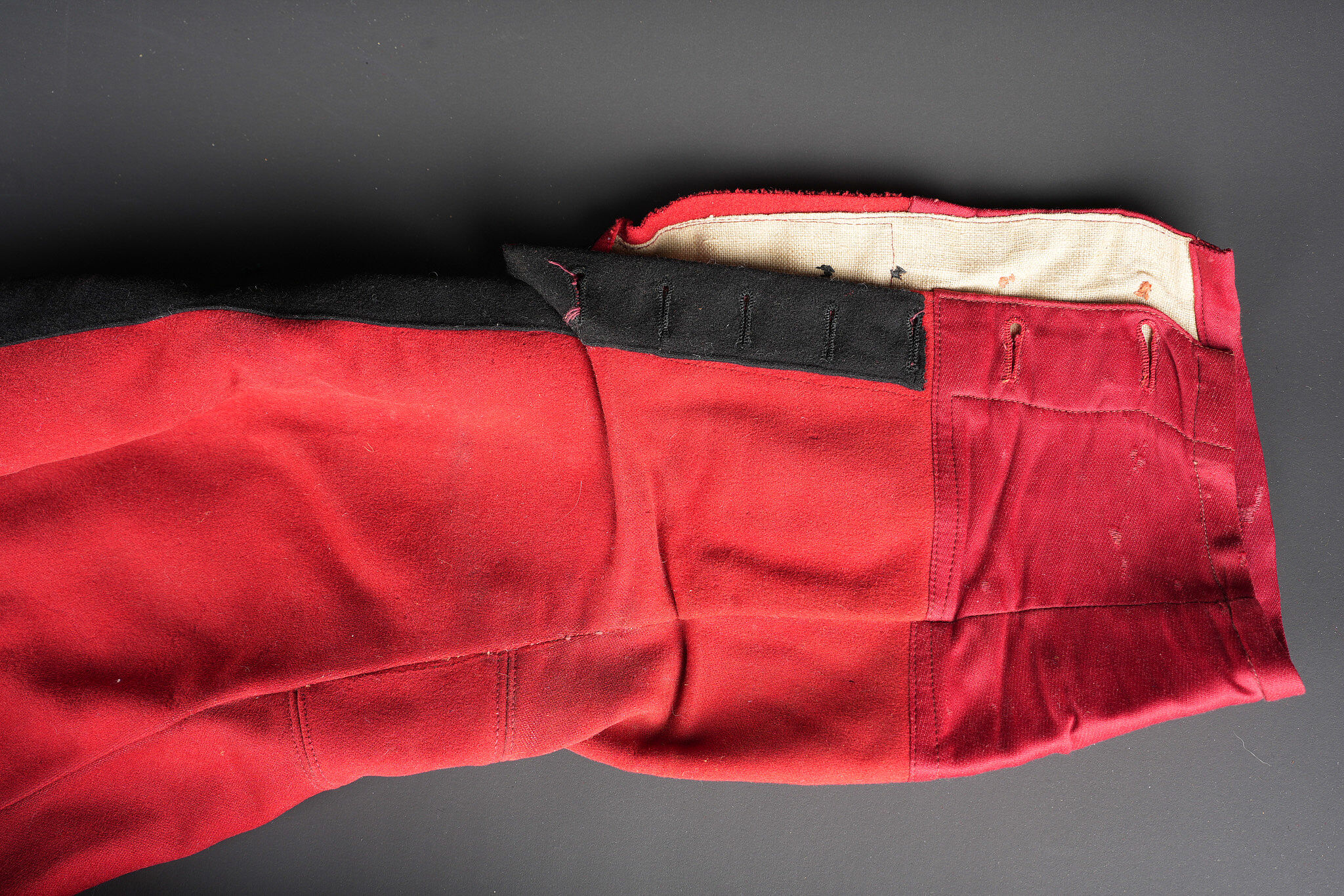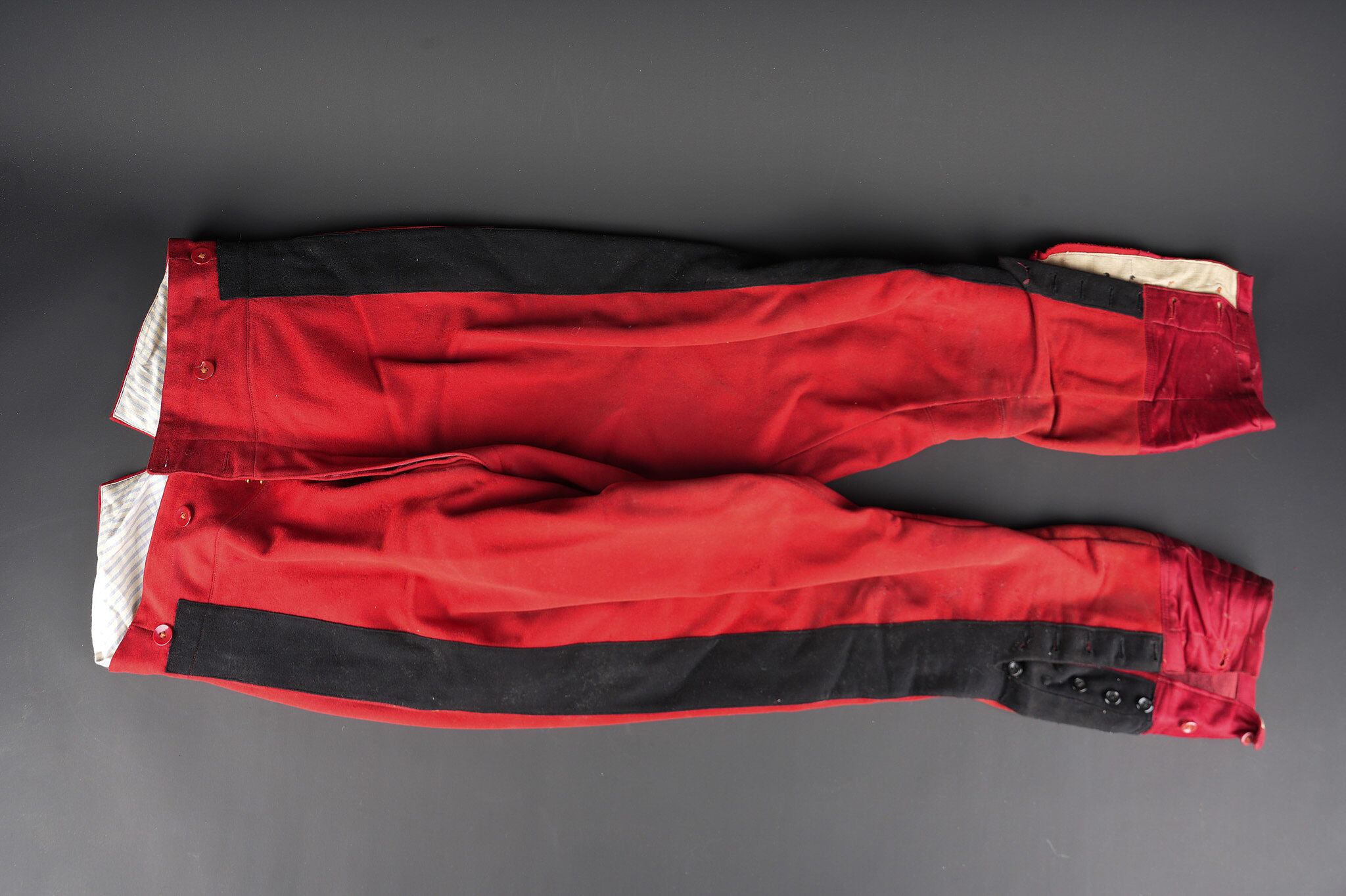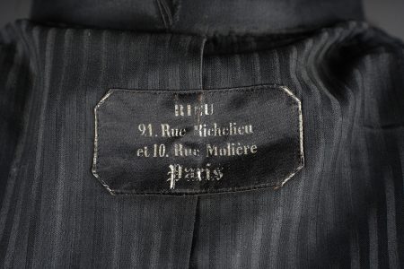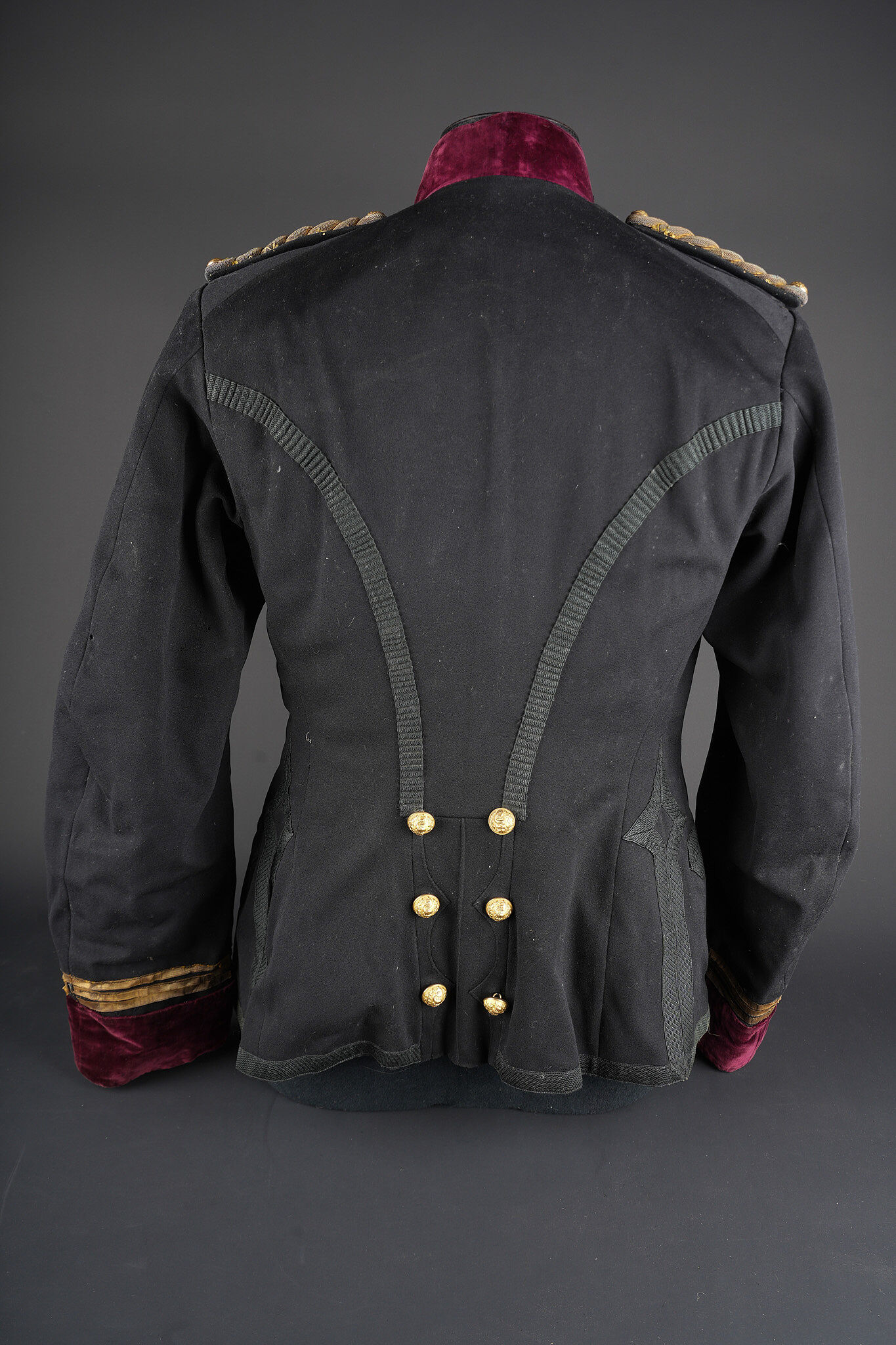 Ensemble service de santé. Comprenant une tunique à brandebourgs de capitaine médecin se fermant par sept boutons à l’arme du service de santé. Pattes de col du type officier brodées cannetille sur drap noir. Col et parements de manche en velours cramoisi, grades de capitaine cousus au bas de chaque manche dont un galon absent au bas de la manche gauche. Epaulettes tressées d’officier, doublure en rayonne noire portant l’étiquette du tailleur Rieu à Paris. On y joint une culotte d’officier en drap rouge garance à larges bandes noires. Manchettes se fermant par sept boutons dont quelques uns absents. Medical Service officer’s set. Comprising a captain-doctor’s frogged tunic fastening with seven Medical Service buttons. Officer-type collar patches in bullion embroidery on black cloth. Crimson velvet collar and cuffs, captain’s rank lace at the lower sleeves with one stripe missing on the left sleeve. Officer’s plaited epaulettes. Black rayon lining with the tailor’s label Rieu, Paris. Together with an officer’s madder-red breeches with wide black side stripes, cuffs fastening with seven buttons, several missing, striped cotton lining. Doublure en coton rayé.