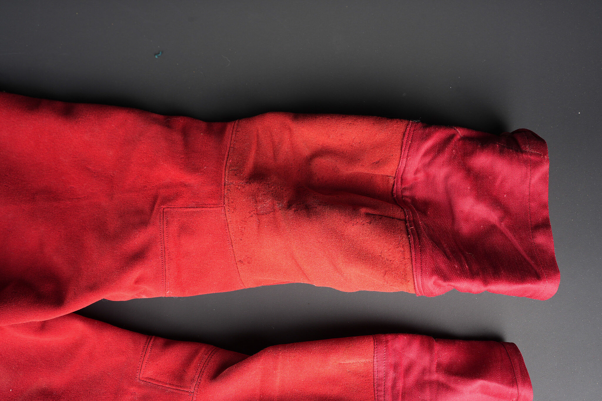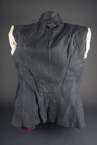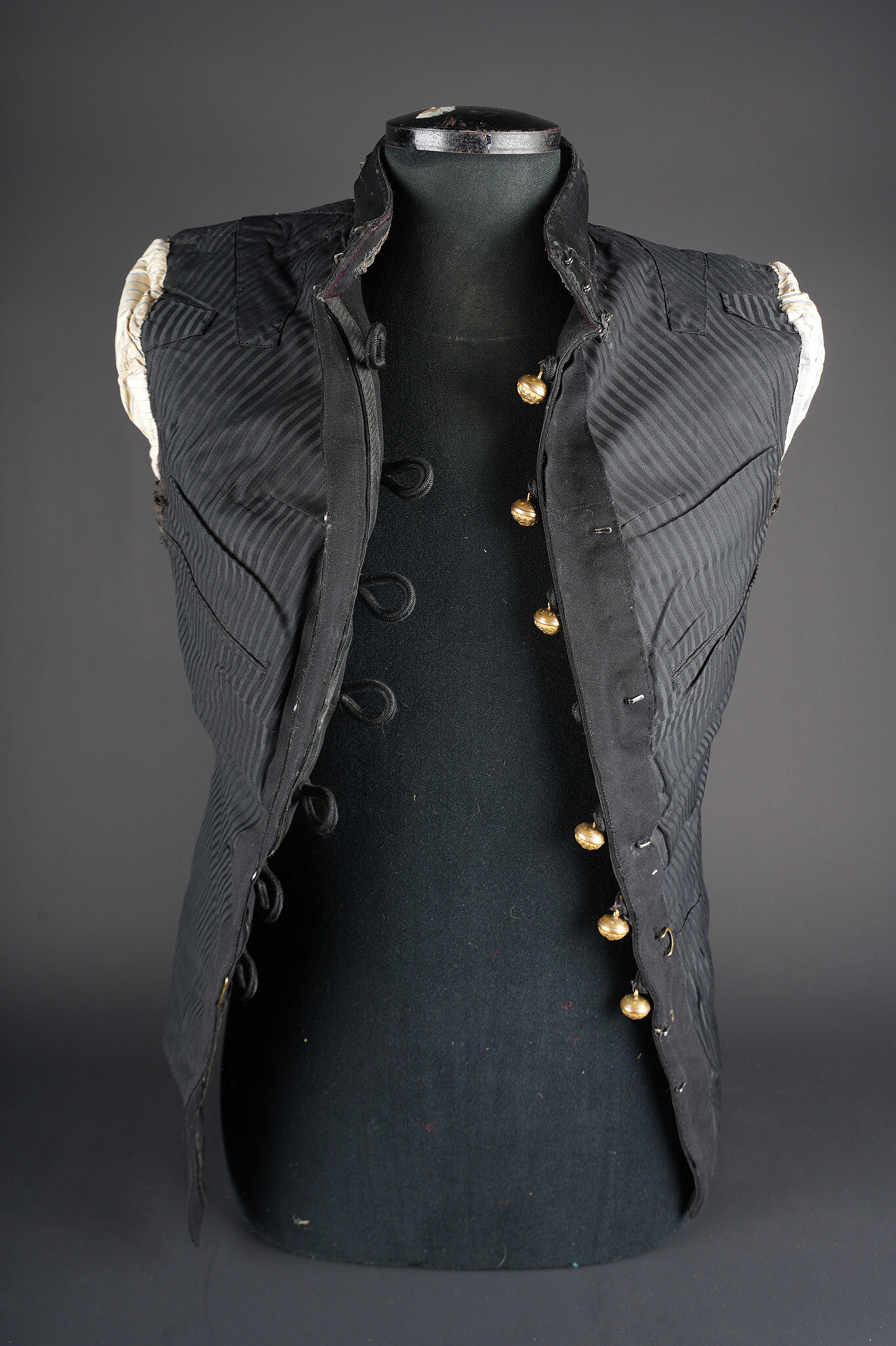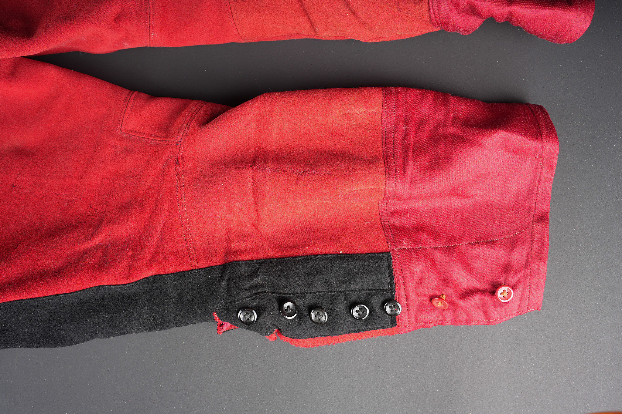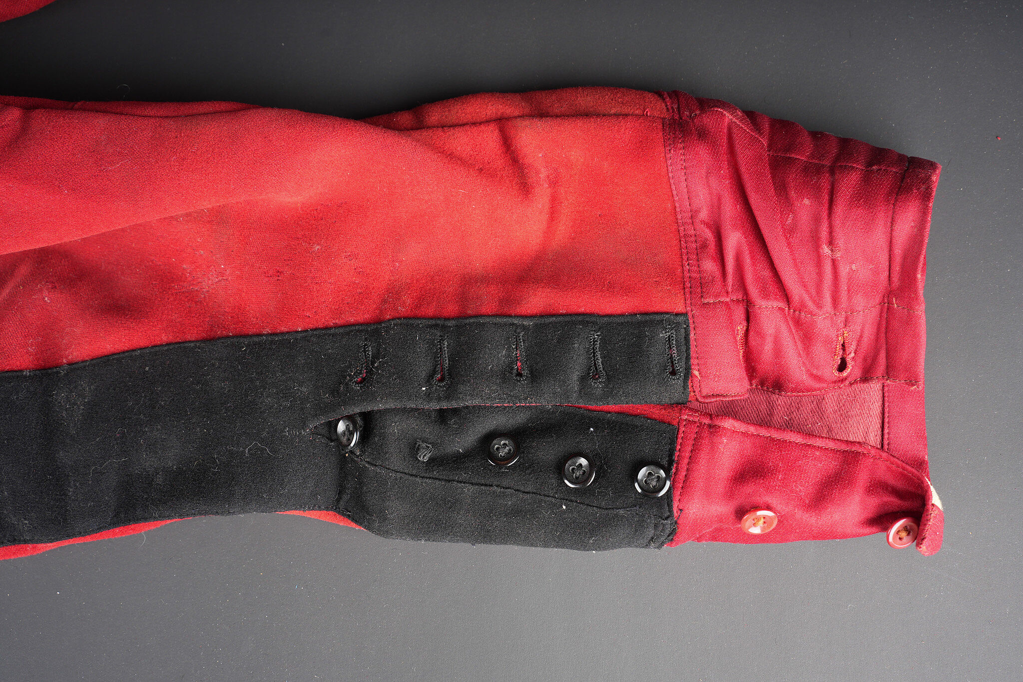 Ensemble service de santé. Comprenant une tunique à brandebourgs de capitaine médecin se fermant par sept boutons à l’arme du service de santé. Pattes de col du type officier brodées cannetille sur drap noir. Col et parements de manche en velours cramoisi, grades de capitaine cousus au bas de chaque manche dont un galon absent au bas de la manche gauche. Epaulettes tressées d’officier, doublure en rayonne noire portant l’étiquette du tailleur Rieu à Paris. On y joint une culotte d’officier en drap rouge garance à larges bandes noires. Manchettes se fermant par sept boutons dont quelques uns absents. Medical Service officer’s set. Comprising a captain-doctor’s frogged tunic fastening with seven Medical Service buttons. Officer-type collar patches in bullion embroidery on black cloth. Crimson velvet collar and cuffs, captain’s rank lace at the lower sleeves with one stripe missing on the left sleeve. Officer’s plaited epaulettes. Black rayon lining with the tailor’s label Rieu, Paris. Together with an officer’s madder-red breeches with wide black side stripes, cuffs fastening with seven buttons, several missing, striped cotton lining. Doublure en coton rayé.