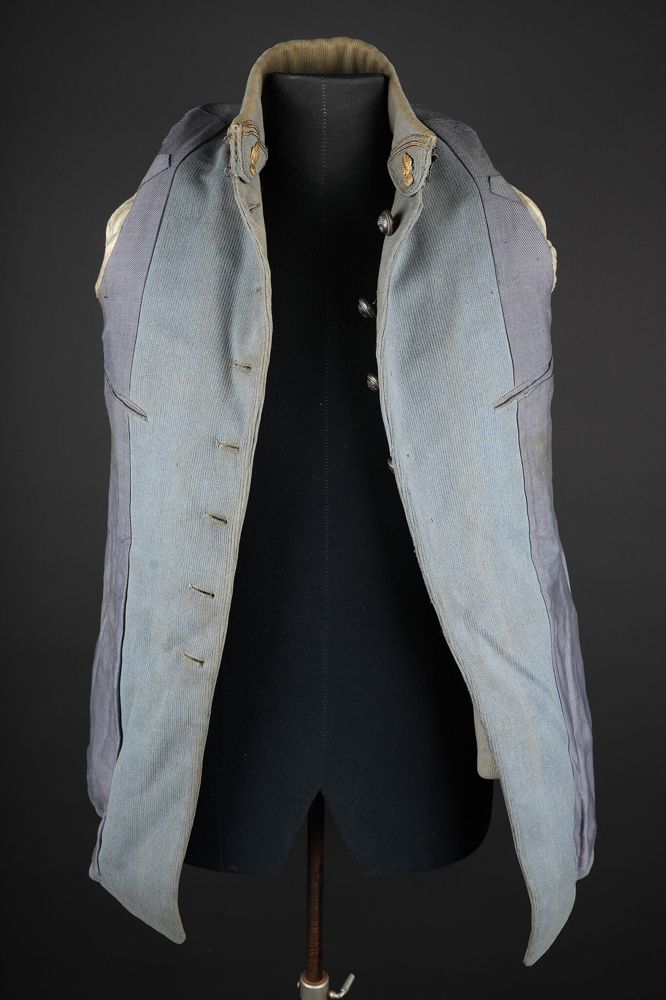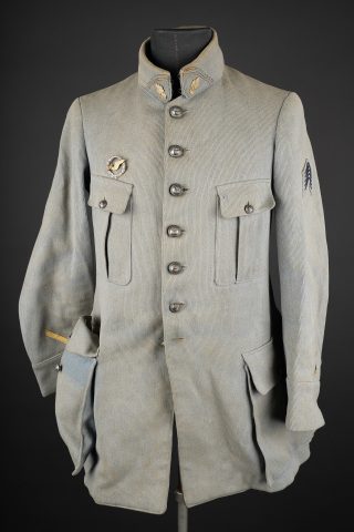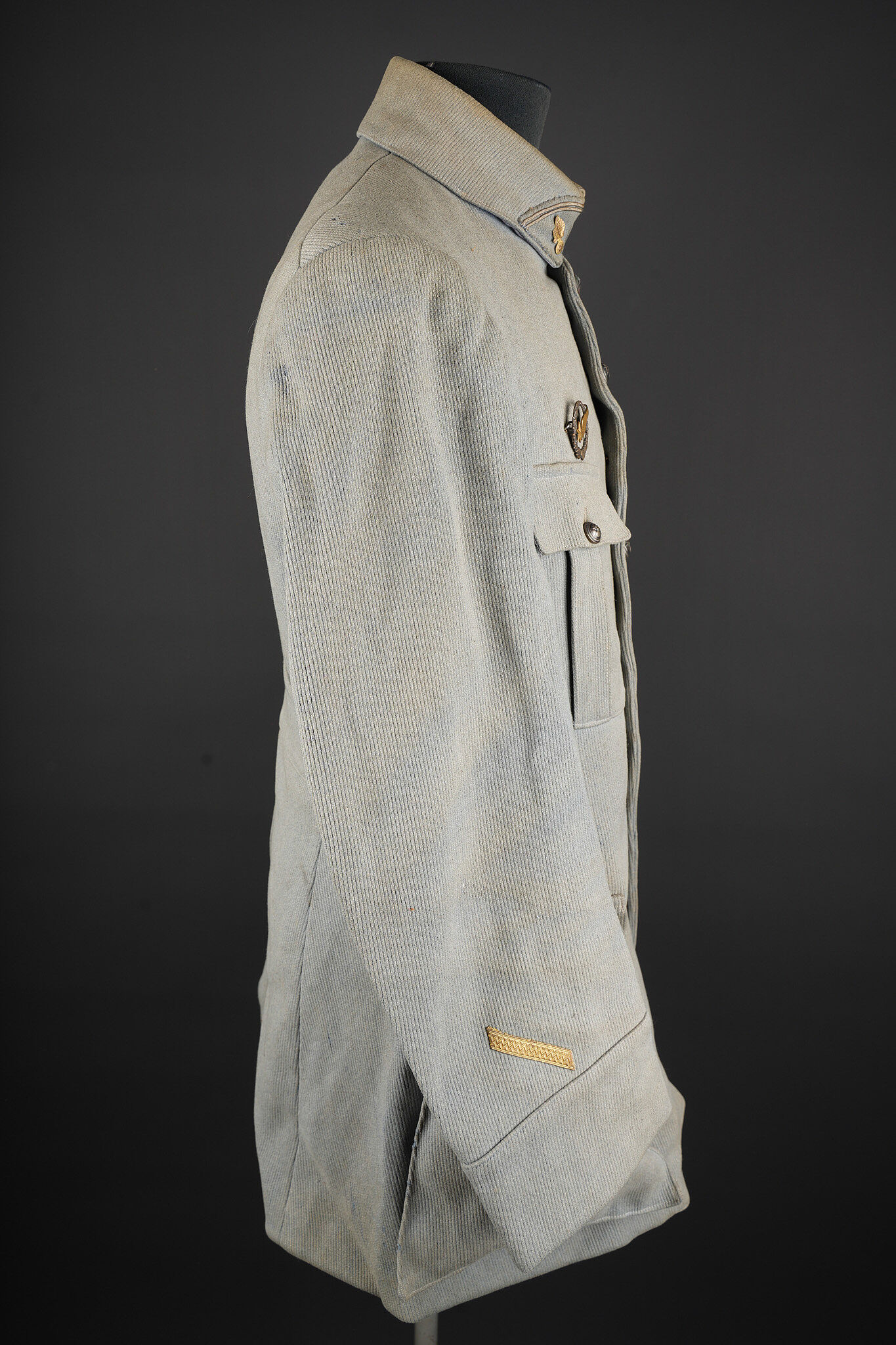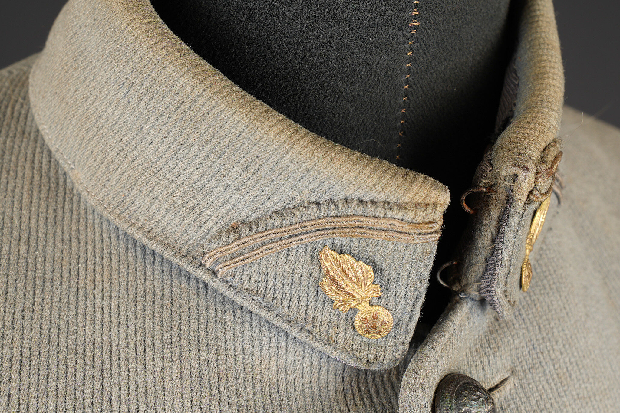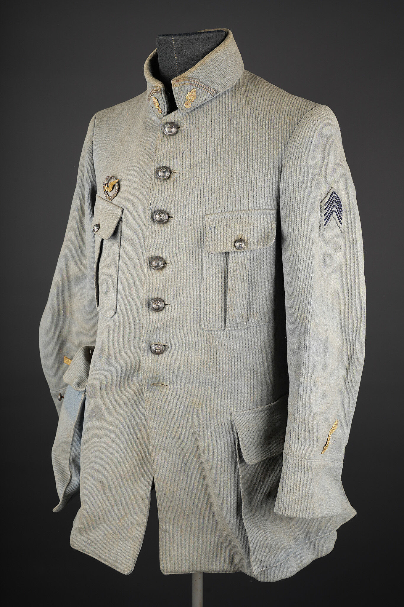 Ensemble velours bleu horizon. Comprenant une vareuse quatre poches confectionnée en velours bleu horizon et se fermant par sept boutons aux armes de l’infanterie. Les pattes de col portent des grenades métalliques indiquant que le soldat était rattaché à un état major. Sur le haut de la manche gauche se trouve cousu d’origine ses chevrons de présence au front. Au dessus de la poche de poitrine droite est cousu d’origine un brevet d’observateur numéroté B3264, doublure en satinette bleue et rayée. Culotte confectionnée en velours bleu horizon se fermant par six boutons dont deux absents, doublure en coton marron. Manchettes se fermant par sept boutons tous présents. Bandes molletières droites confectionnées dans un drap peigné bleu horizon, petits renforts de cuir et lacets présents. Bel ensemble homogène. Horizon blue velvet uniform set. Comprising a four pocket tunic made of horizon blue velvet and closing with seven infantry pattern buttons. Collar patches fitted with metal flaming grenades indicating attachment to a headquarters. Original overseas service chevrons sewn high on the left sleeve. Above the right breast pocket an observer qualification badge numbered B3264 originally sewn in place. Blue striped satinette lining. Breeches in horizon blue velvet closing with six buttons two missing and brown cotton lining. Cuffs closing with seven buttons all present. Straight puttees in combed horizon blue cloth with small leather reinforcements and retaining their laces. A fine matching set.