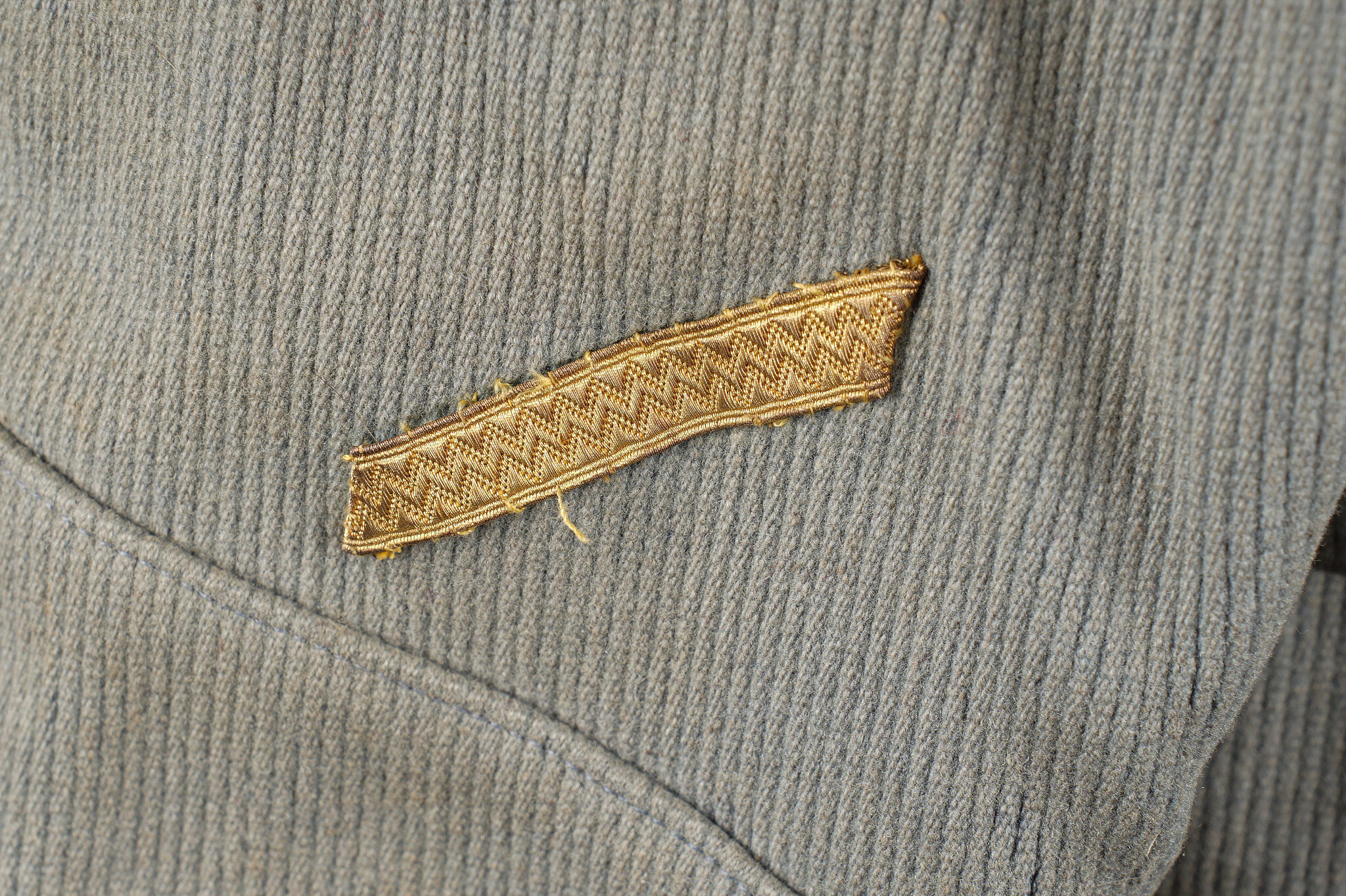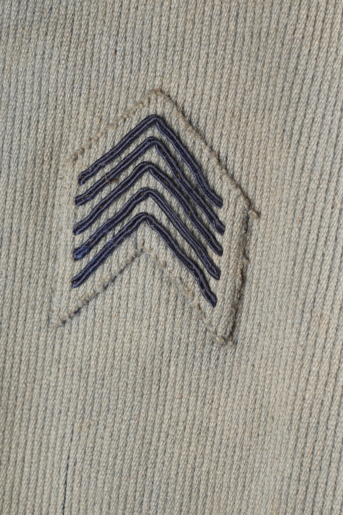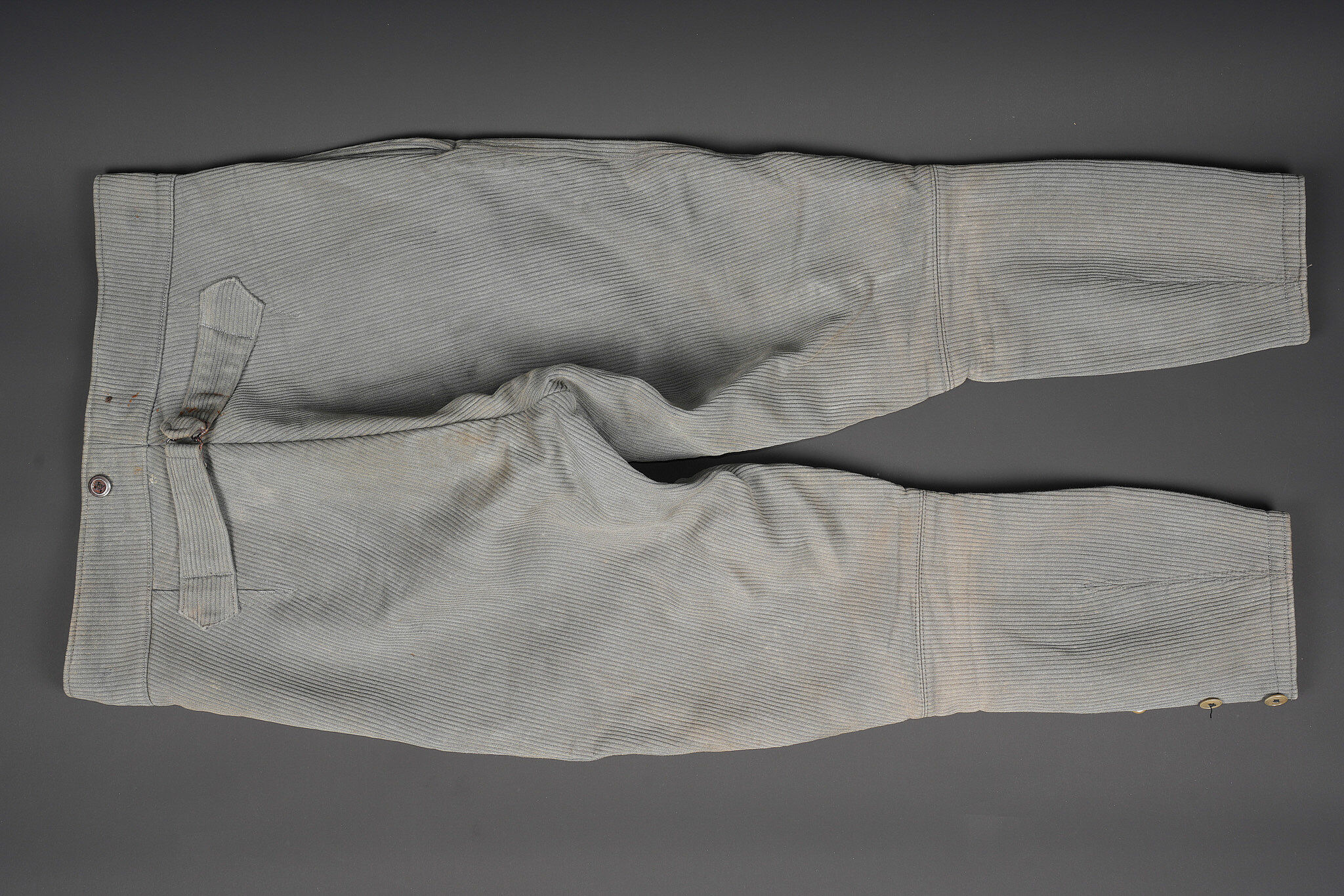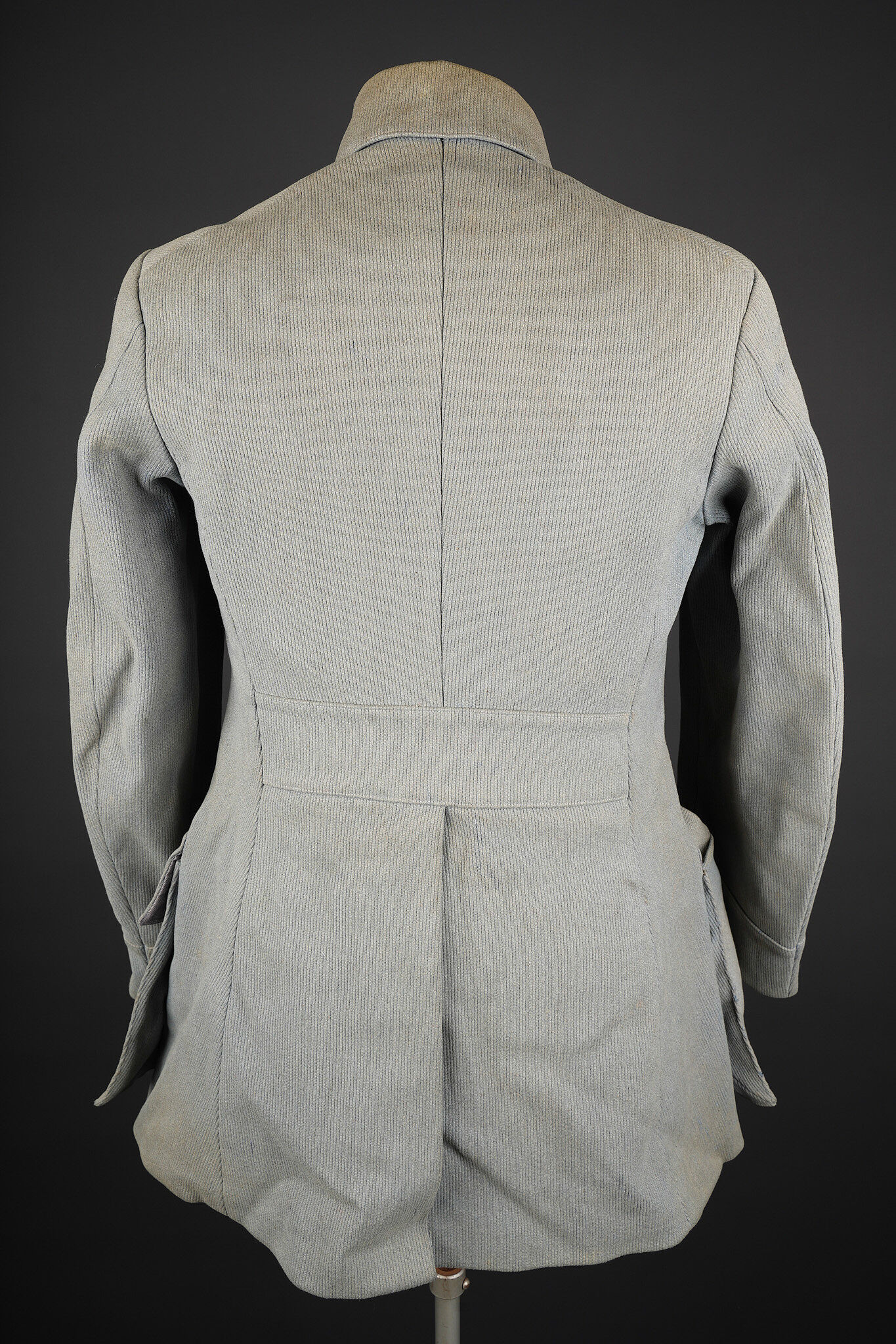 Ensemble velours bleu horizon. Comprenant une vareuse quatre poches confectionnée en velours bleu horizon et se fermant par sept boutons aux armes de l’infanterie. Les pattes de col portent des grenades métalliques indiquant que le soldat était rattaché à un état major. Sur le haut de la manche gauche se trouve cousu d’origine ses chevrons de présence au front. Au dessus de la poche de poitrine droite est cousu d’origine un brevet d’observateur numéroté B3264, doublure en satinette bleue et rayée. Culotte confectionnée en velours bleu horizon se fermant par six boutons dont deux absents, doublure en coton marron. Manchettes se fermant par sept boutons tous présents. Bandes molletières droites confectionnées dans un drap peigné bleu horizon, petits renforts de cuir et lacets présents. Bel ensemble homogène. Horizon blue velvet uniform set. Comprising a four pocket tunic made of horizon blue velvet and closing with seven infantry pattern buttons. Collar patches fitted with metal flaming grenades indicating attachment to a headquarters. Original overseas service chevrons sewn high on the left sleeve. Above the right breast pocket an observer qualification badge numbered B3264 originally sewn in place. Blue striped satinette lining. Breeches in horizon blue velvet closing with six buttons two missing and brown cotton lining. Cuffs closing with seven buttons all present. Straight puttees in combed horizon blue cloth with small leather reinforcements and retaining their laces. A fine matching set.