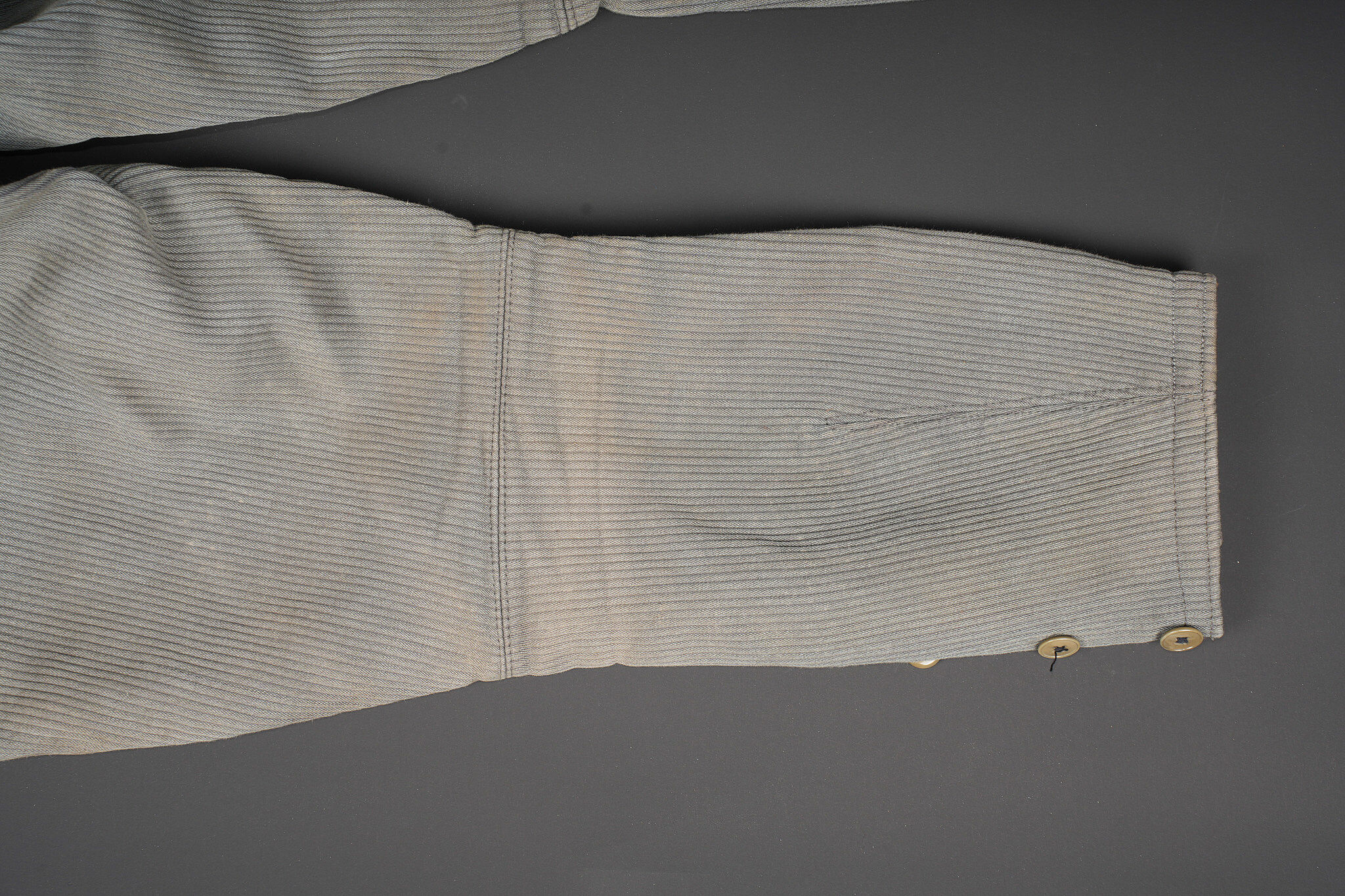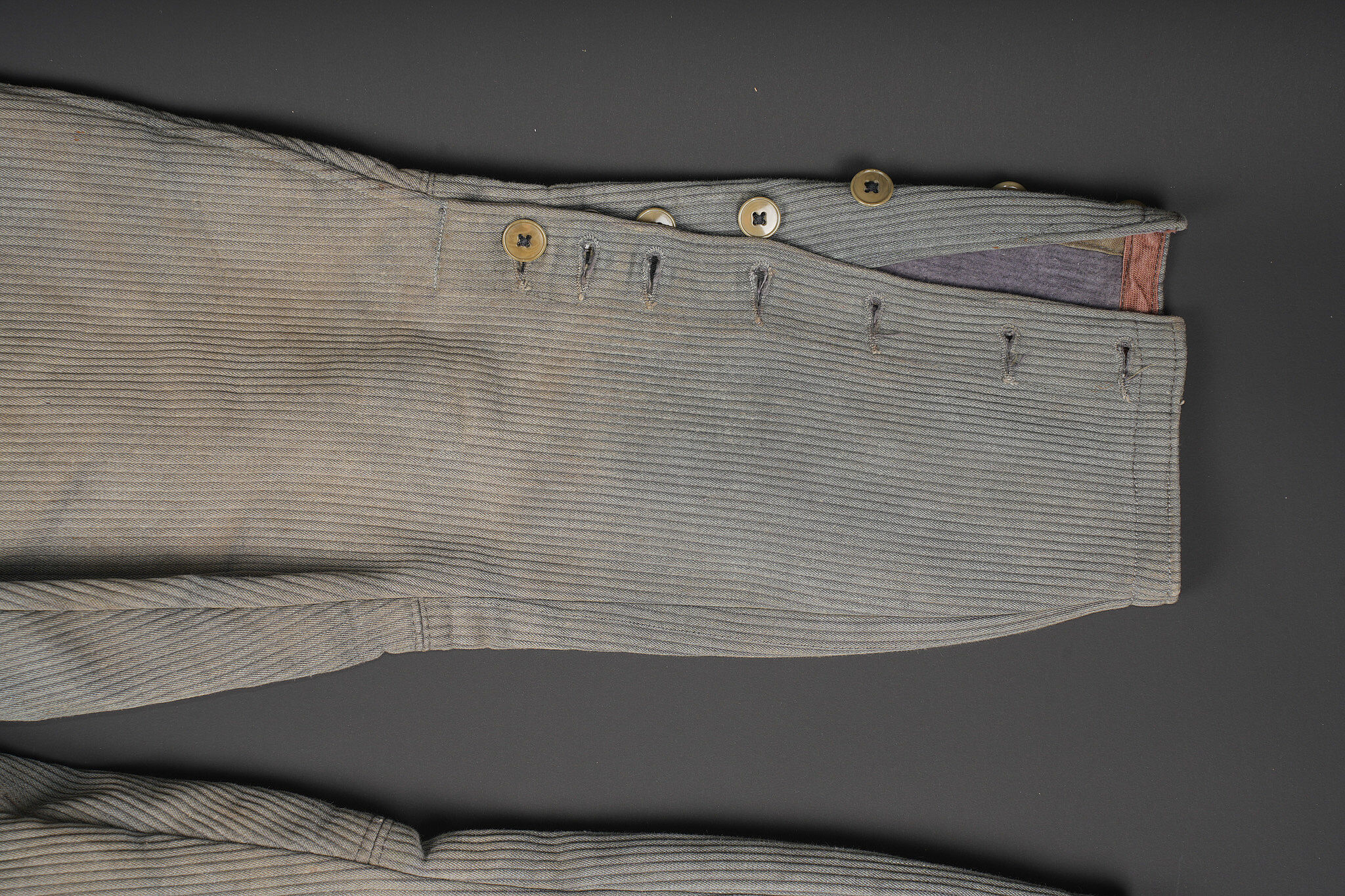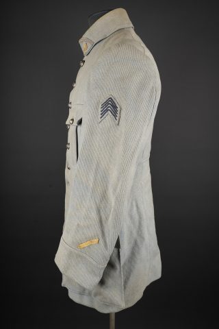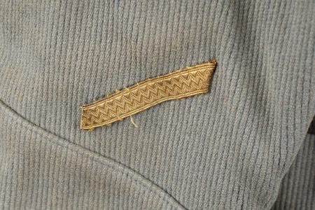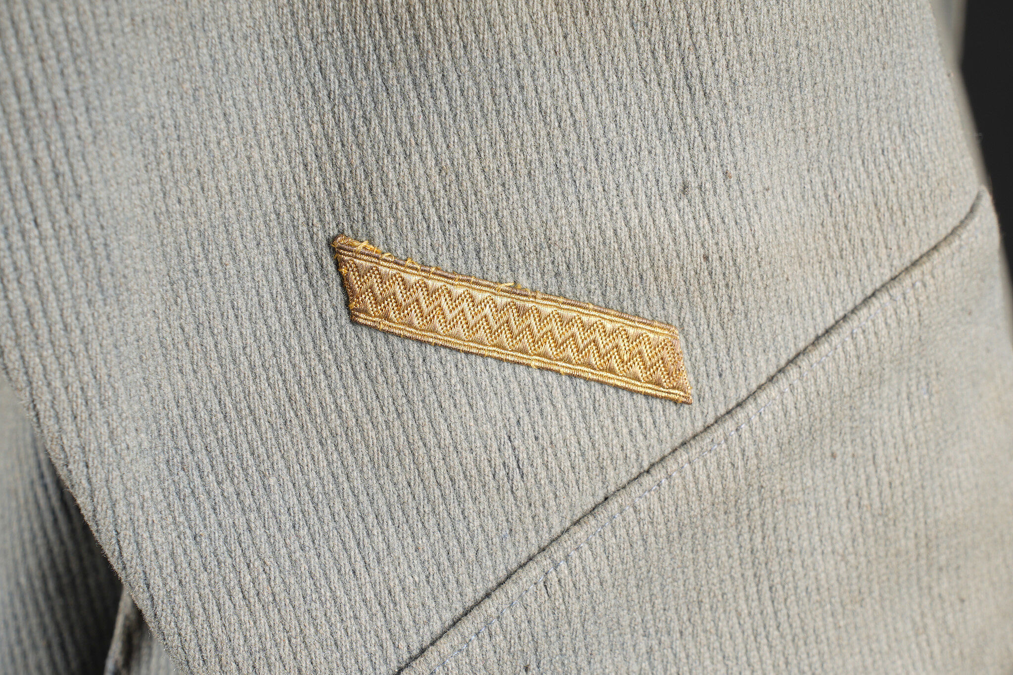 Ensemble velours bleu horizon. Comprenant une vareuse quatre poches confectionnée en velours bleu horizon et se fermant par sept boutons aux armes de l’infanterie. Les pattes de col portent des grenades métalliques indiquant que le soldat était rattaché à un état major. Sur le haut de la manche gauche se trouve cousu d’origine ses chevrons de présence au front. Au dessus de la poche de poitrine droite est cousu d’origine un brevet d’observateur numéroté B3264, doublure en satinette bleue et rayée. Culotte confectionnée en velours bleu horizon se fermant par six boutons dont deux absents, doublure en coton marron. Manchettes se fermant par sept boutons tous présents. Bandes molletières droites confectionnées dans un drap peigné bleu horizon, petits renforts de cuir et lacets présents. Bel ensemble homogène. Horizon blue velvet uniform set. Comprising a four pocket tunic made of horizon blue velvet and closing with seven infantry pattern buttons. Collar patches fitted with metal flaming grenades indicating attachment to a headquarters. Original overseas service chevrons sewn high on the left sleeve. Above the right breast pocket an observer qualification badge numbered B3264 originally sewn in place. Blue striped satinette lining. Breeches in horizon blue velvet closing with six buttons two missing and brown cotton lining. Cuffs closing with seven buttons all present. Straight puttees in combed horizon blue cloth with small leather reinforcements and retaining their laces. A fine matching set.