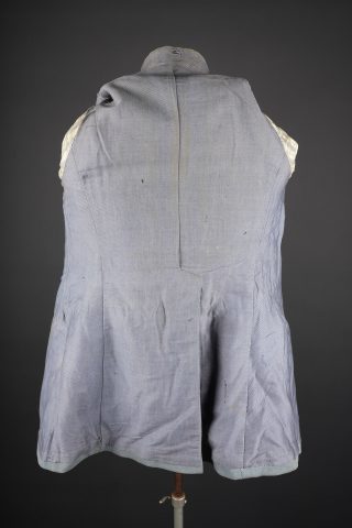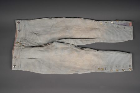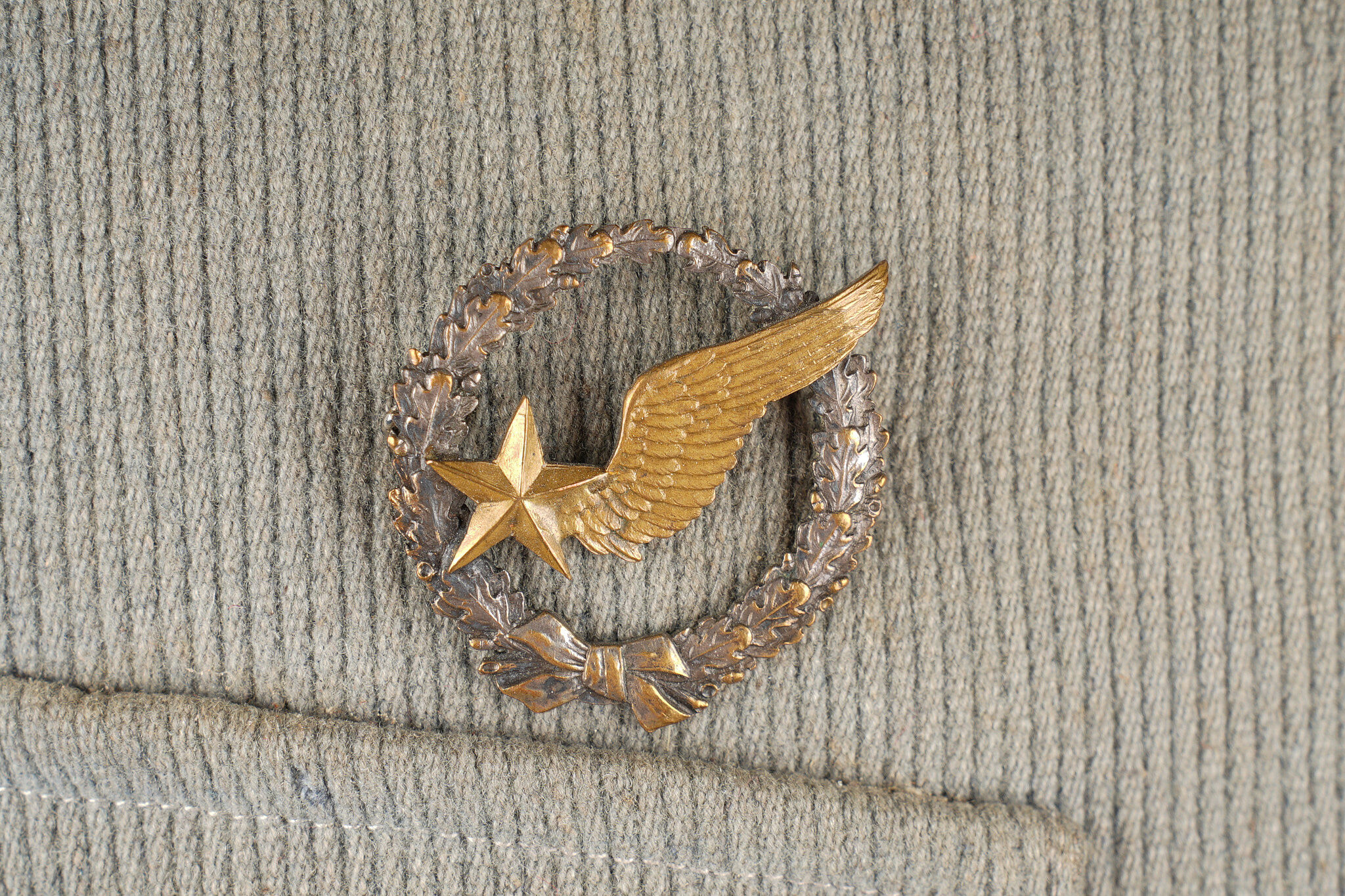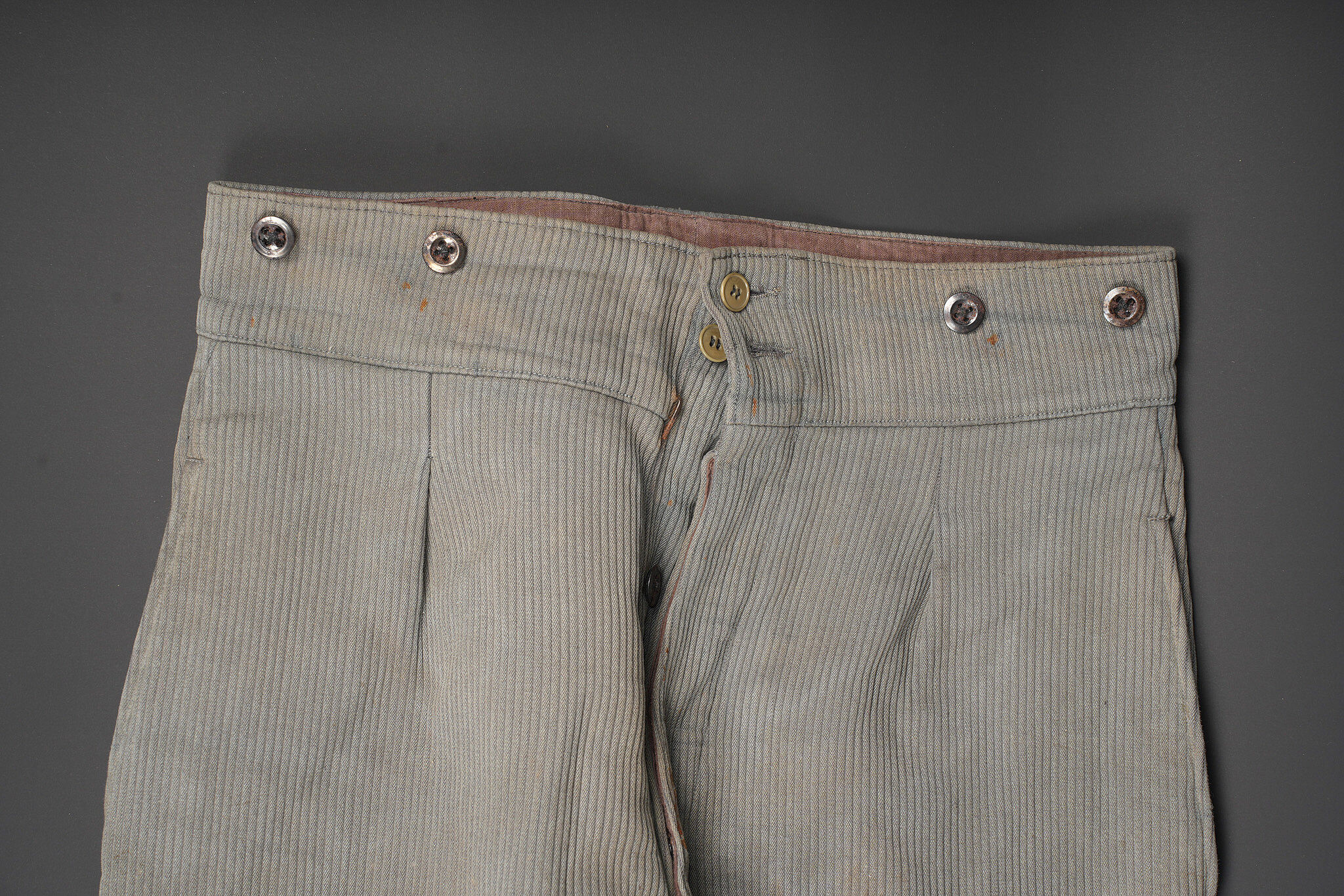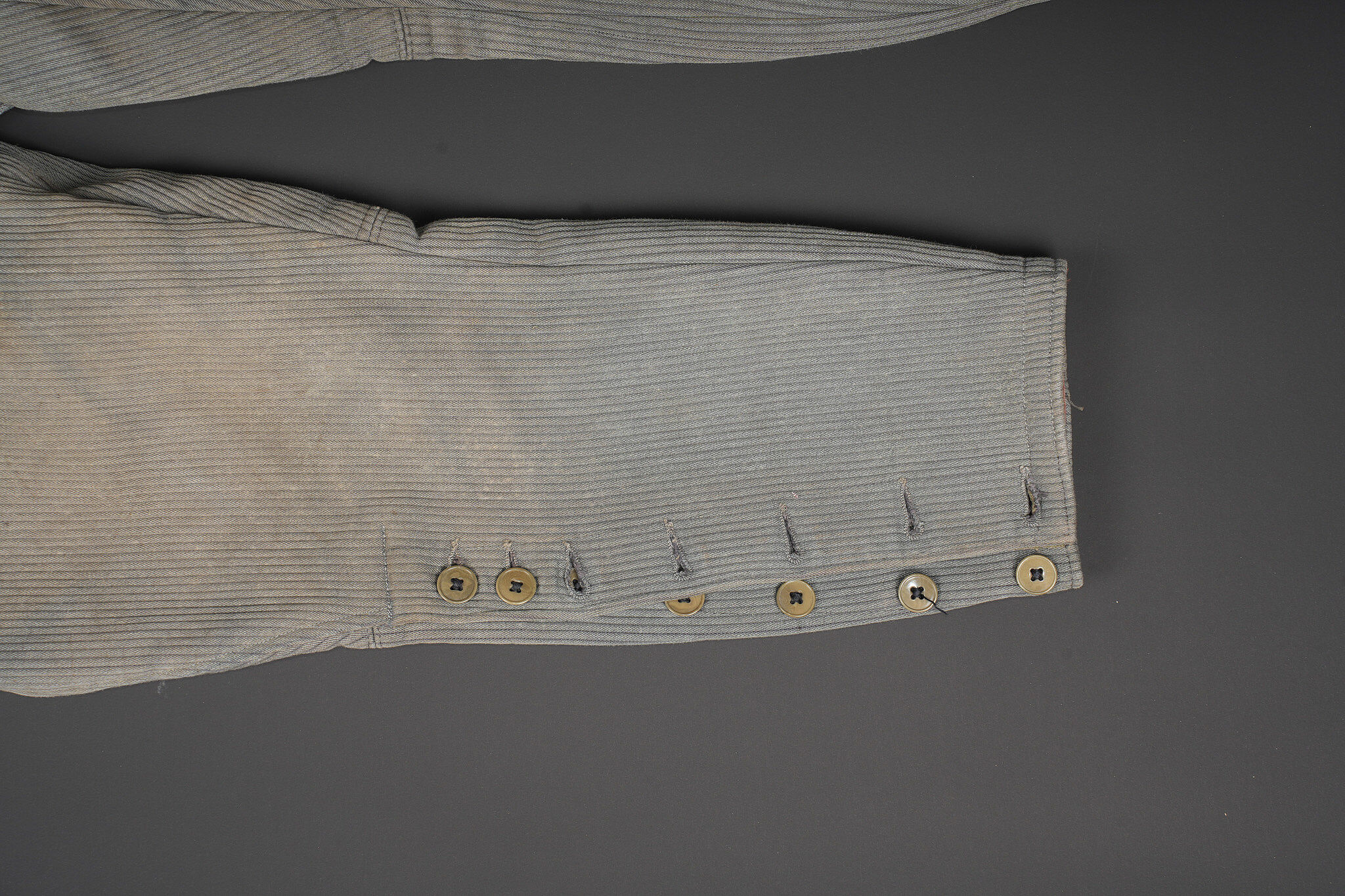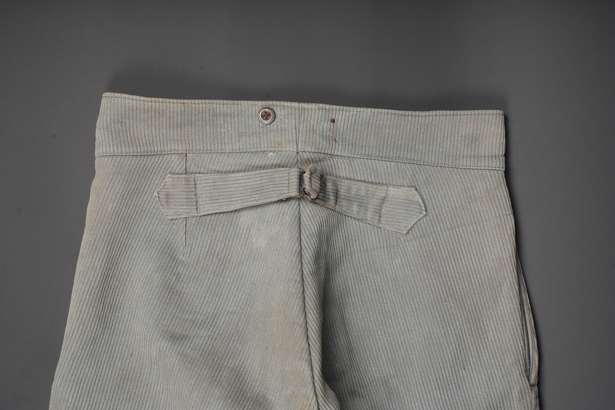 Ensemble velours bleu horizon. Comprenant une vareuse quatre poches confectionnée en velours bleu horizon et se fermant par sept boutons aux armes de l’infanterie. Les pattes de col portent des grenades métalliques indiquant que le soldat était rattaché à un état major. Sur le haut de la manche gauche se trouve cousu d’origine ses chevrons de présence au front. Au dessus de la poche de poitrine droite est cousu d’origine un brevet d’observateur numéroté B3264, doublure en satinette bleue et rayée. Culotte confectionnée en velours bleu horizon se fermant par six boutons dont deux absents, doublure en coton marron. Manchettes se fermant par sept boutons tous présents. Bandes molletières droites confectionnées dans un drap peigné bleu horizon, petits renforts de cuir et lacets présents. Bel ensemble homogène. Horizon blue velvet uniform set. Comprising a four pocket tunic made of horizon blue velvet and closing with seven infantry pattern buttons. Collar patches fitted with metal flaming grenades indicating attachment to a headquarters. Original overseas service chevrons sewn high on the left sleeve. Above the right breast pocket an observer qualification badge numbered B3264 originally sewn in place. Blue striped satinette lining. Breeches in horizon blue velvet closing with six buttons two missing and brown cotton lining. Cuffs closing with seven buttons all present. Straight puttees in combed horizon blue cloth with small leather reinforcements and retaining their laces. A fine matching set.