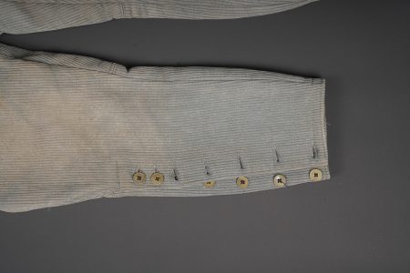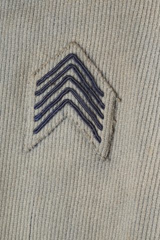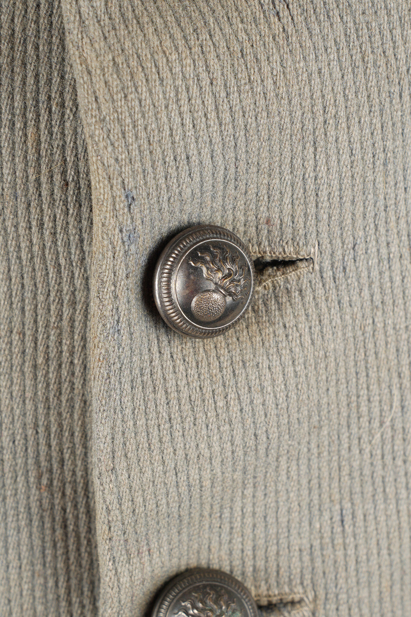 Détails de la vente >Ensemble velours bleu horizon. Comprenant une vareuse quatre poches confectionnée en velours bleu horizon et se fermant par sept boutons aux armes de l’infanterie. Les pattes de col portent... en savoir plus