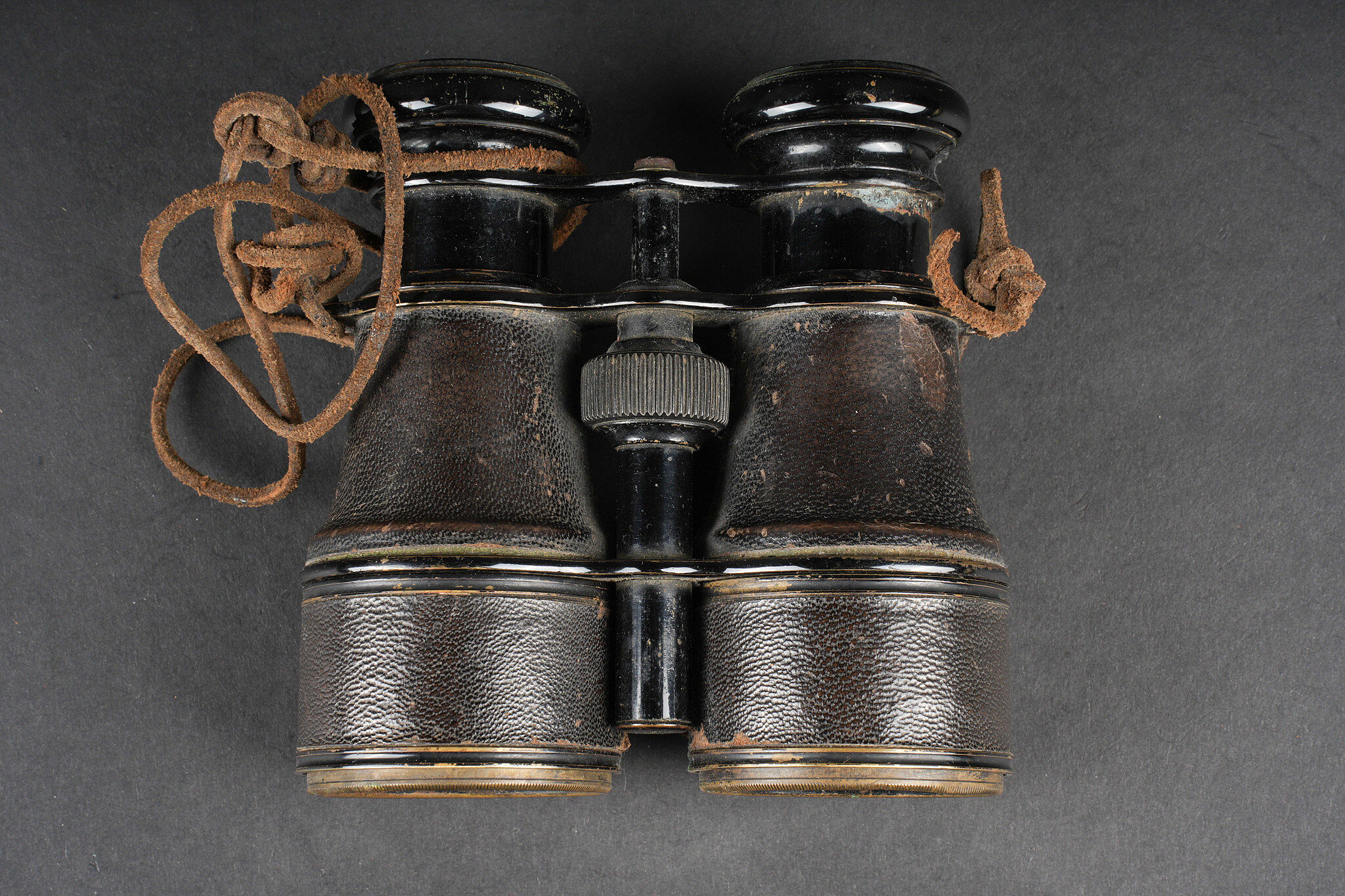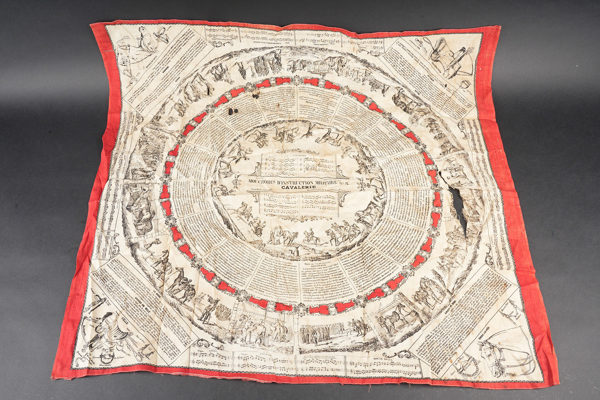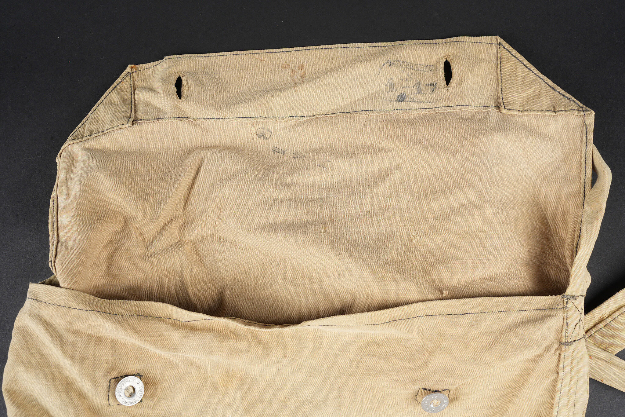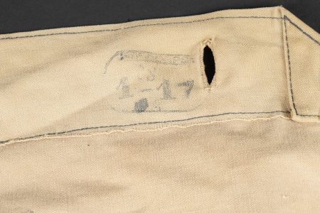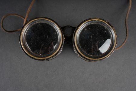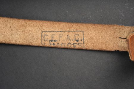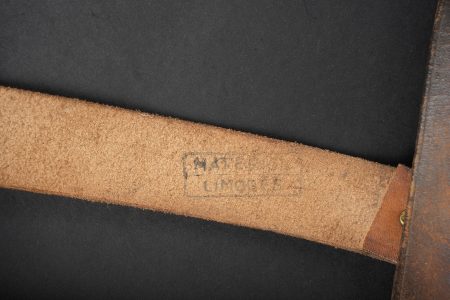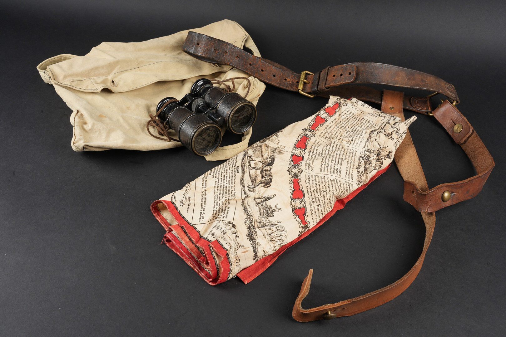 Equipements de cavalerie. Comprenant un ceinturon modèle 1884 troupe en cuir fauve, bélière de sabre en cuir fauve ainsi qu’une grande sangle en cuir rivetée postérieurement et sans lien avec le ceinturon. Traces de colle à l’intérieur du ceinturon. Un mouchoir d’instruction de cavalerie présentant de nombreux accrocs. Une paire de jumelles d’officier d’achat privé. Une musette 1892 en toile kaki claire avec un tampon postérieure. Cavalry equipment set. Comprising a model 1884 other ranks belt in fawn leather, a fawn leather sword hanger and a large riveted leather strap added later and unrelated to the belt. Traces of glue inside the belt. A cavalry instruction handkerchief with numerous damages. A pair of privately purchased officer’s field glasses. A model 1892 haversack in light khaki canvas with later stamp.