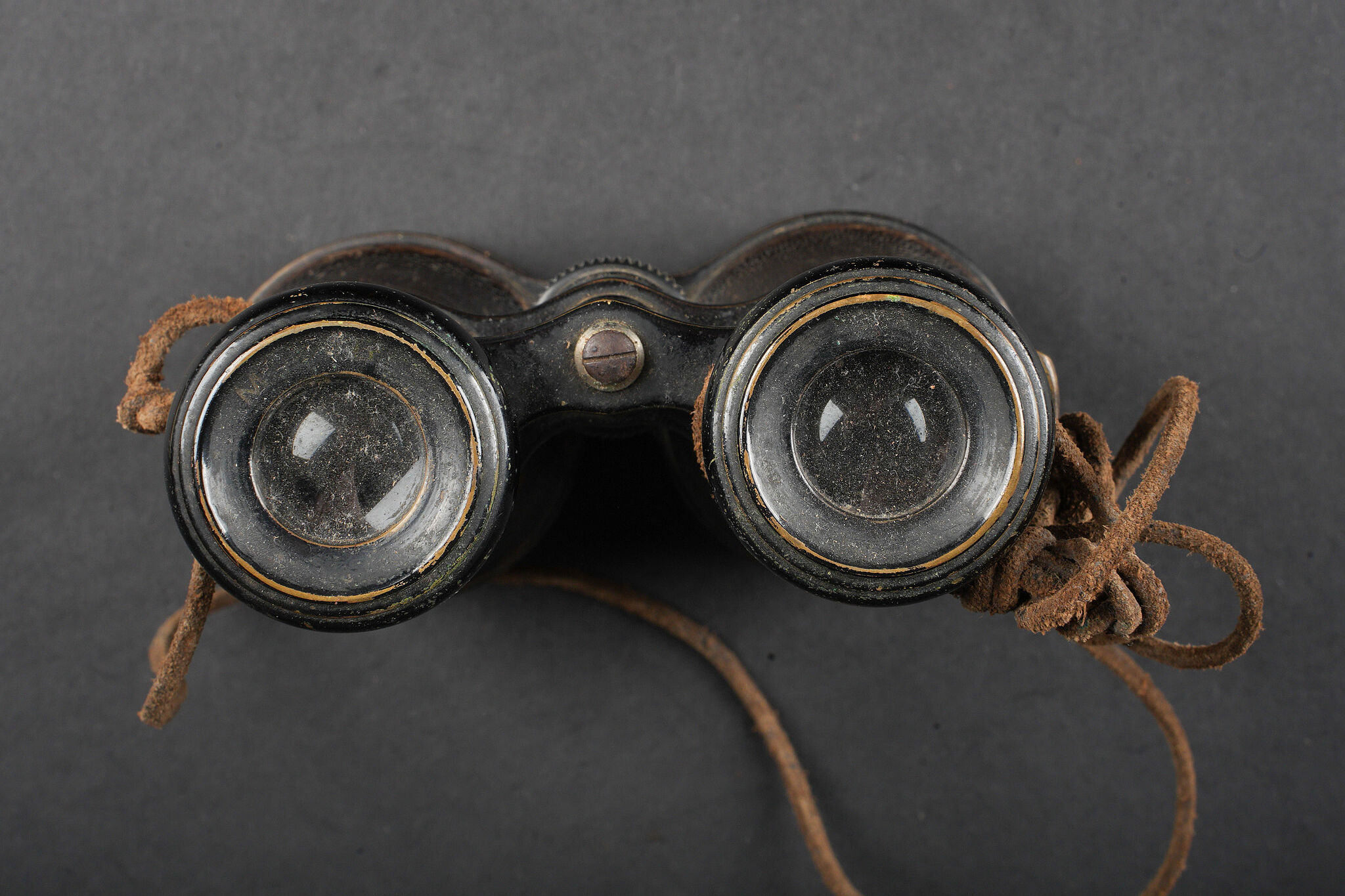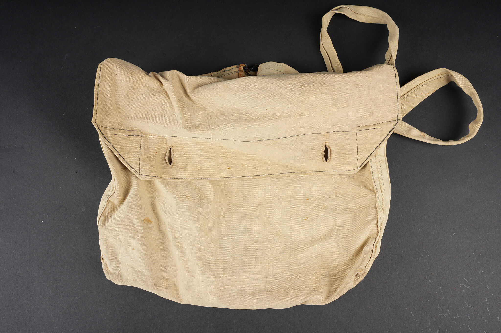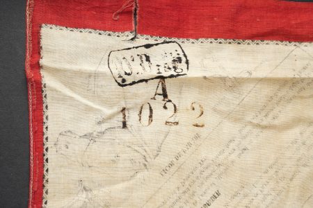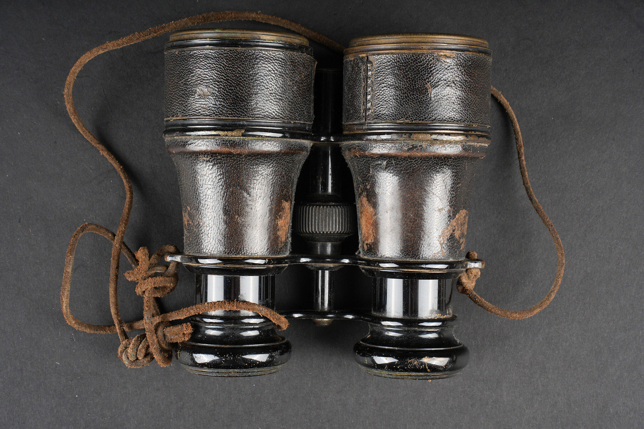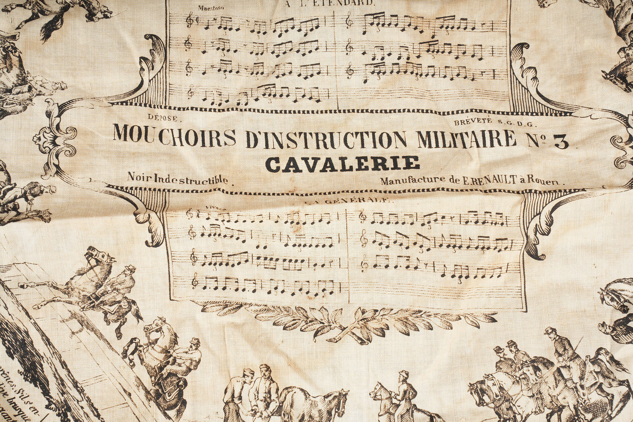 Equipements de cavalerie. Comprenant un ceinturon modèle 1884 troupe en cuir fauve, bélière de sabre en cuir fauve ainsi qu’une grande sangle en cuir rivetée postérieurement et sans lien avec le ceinturon. Traces de colle à l’intérieur du ceinturon. Un mouchoir d’instruction de cavalerie présentant de nombreux accrocs. Une paire de jumelles d’officier d’achat privé. Une musette 1892 en toile kaki claire avec un tampon postérieure. Cavalry equipment set. Comprising a model 1884 other ranks belt in fawn leather, a fawn leather sword hanger and a large riveted leather strap added later and unrelated to the belt. Traces of glue inside the belt. A cavalry instruction handkerchief with numerous damages. A pair of privately purchased officer’s field glasses. A model 1892 haversack in light khaki canvas with later stamp.