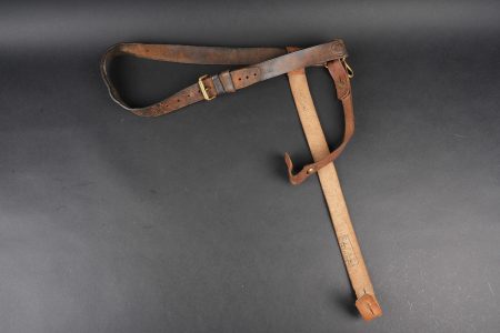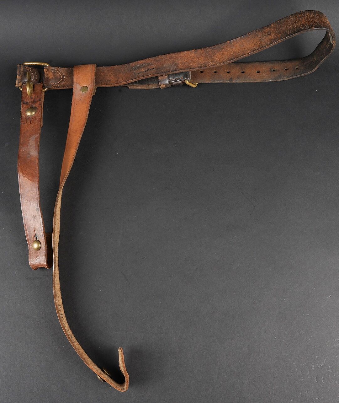 Détails de la vente >Equipements de cavalerie. Comprenant un ceinturon modèle 1884 troupe en cuir fauve, bélière de sabre en cuir fauve ainsi qu’une grande sangle en cuir rivetée postérieurement et sans... en savoir plus