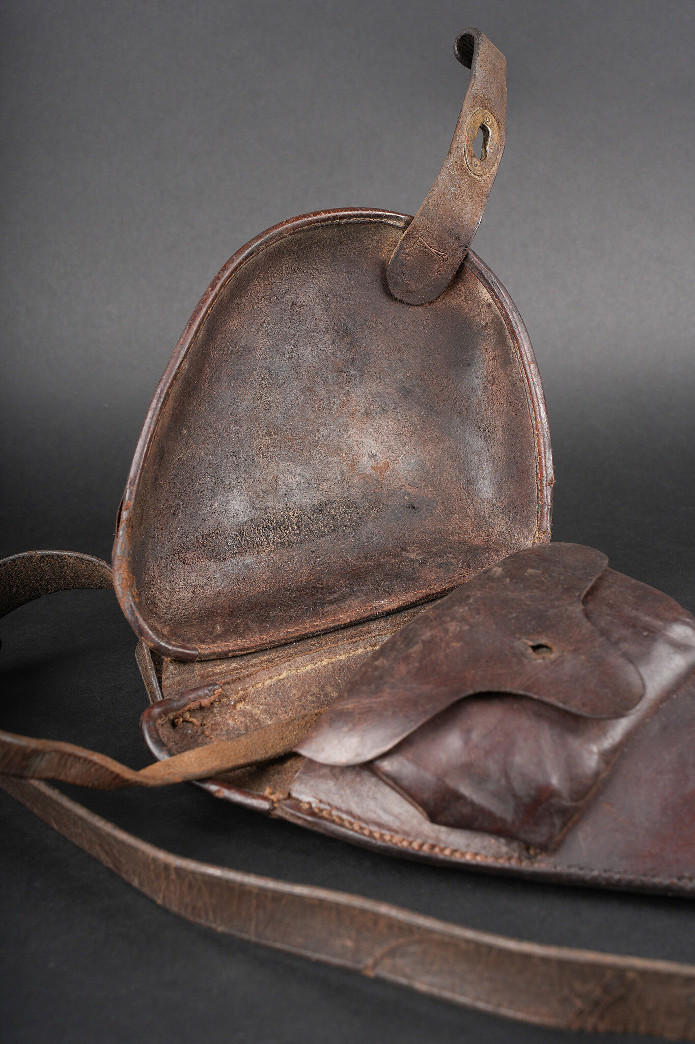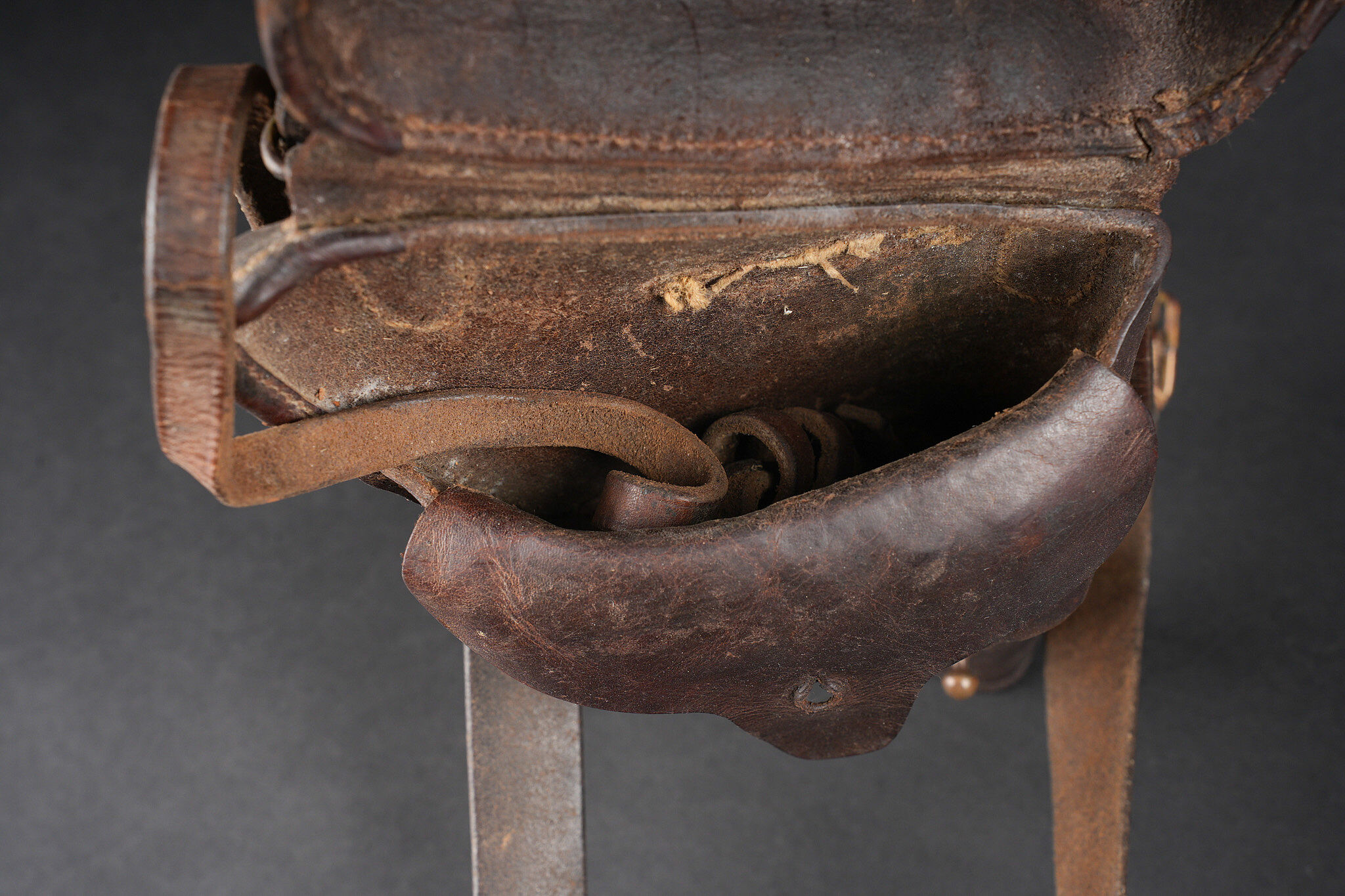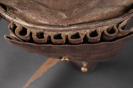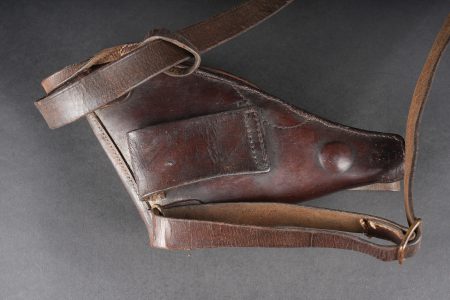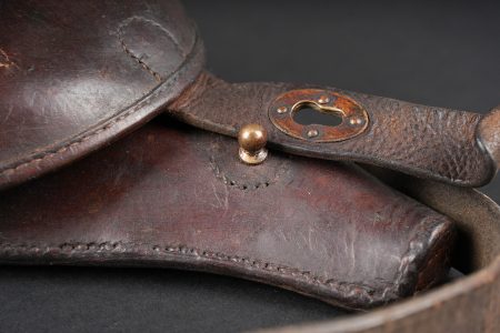 Etui de jambon 1873. Etui dit jambon en cuir brun fortement graissé pour modèle 1873, pas de tampon visible. Sous le rabat douze alvéoles à cartouches sont présentes. Courroie de transport montée d’origine ainsi que sa dragonne. Revolver holster Model 1873, jambon pattern. Heavily greased brown leather, no visible stamp. Twelve cartridge loops under the flap. Original shoulder strap and revolver lanyard.