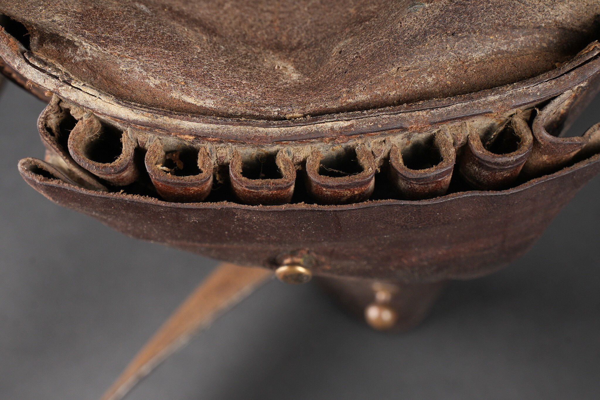 Détails de la vente >Etui de jambon 1873. Etui dit jambon en cuir brun fortement graissé pour modèle 1873, pas de tampon visible. Sous le rabat douze alvéoles à cartouches sont présentes. Courroie de transport... en savoir plus