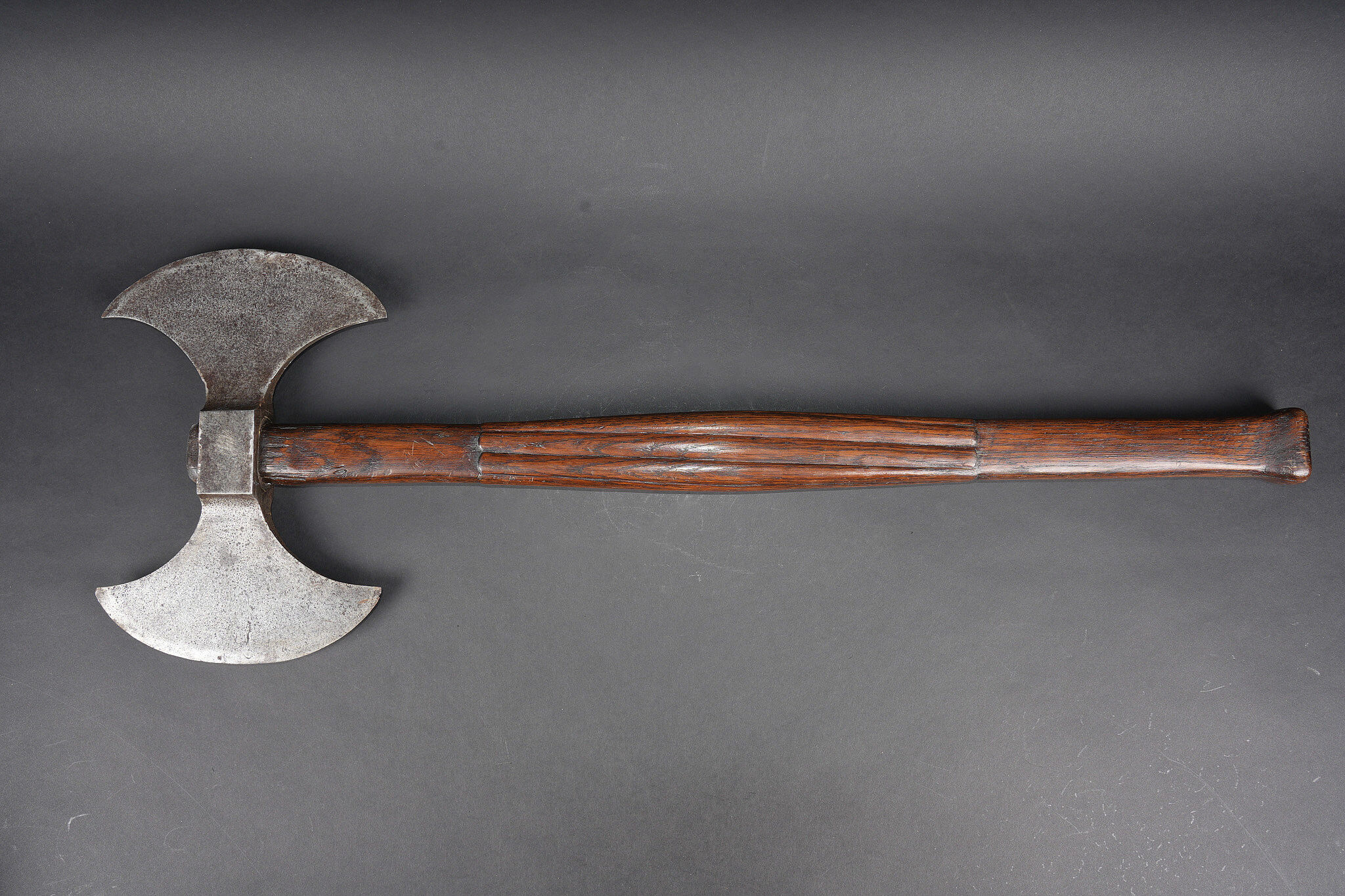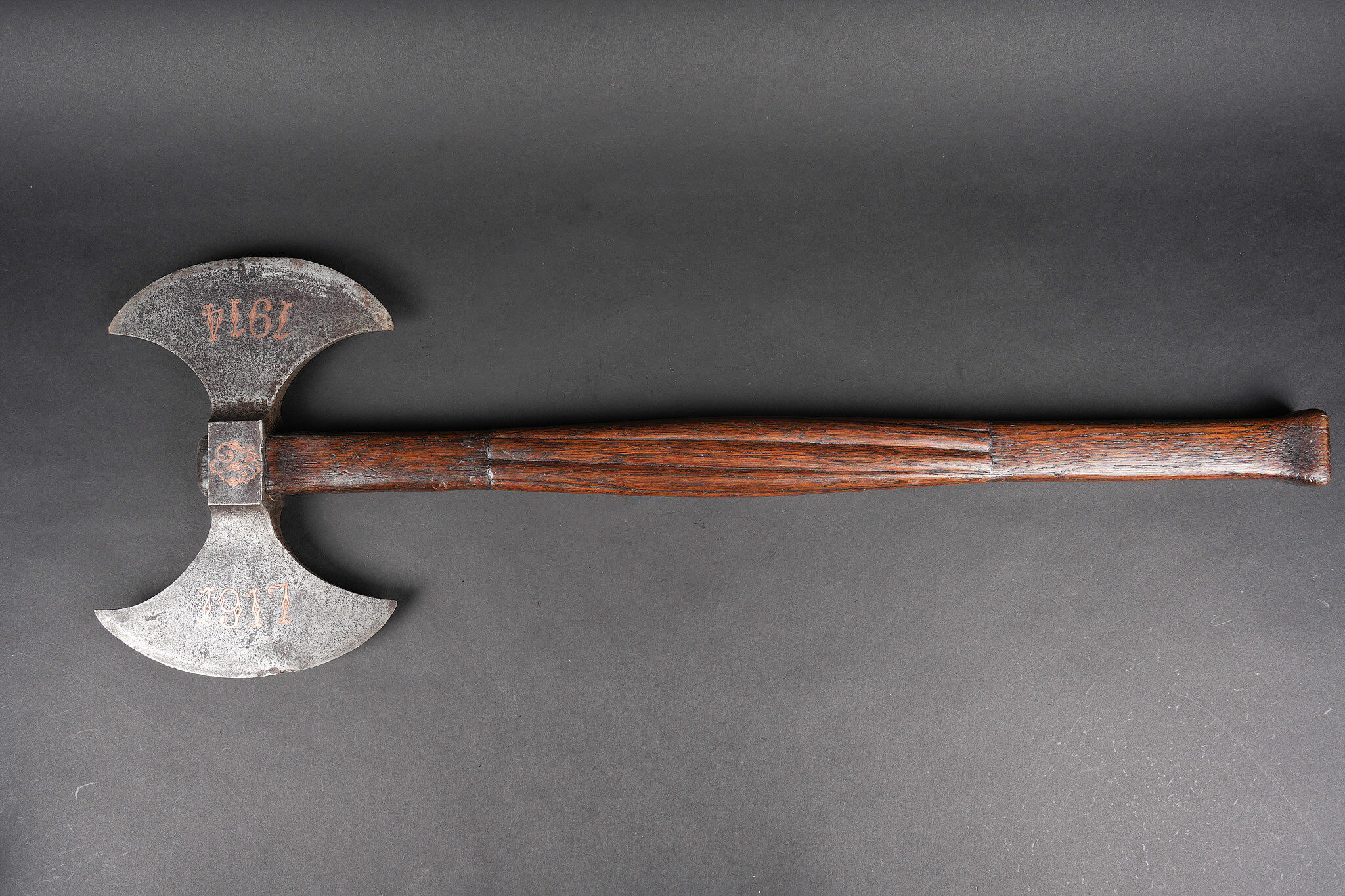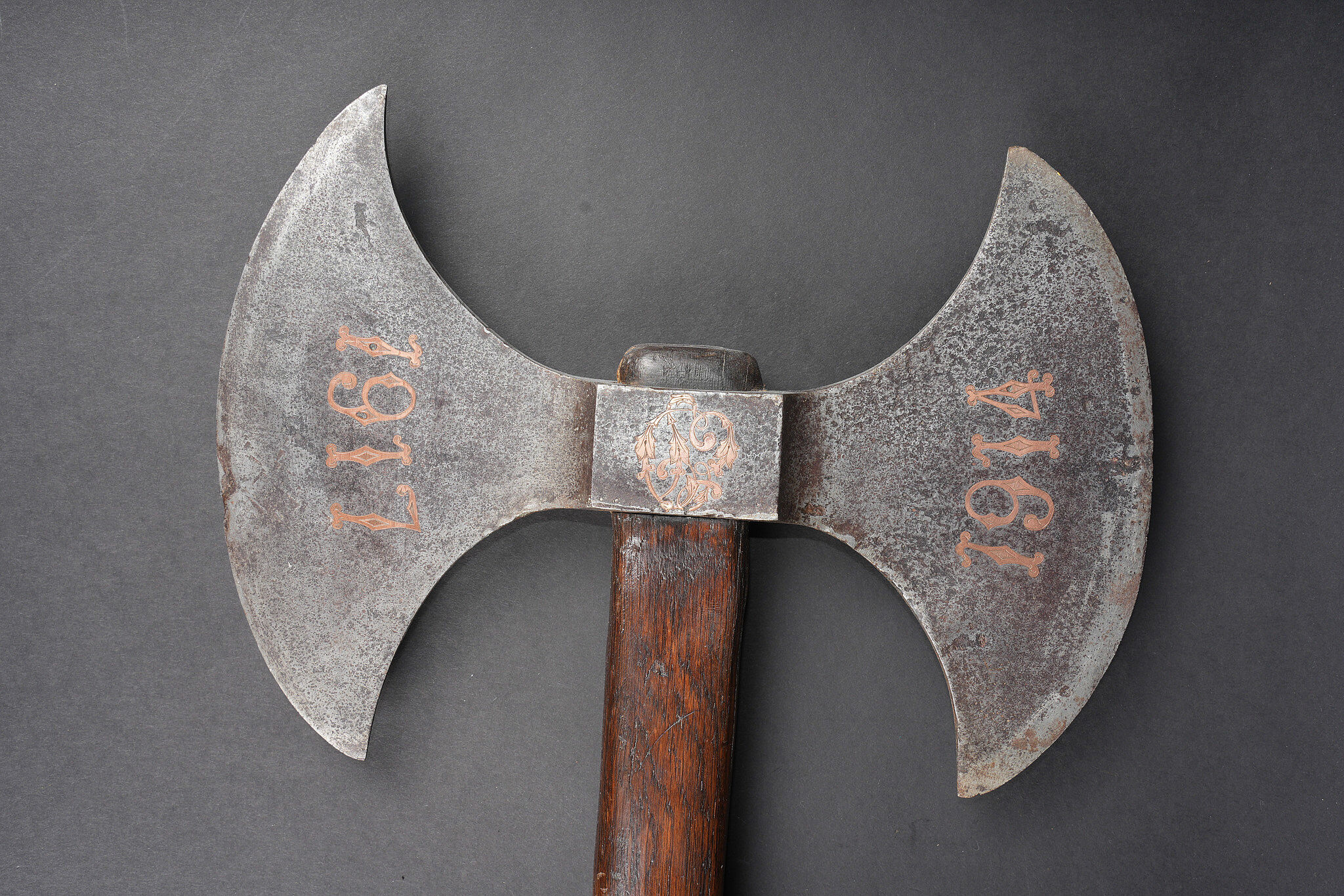 Francisque artisanat de tranchée. Grande et spectaculaire francisque en artisanat de tranchée. Hache à deux fers longue d’environ 78,5 cm et largeur des fers environ 27,5 cm. Avec de très jolies inclusions de cuivres avec les chiffres 1914 et 1917 sur les joues des fers, et des initiales en motifs végétaux entrelacés sur la partie centrale. Manche en bois vernis travaillé. Rare surtout avec ces dimensions. Trench art francisca Large and striking trench art francisca. Double-headed axe measuring approximately 78.5 cm in length, with blade width of approximately 27.5 cm. Decorated with fine brass inlays bearing the dates 1914 and 1917 on the blade faces, together with intertwined vegetal motifs and initials at the central section. Worked varnished wooden shaft. A rare example, particularly in this impressive size.