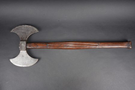 Détails de la vente >Francisque artisanat de tranchée. Grande et spectaculaire francisque en artisanat de tranchée. Hache à deux fers longue d’environ 78,5 cm et largeur des fers environ 27,5 cm. Avec de... en savoir plus