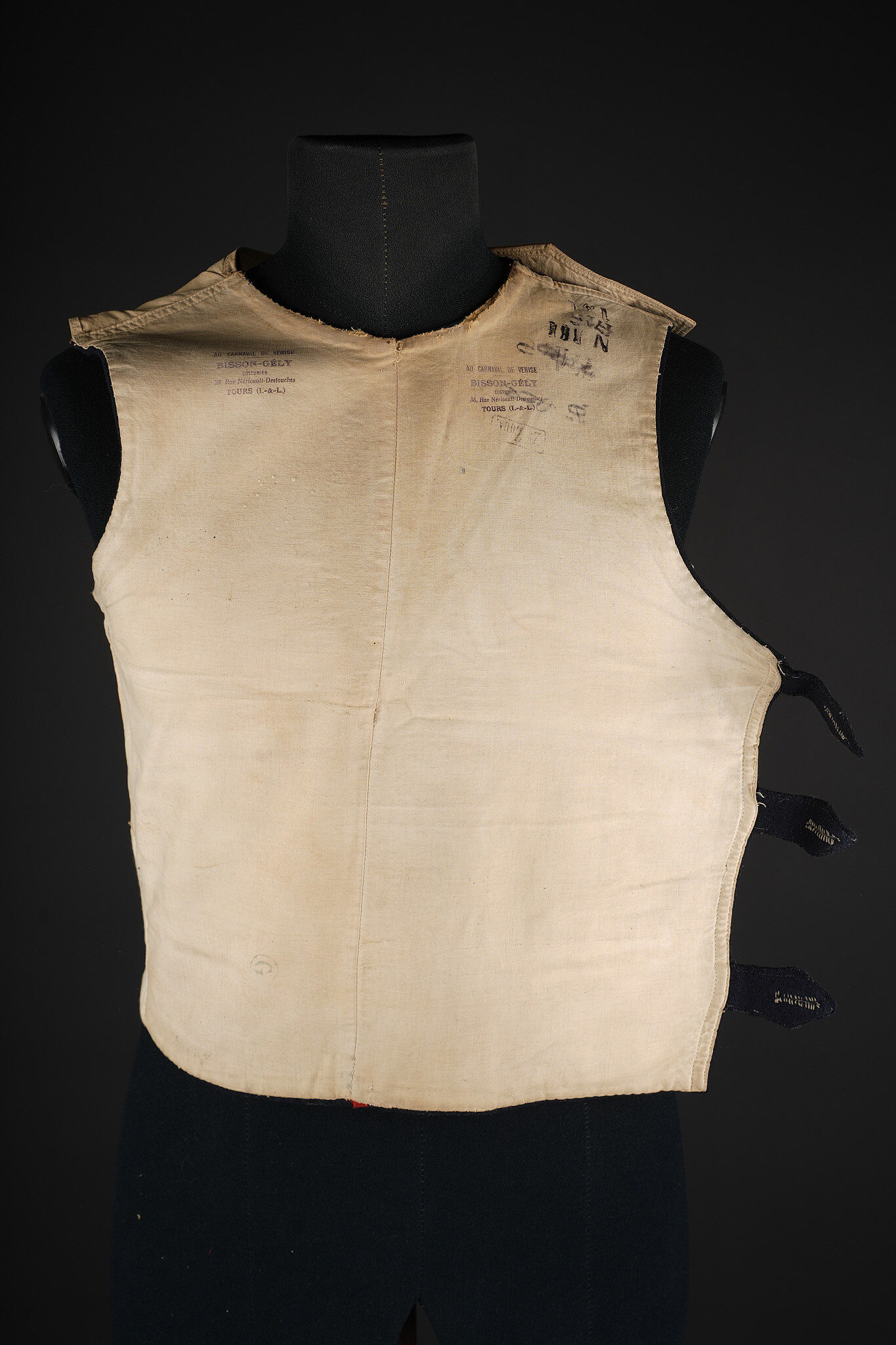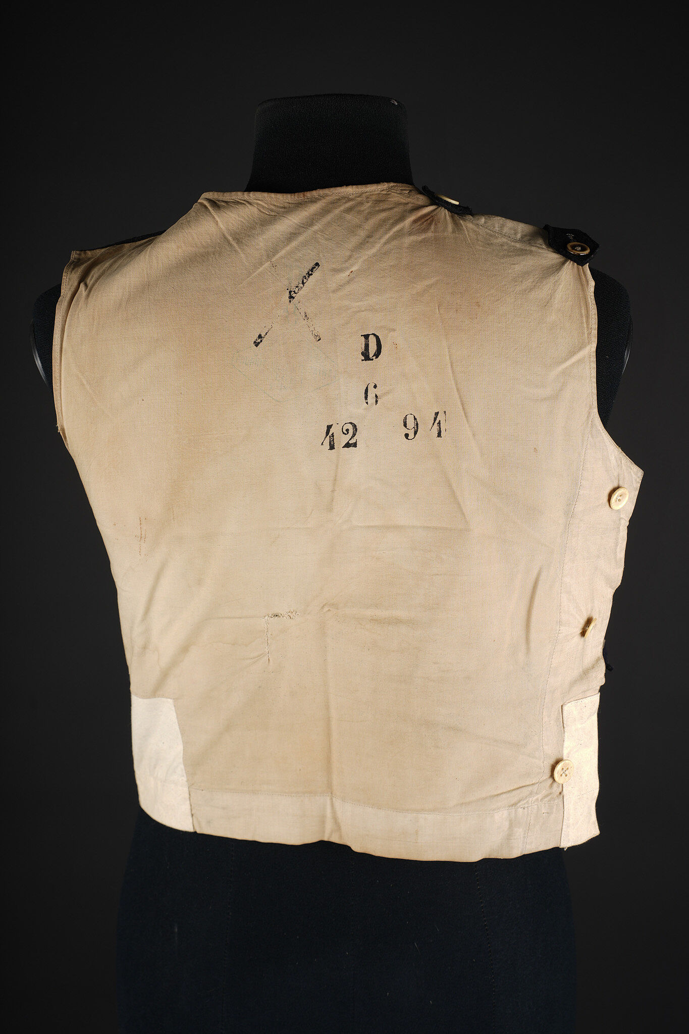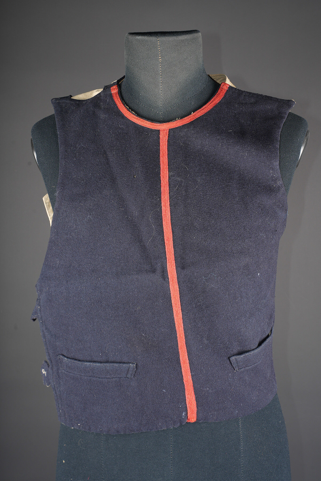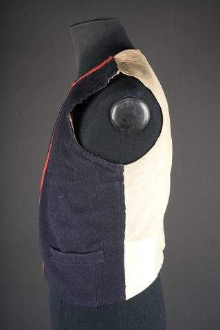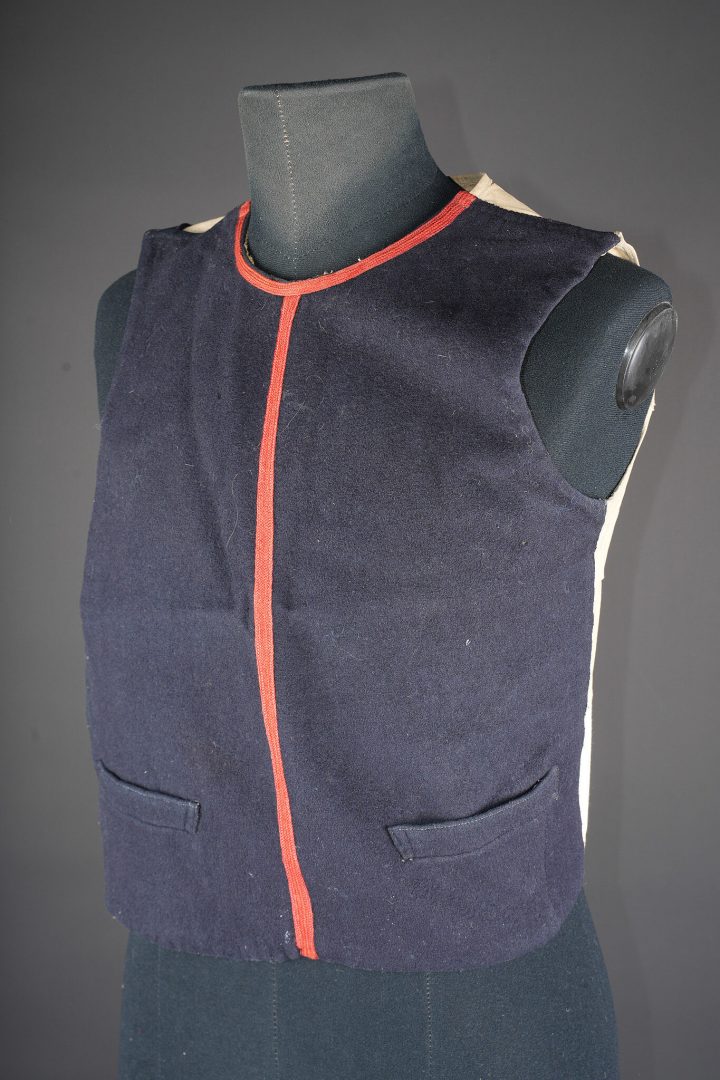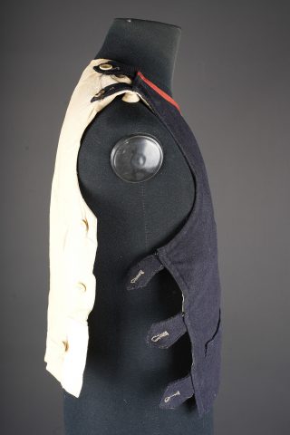 Gilet 1879 2ème zouaves. Gilet en drap bleu foncé, doublure en coton écru portant un tampon du 2ème zouaves, divers matricules ainsi que le tampon d’un costumier à Tours. Deux pattes de fermeture à l’épaule droite ainsi que trois pattes sur le flanc droit. 2nd Zouaves waistcoat, Model 1879. Dark blue cloth with ecru cotton lining stamped to the 2nd Zouaves, various issue numbers and a Tours tailor’s mark. Two fastening tabs at the right shoulder and three on the right side.
