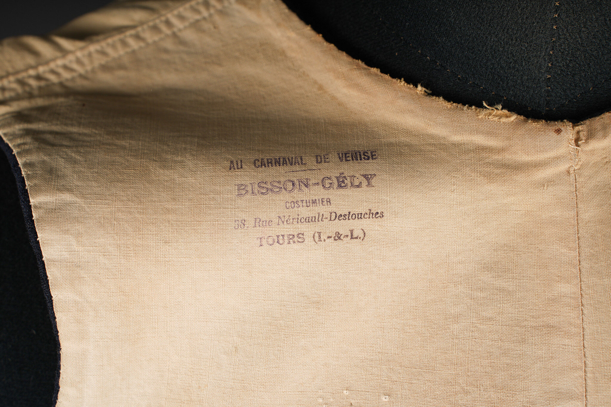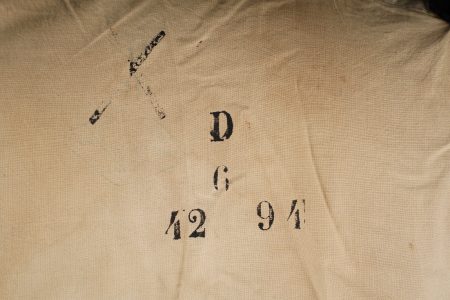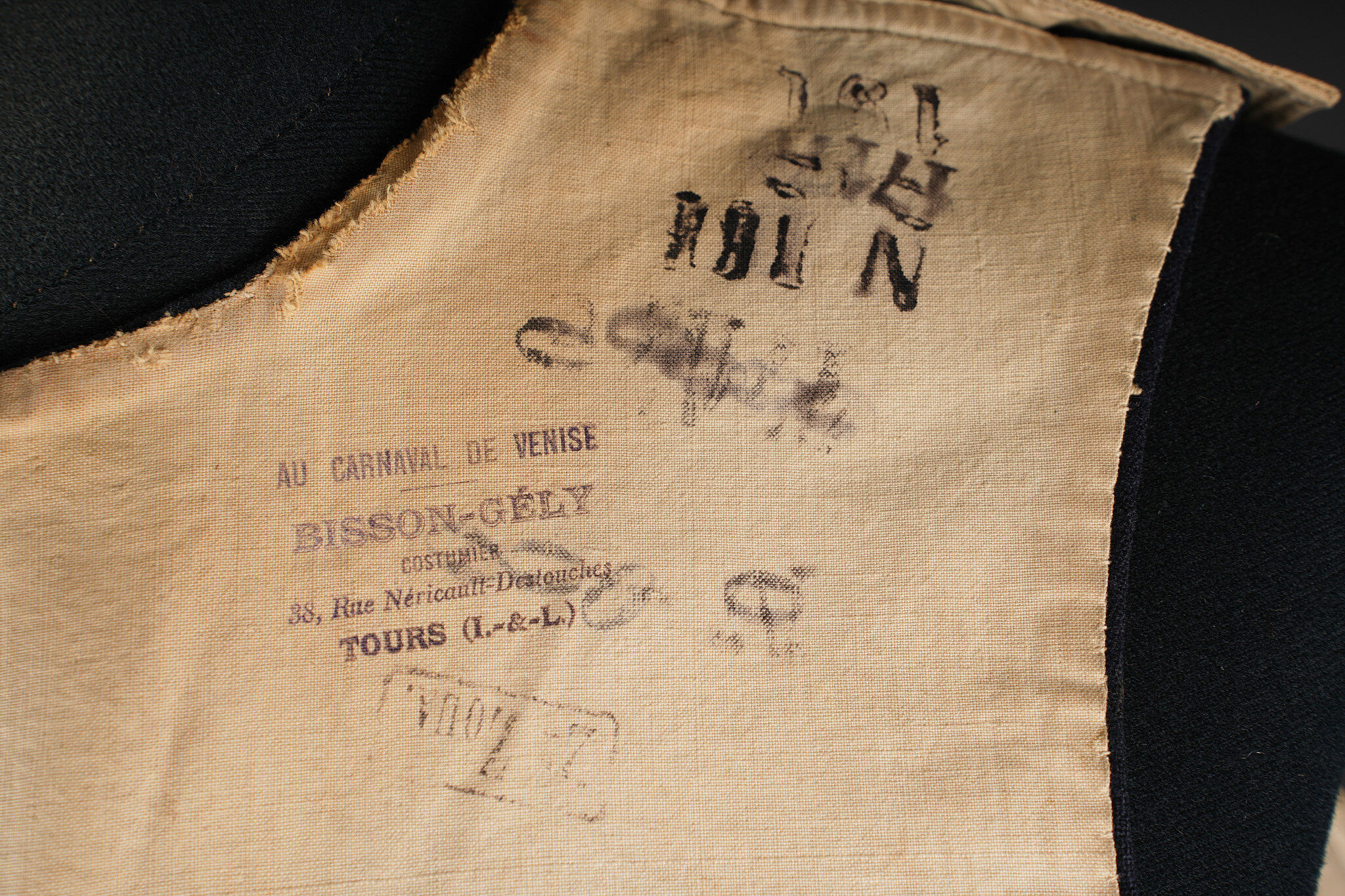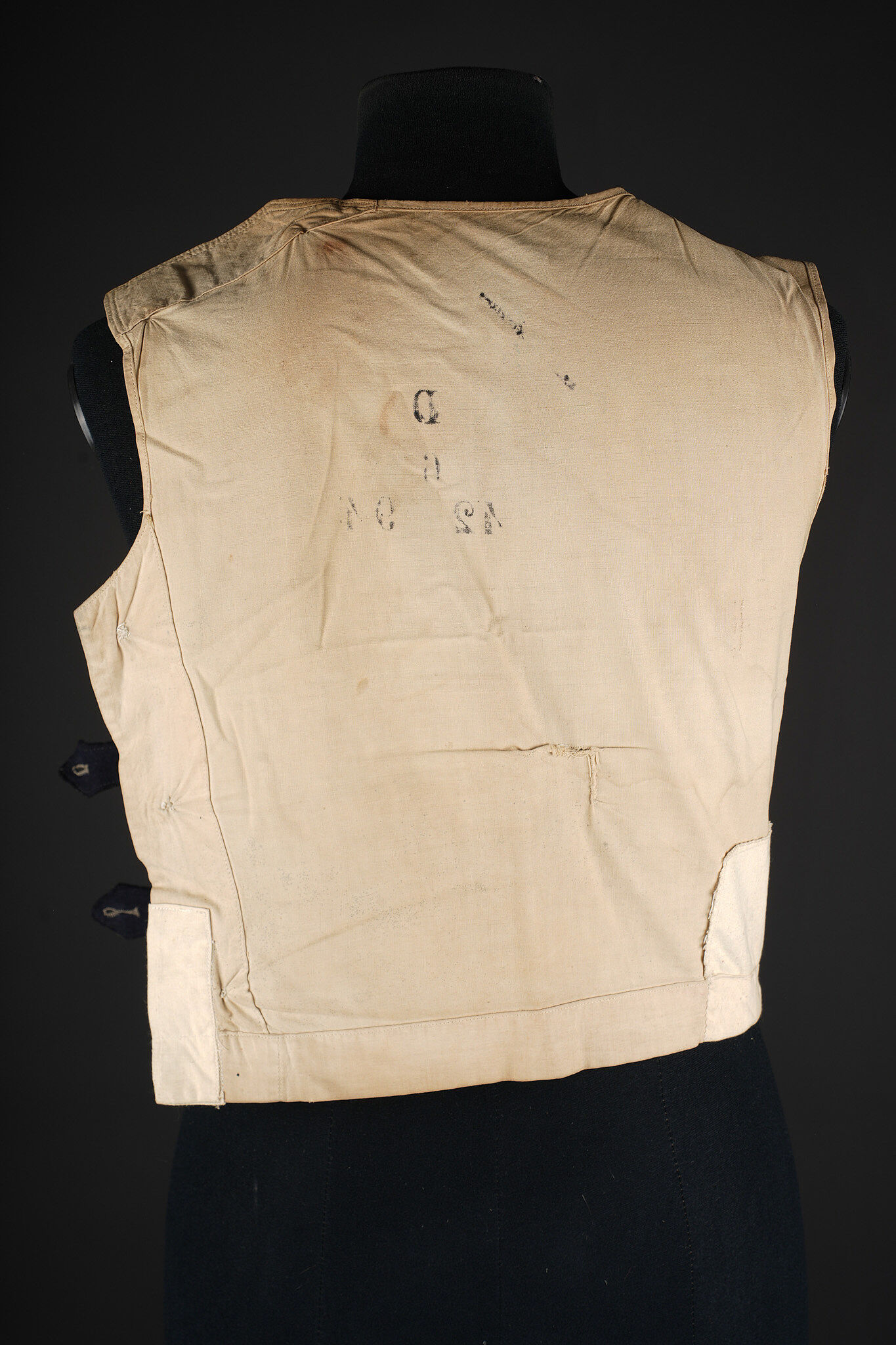 Gilet 1879 2ème zouaves. Gilet en drap bleu foncé, doublure en coton écru portant un tampon du 2ème zouaves, divers matricules ainsi que le tampon d’un costumier à Tours. Deux pattes de fermeture à l’épaule droite ainsi que trois pattes sur le flanc droit. 2nd Zouaves waistcoat, Model 1879. Dark blue cloth with ecru cotton lining stamped to the 2nd Zouaves, various issue numbers and a Tours tailor’s mark. Two fastening tabs at the right shoulder and three on the right side.