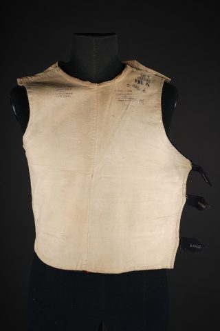 Gilet 1879 2ème zouaves. Gilet en drap bleu foncé, doublure en coton écru portant un tampon du 2ème zouaves, divers matricules ainsi que le tampon d’un costumier à Tours. Deux pattes de... en savoir plus