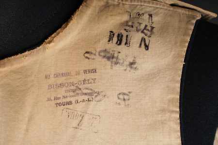 Détails de la vente >Gilet 1879 2ème zouaves. Gilet en drap bleu foncé, doublure en coton écru portant un tampon du 2ème zouaves, divers matricules ainsi que le tampon d’un costumier à Tours. Deux pattes de... en savoir plus