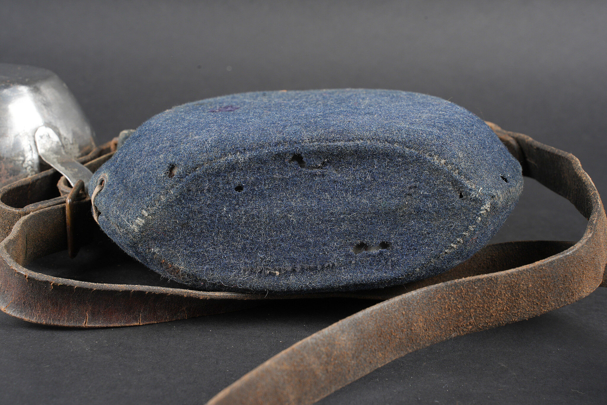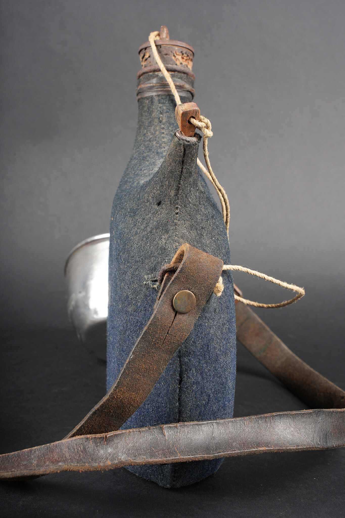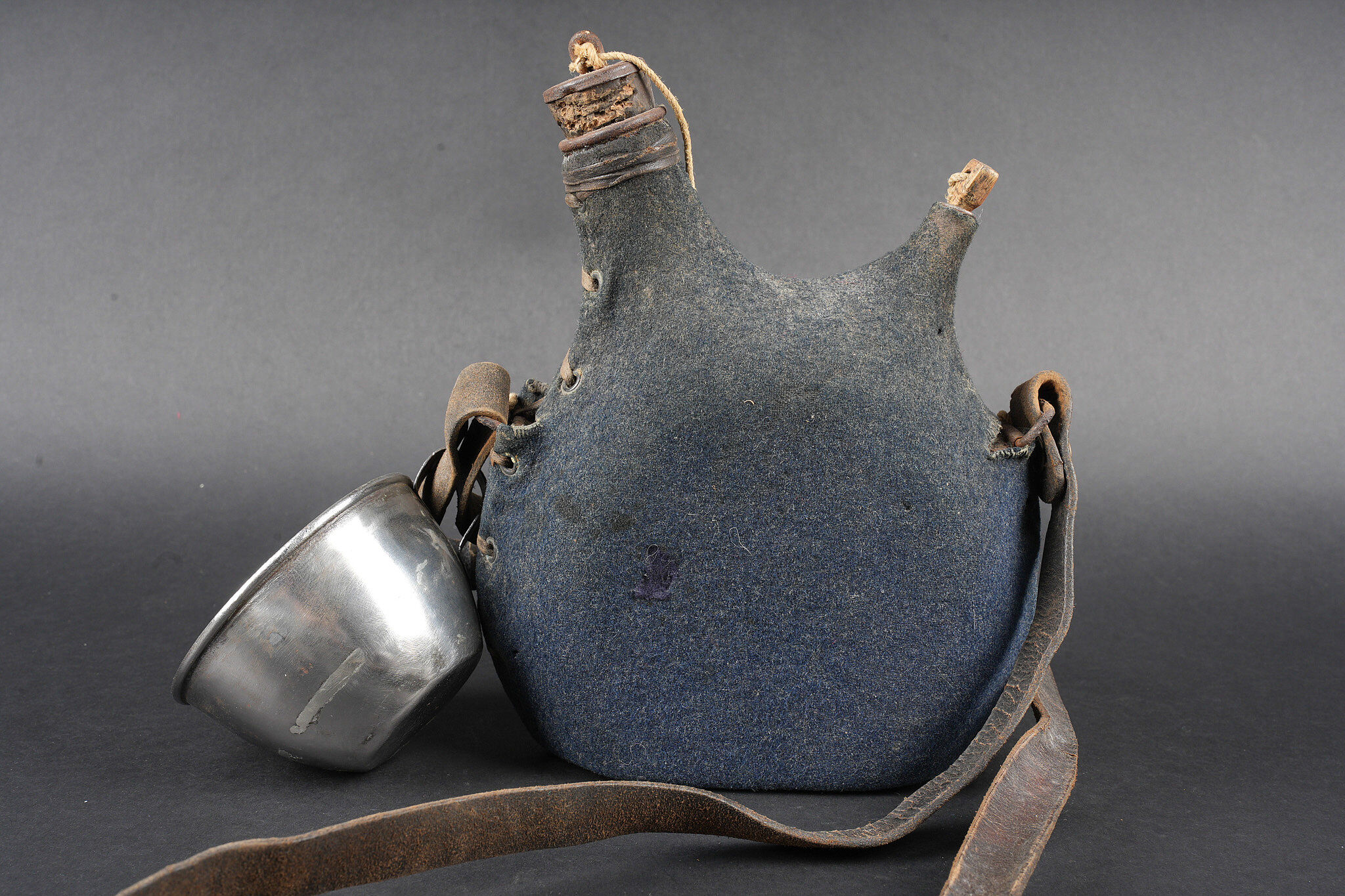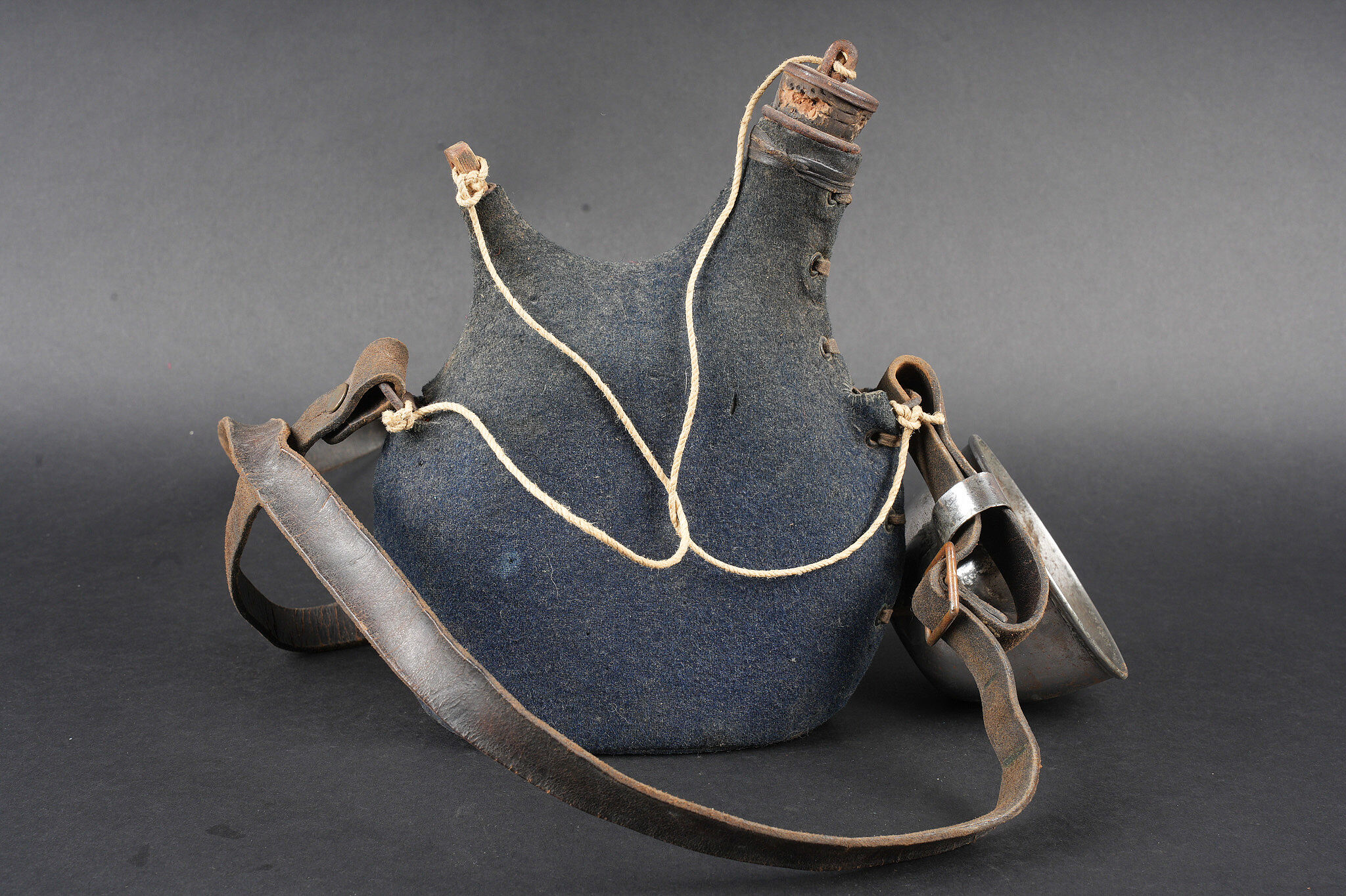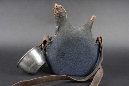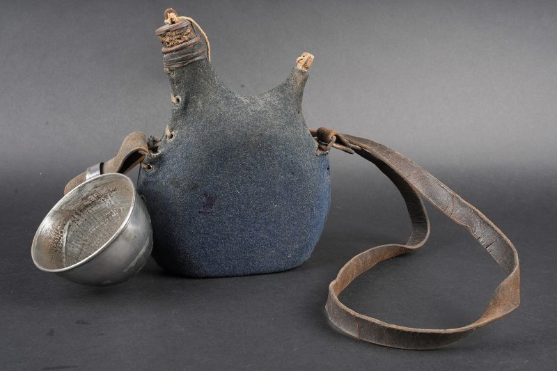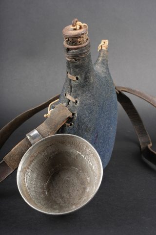 Gourde 1877 un litre. Bidon en fer étamé recouvert d’une housse en drap gris de fer bleuté, les bouchons sont présents. Courroie en cuir d’origine, quart réglementaire en fer. Water bottle Model 1877, one-litre capacity. Tinned iron flask covered with a blue-grey cloth field cover, both stoppers present. Original leather carrying strap. Regulation iron drinking cup.