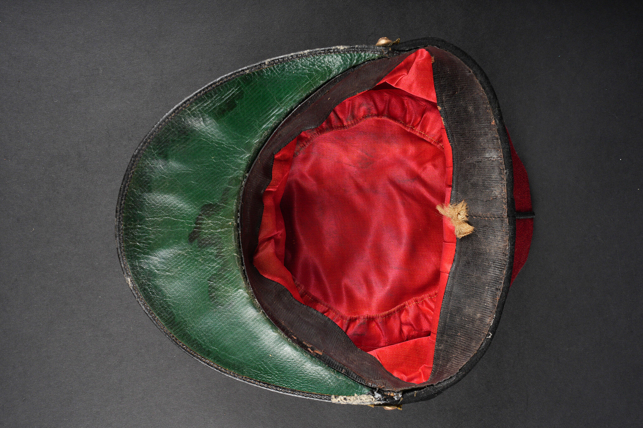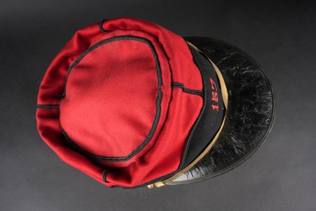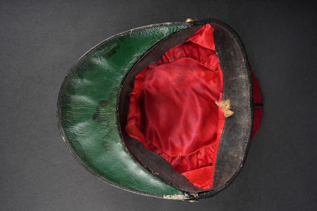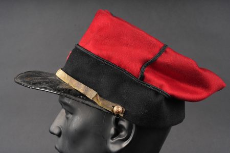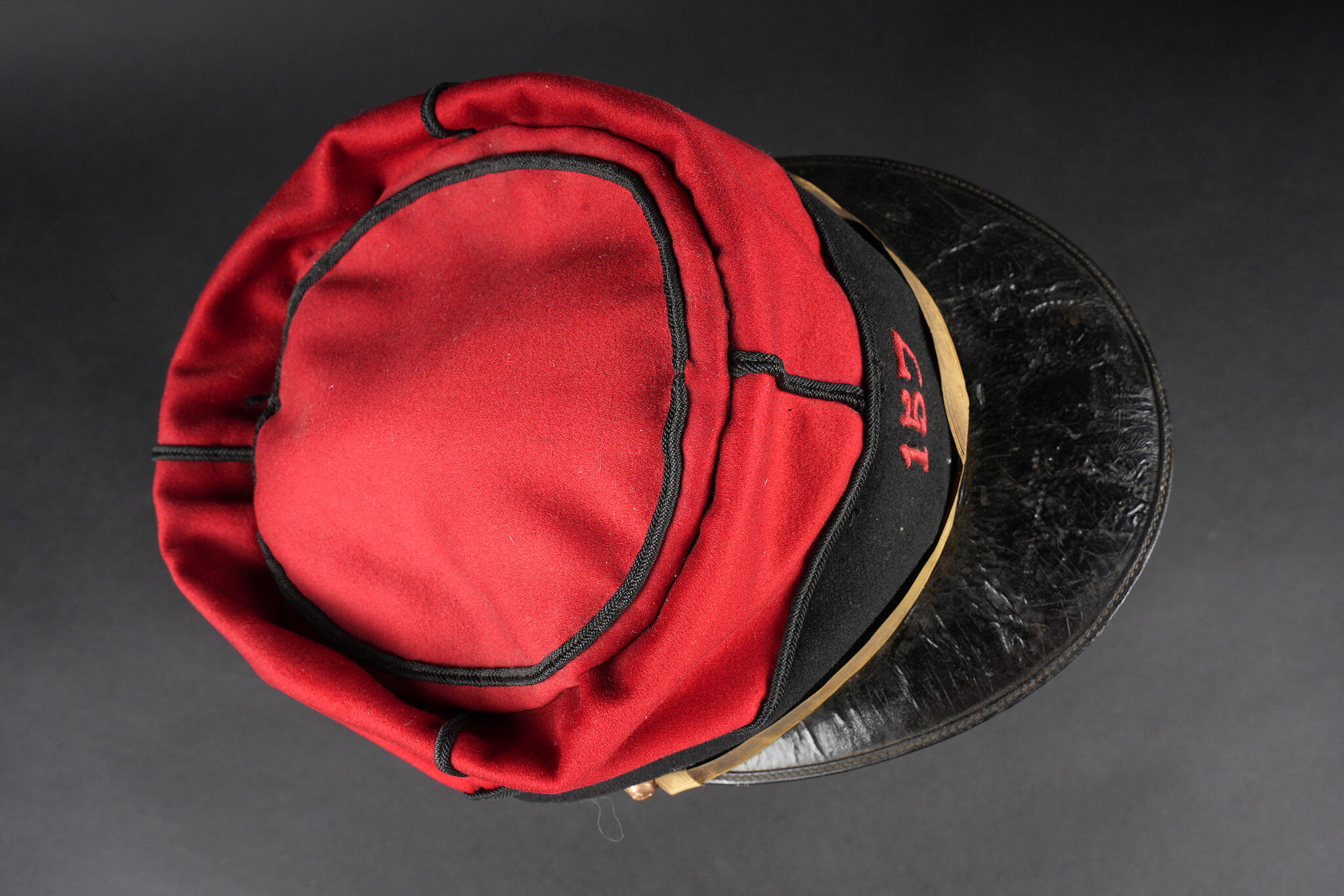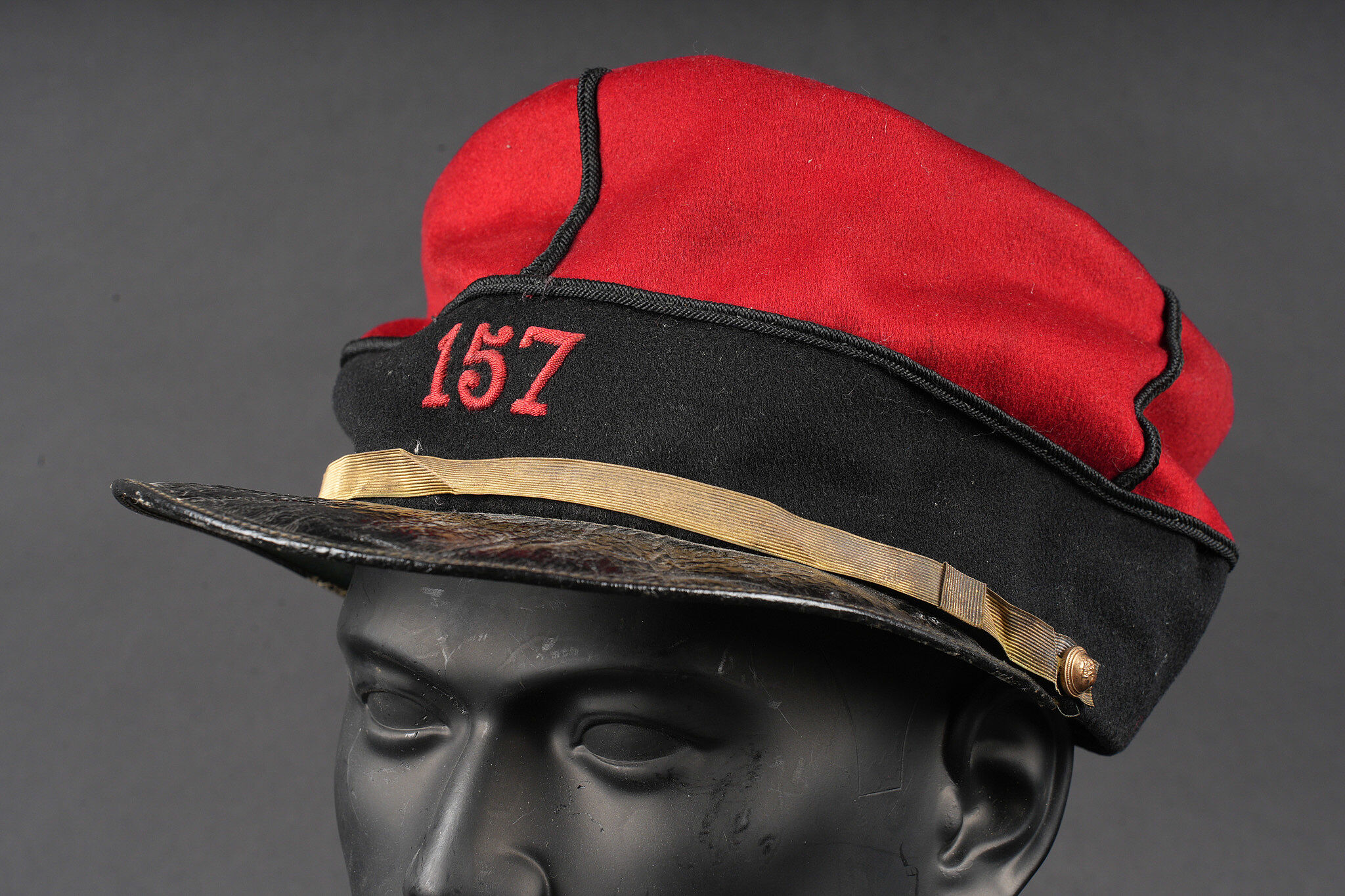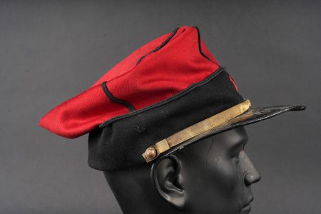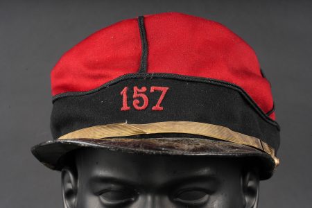 Képi 157ème d’infanterie. En drap garance avec bandeau en drap noir. Passepoil tressé noir du modèle troupe chiffre 157 brodé au fil de coton rouge identifiant le 157ème régiment d’infanterie de Gap. Fausse jugulaire dorée retenue par deux petits boutons aux armes de l’infanterie. Bandeau de sudation en cuir noir, visière en cuir doublée de maroquin vert, satinette en soie rouge. Quelques coutures ont cédé. Kepi 157th Infantry Regiment. Garance cloth with black cloth band. Black braided piping other ranks pattern number 157 embroidered in red cotton identifying the 157th Infantry Regiment of Gap. Gilt false chinstrap held by two small infantry buttons. Black leather sweatband leather peak lined in green morocco red silk lining. Some loose stitching.