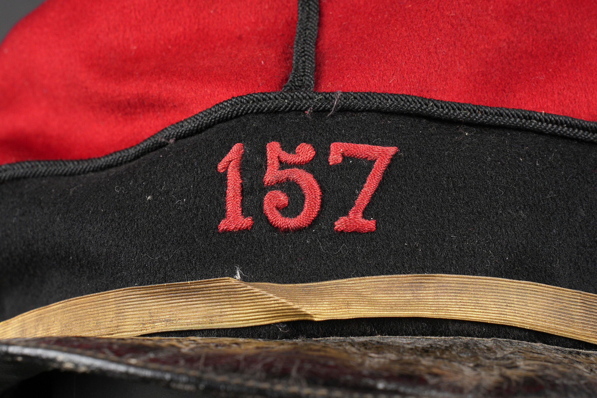 Détails de la vente >Képi 157ème d’infanterie. En drap garance avec bandeau en drap noir. Passepoil tressé noir du modèle troupe chiffre 157 brodé au fil de coton rouge identifiant le 157ème régiment... en savoir plus