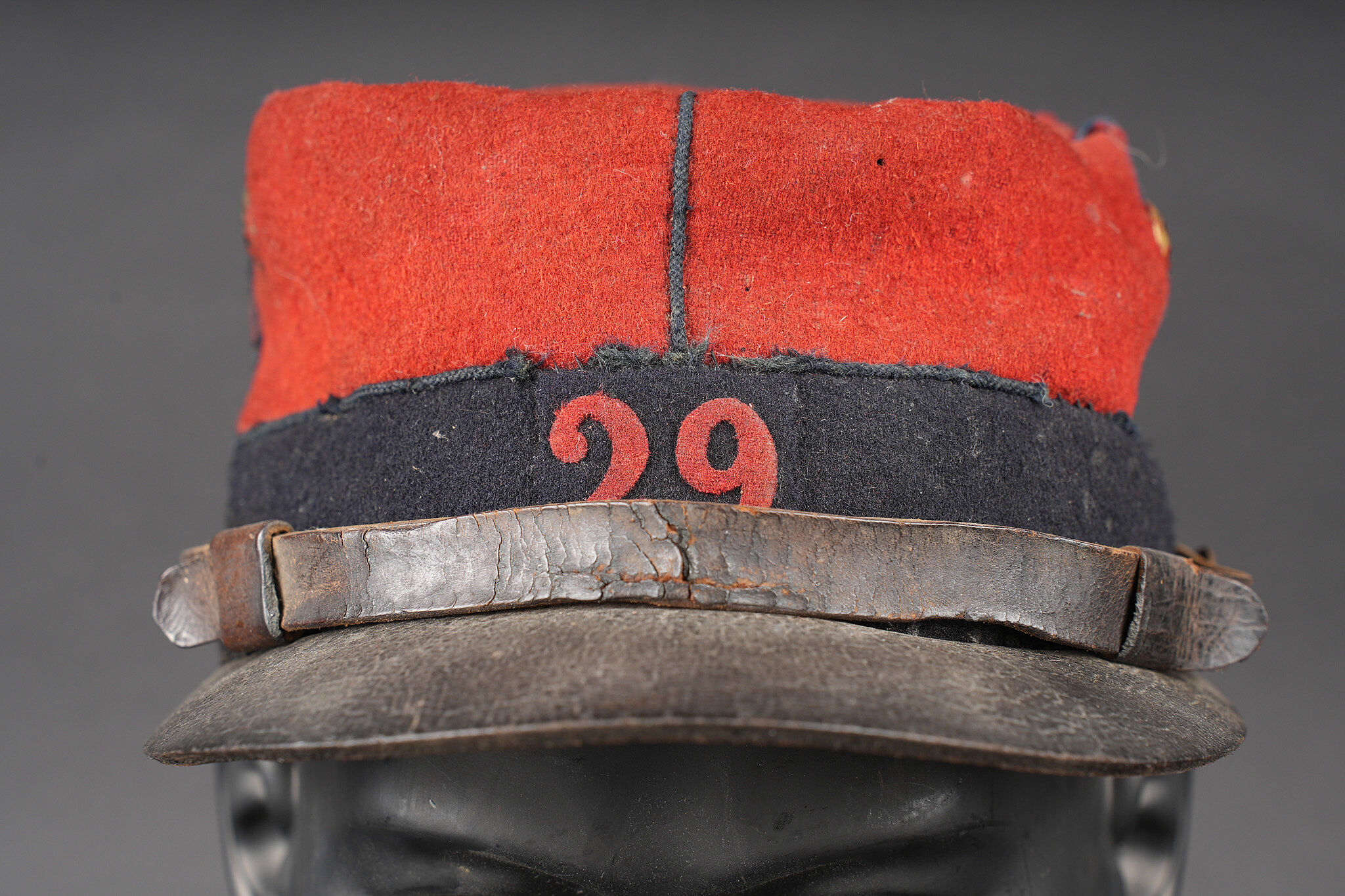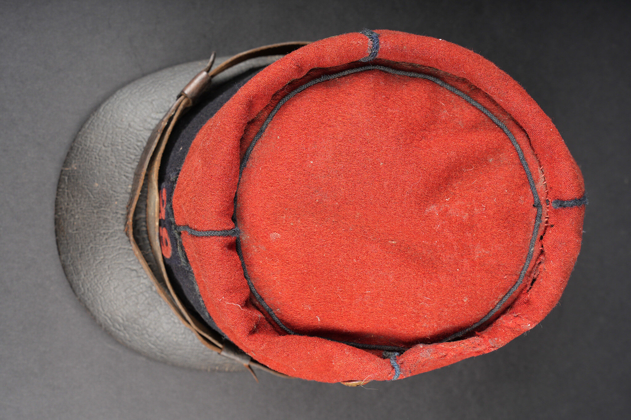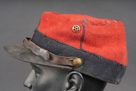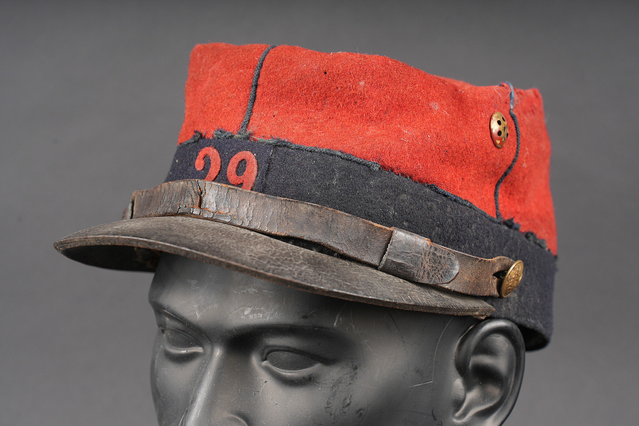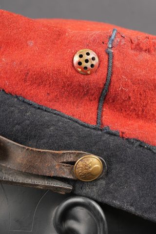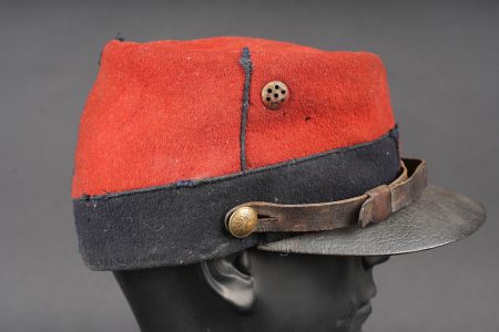 Képi 1884 29ème de ligne. Képi réglementaire confectionné en drap garance et bleu foncé pour le bandeau, passepoil bleu, chiffre 29 en drap garance cousu sur une pièce de drap bleu foncé et collée au képi. Fausse jugulaire troupe en cuir fauve retenue par deux boutons d’infanterie dorés, basane courte en cuir de 5cm. Carcasse en toile de jute, macaron en cuir dont les marquages sont illisibles, on aperçoit le nom du soldat Gidel. Aérateurs en peinture d’origine, visière en cuir légèrement craquelé sans marquage. Le képi présente plusieurs accrocs, la visière a été entièrement recollée, des traces de colle sont présentes sur le haut du képi au niveau de la partie garance. Le 29ème de ligne était stationné à Autun. Kepi Model 1884 29th Line Infantry Regiment. Regulation kepi in garance cloth with dark blue band and blue piping. Red cloth numeral 29 sewn on a dark blue backing and fixed to the body. Other ranks false chinstrap in fawn leather secured by two gilt infantry buttons. Short 5 cm leather sweatband. Jute body with leather size patch with illegible markings and the name Gidel visible. Original painted ventilation eyelets. Leather peak slightly cracked and unmarked. Several moth nips. Peak completely reglued with visible traces of adhesive on the upper red section. The 29th Line was garrisoned at Autun.