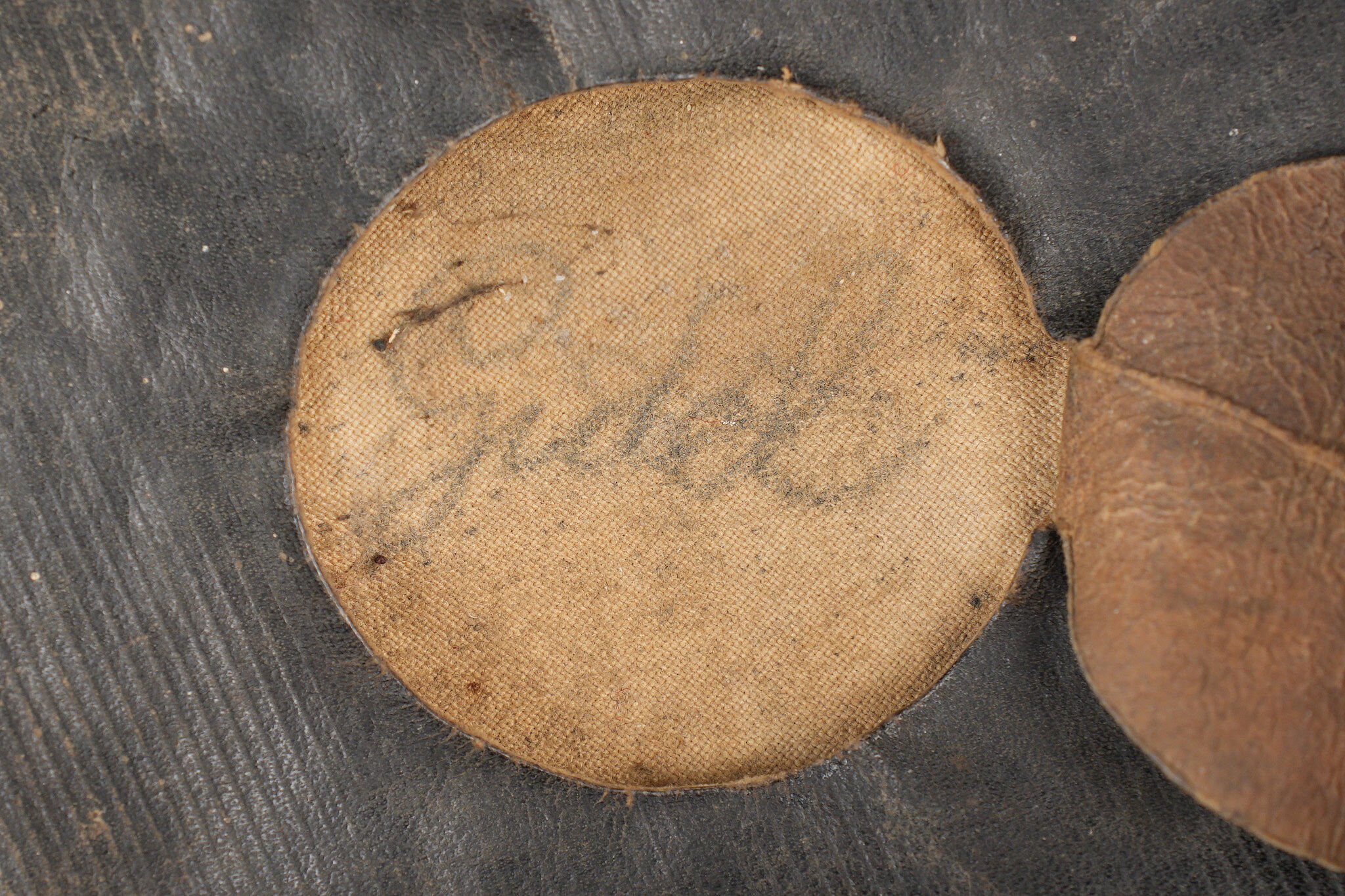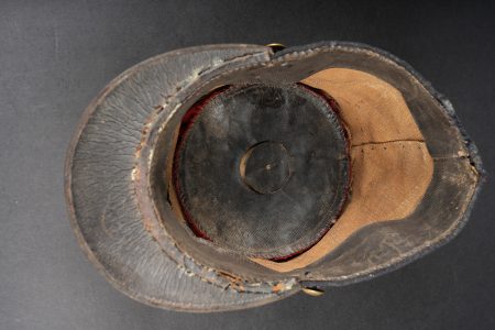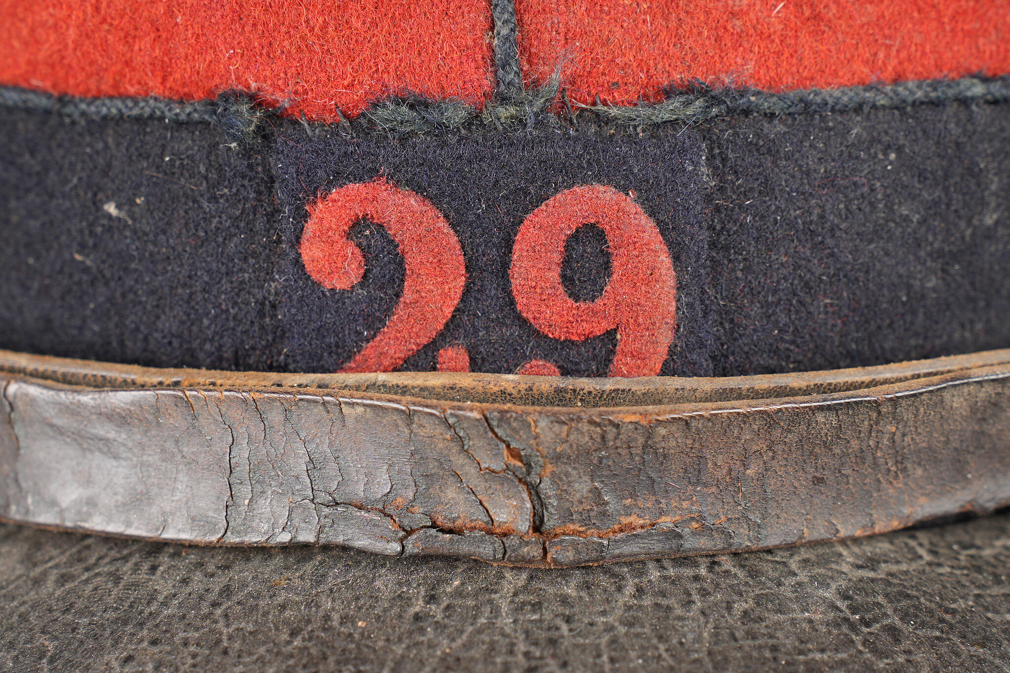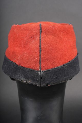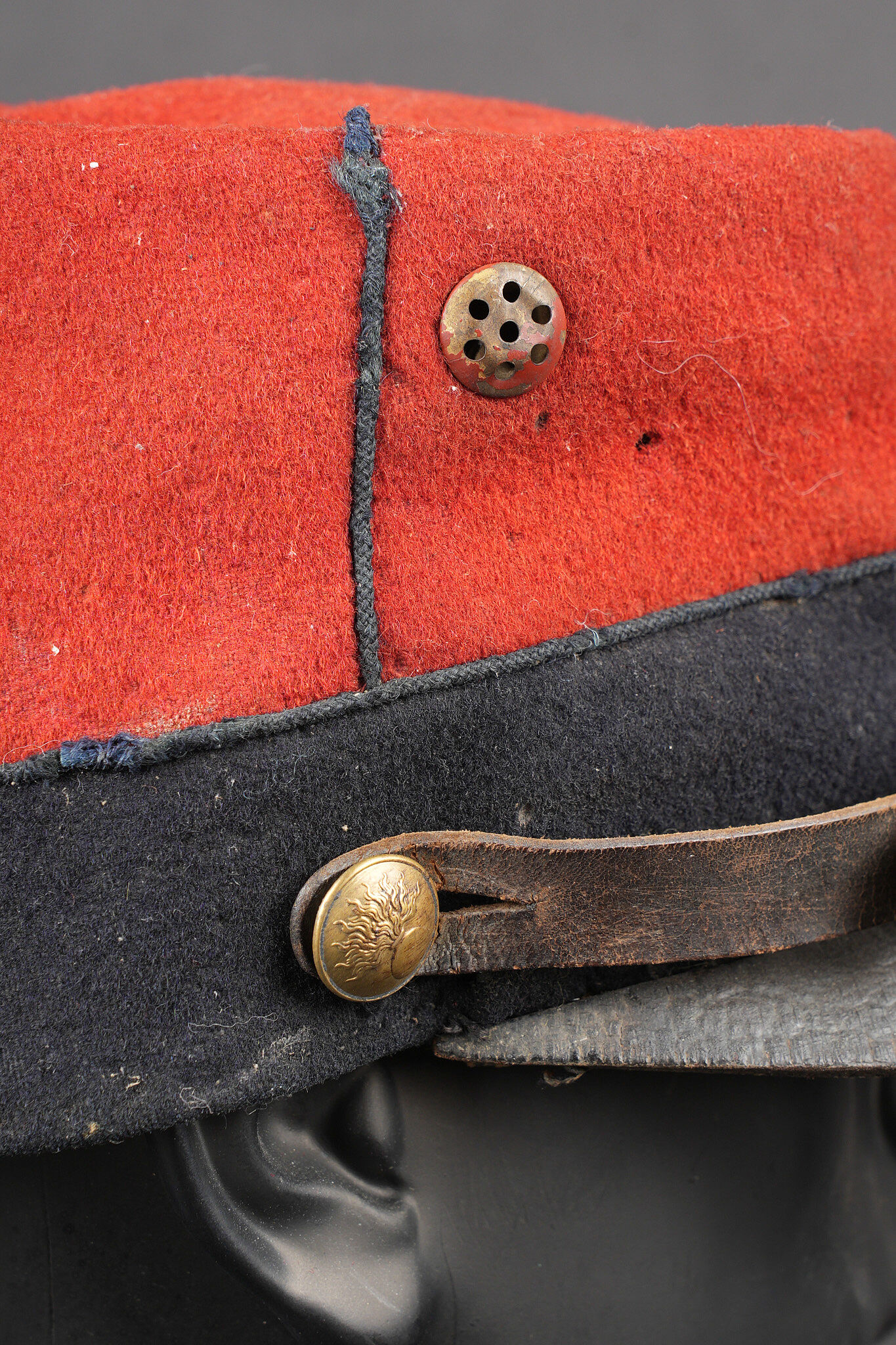 Képi 1884 29ème de ligne. Képi réglementaire confectionné en drap garance et bleu foncé pour le bandeau, passepoil bleu, chiffre 29 en drap garance cousu sur une pièce de drap bleu foncé et collée au képi. Fausse jugulaire troupe en cuir fauve retenue par deux boutons d’infanterie dorés, basane courte en cuir de 5cm. Carcasse en toile de jute, macaron en cuir dont les marquages sont illisibles, on aperçoit le nom du soldat Gidel. Aérateurs en peinture d’origine, visière en cuir légèrement craquelé sans marquage. Le képi présente plusieurs accrocs, la visière a été entièrement recollée, des traces de colle sont présentes sur le haut du képi au niveau de la partie garance. Le 29ème de ligne était stationné à Autun. Kepi Model 1884 29th Line Infantry Regiment. Regulation kepi in garance cloth with dark blue band and blue piping. Red cloth numeral 29 sewn on a dark blue backing and fixed to the body. Other ranks false chinstrap in fawn leather secured by two gilt infantry buttons. Short 5 cm leather sweatband. Jute body with leather size patch with illegible markings and the name Gidel visible. Original painted ventilation eyelets. Leather peak slightly cracked and unmarked. Several moth nips. Peak completely reglued with visible traces of adhesive on the upper red section. The 29th Line was garrisoned at Autun.