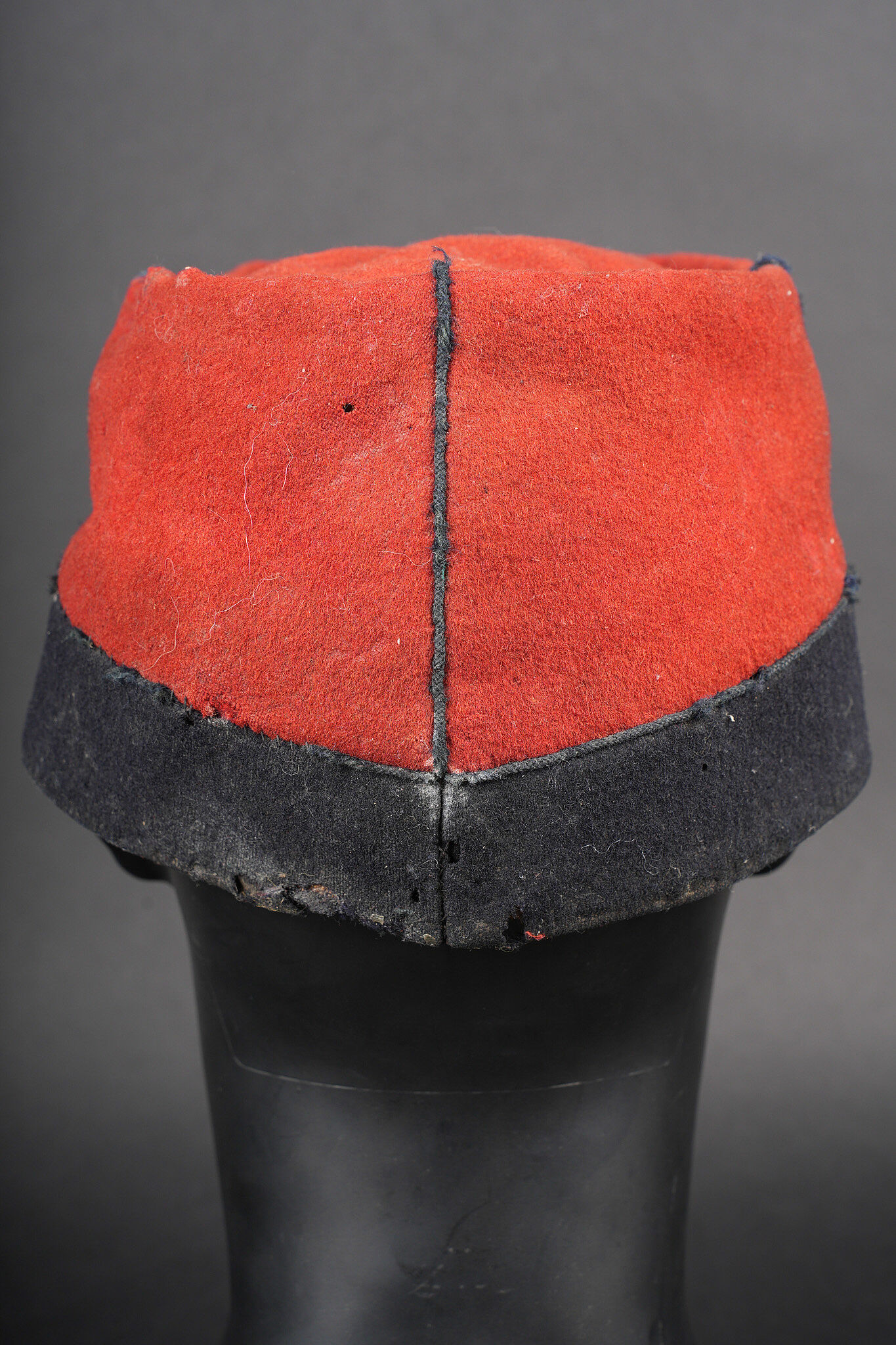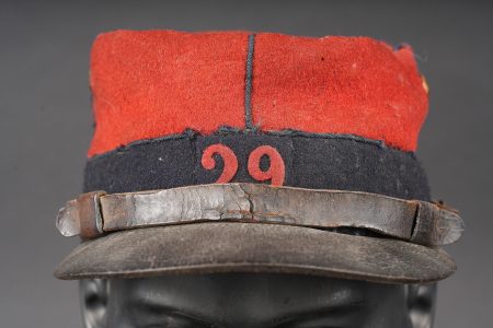 Détails de la vente >Képi 1884 29ème de ligne. Képi réglementaire confectionné en drap garance et bleu foncé pour le bandeau, passepoil bleu, chiffre 29 en drap garance cousu sur une pièce de drap bleu foncé... en savoir plus