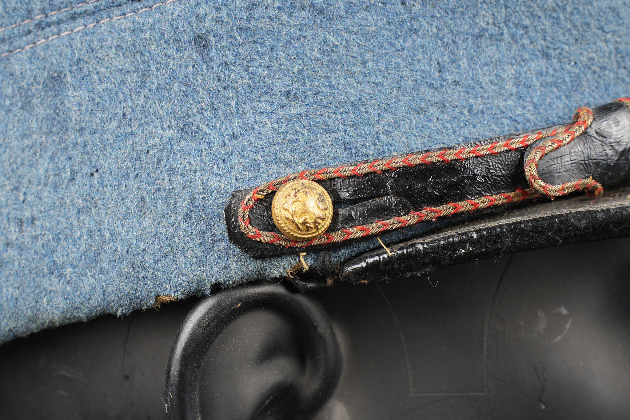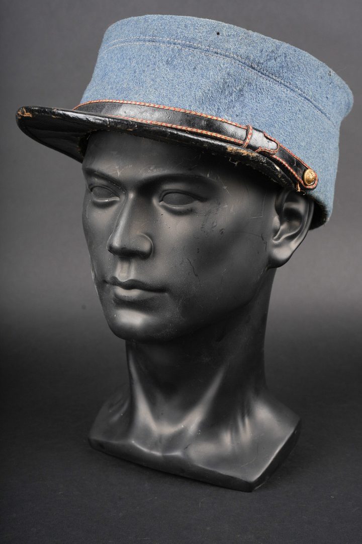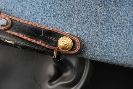 Képi du commerce bleu horizon. Réalisé en drap bleu horizon d’officier, fausse jugulaire en cuir laqué avec le passepoil d’adjudant et retenue par deux petits boutons... en savoir plus