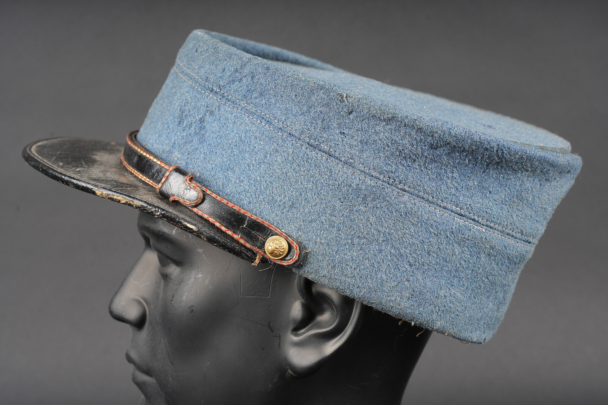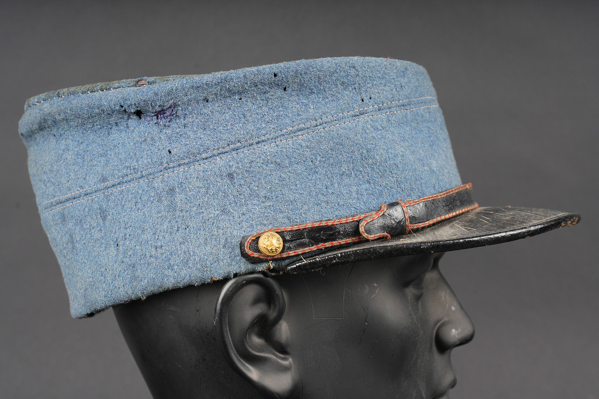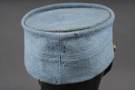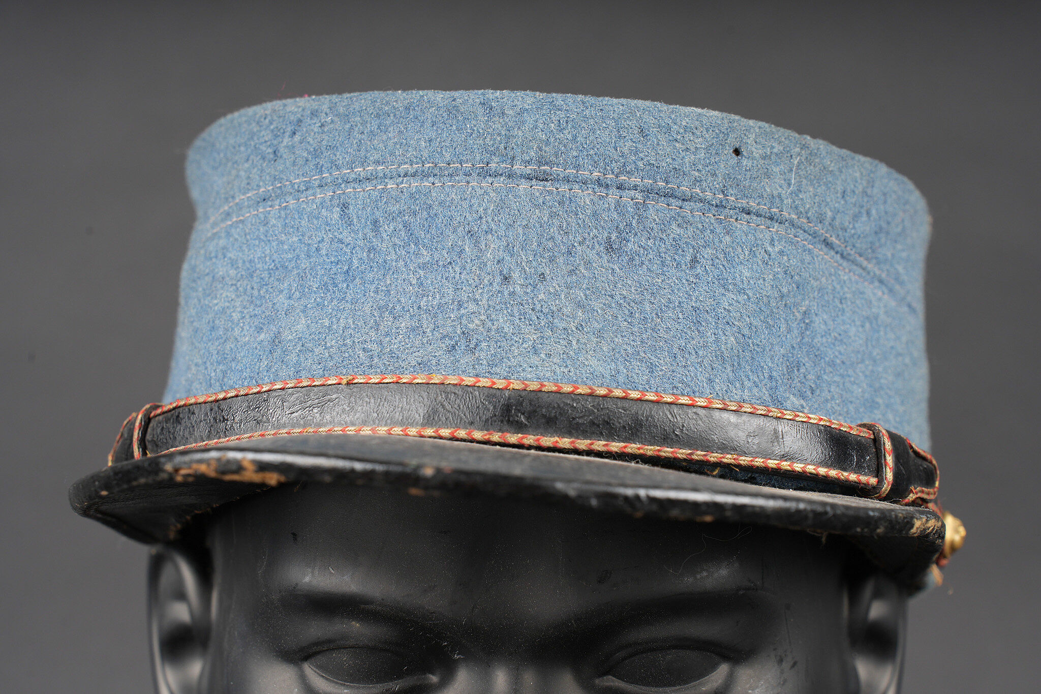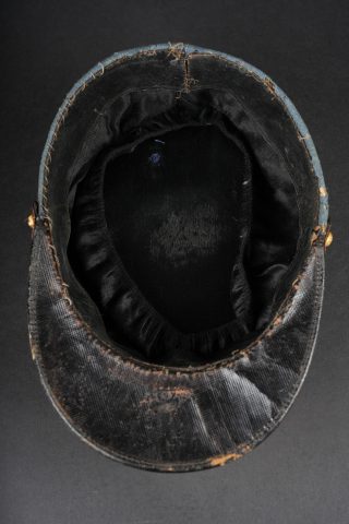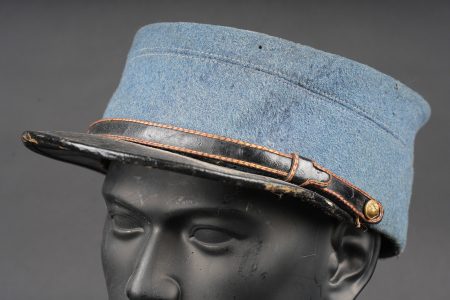Képi du commerce bleu horizon. Réalisé en drap bleu horizon d’officier, fausse jugulaire en cuir laqué avec le passepoil d’adjudant et retenue par deux petits boutons d’infanterie. Visière en cuir fin, bandeau en cuir noir, doublure intérieure en soie. Quelques accrocs. Private purchase horizon blue kepi. Made in officer quality horizon blue cloth with a lacquered leather false chinstrap with adjutant piping secured by two small infantry buttons. Fine leather peak black leather sweatband and silk lining. Minor wear.