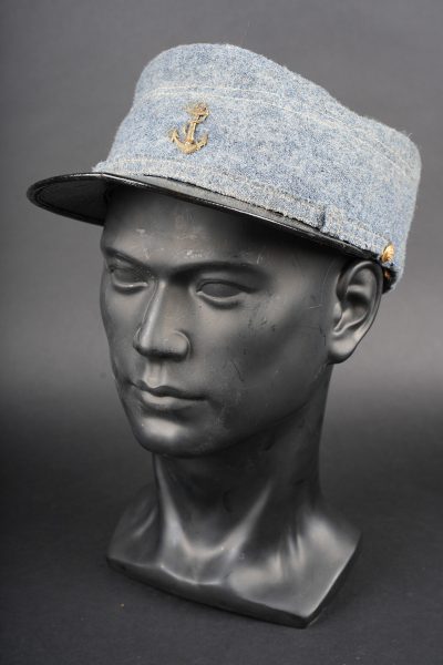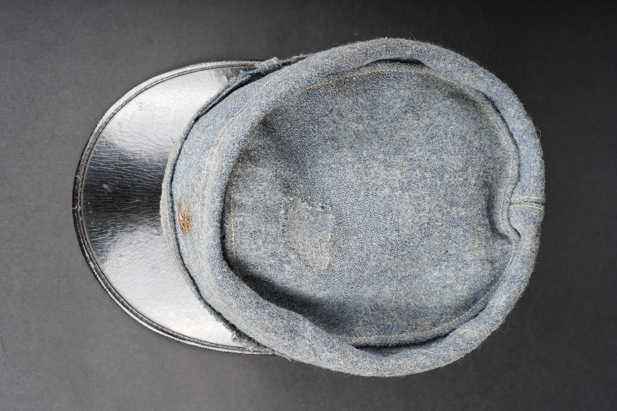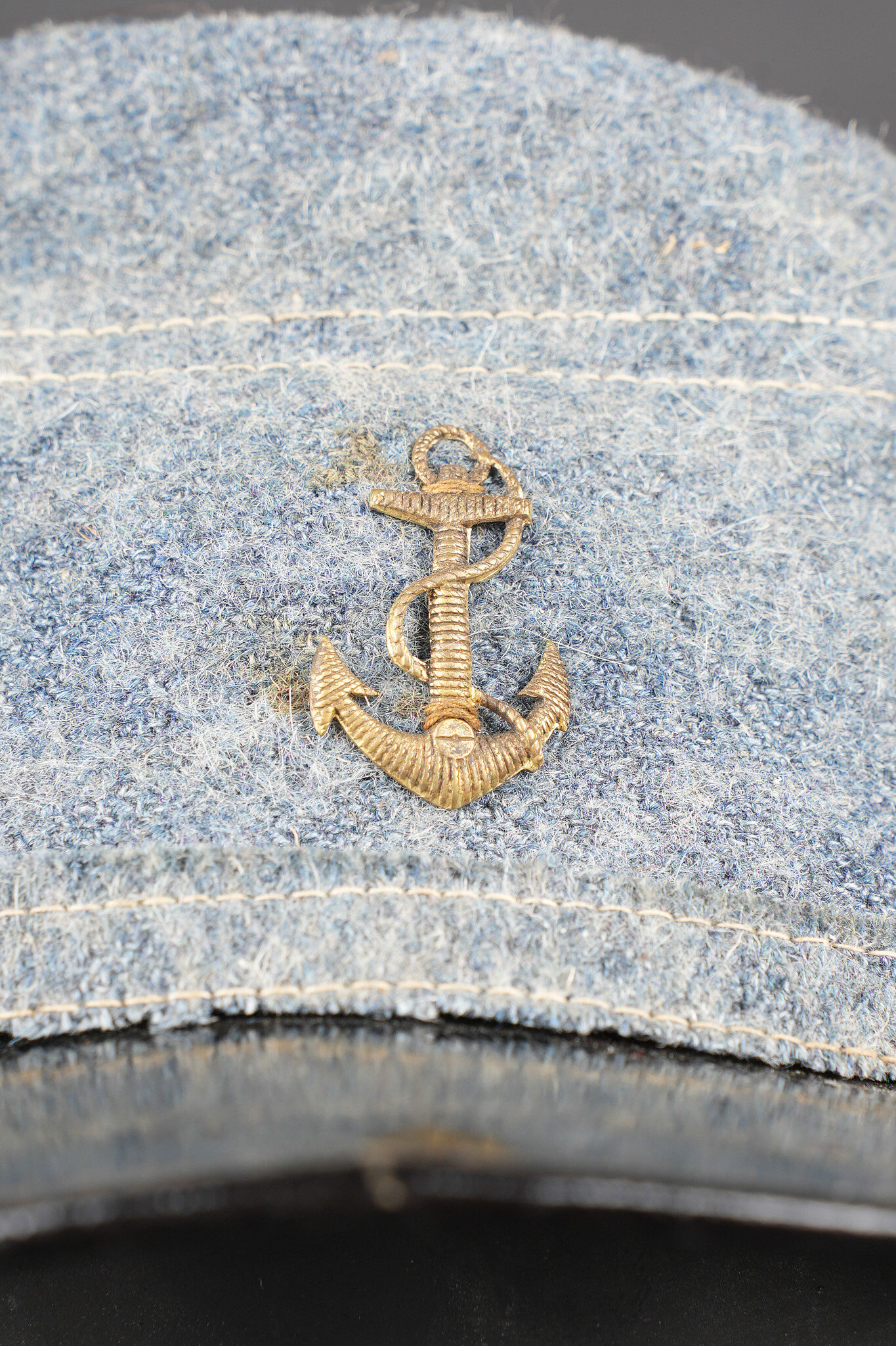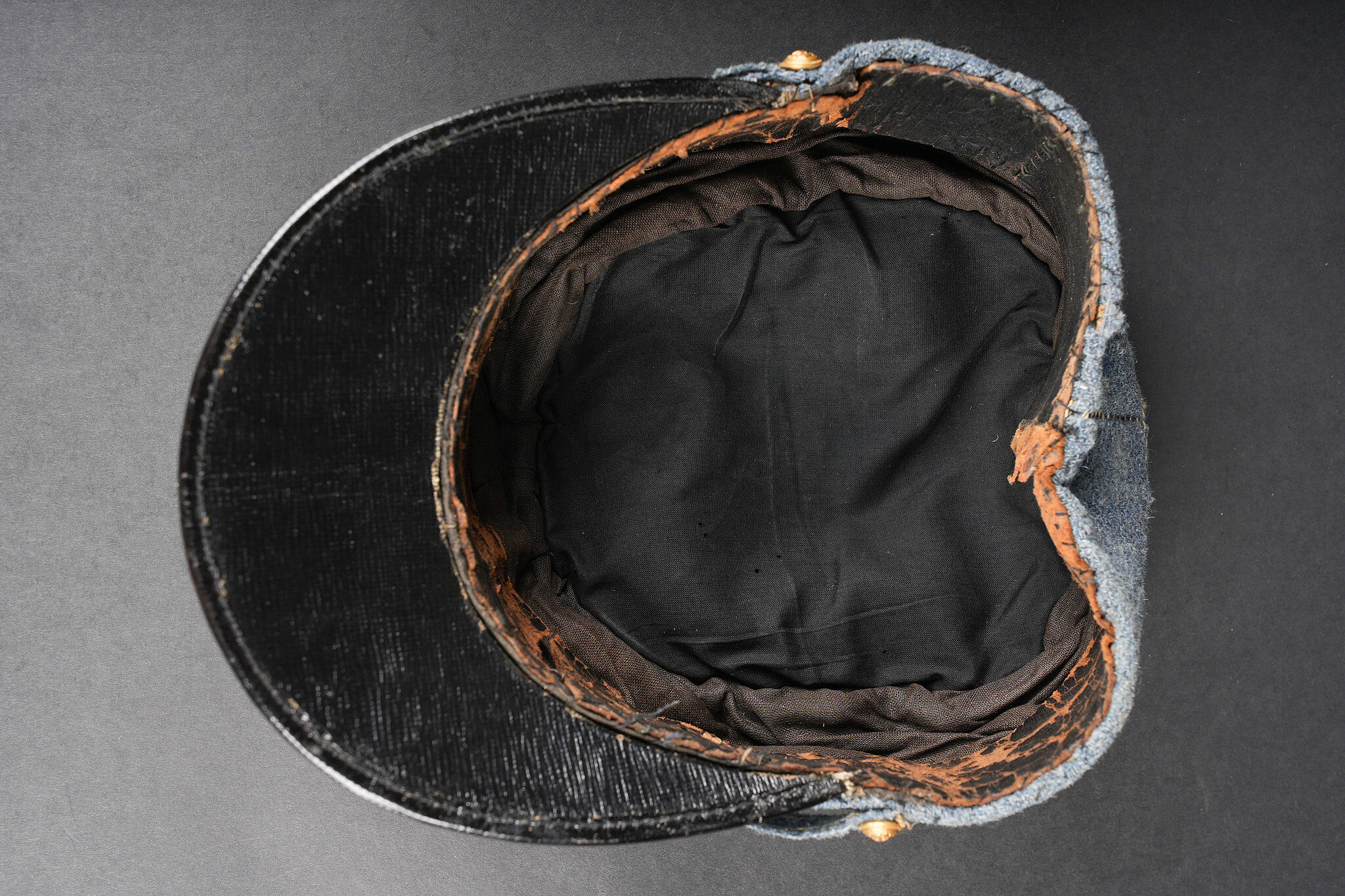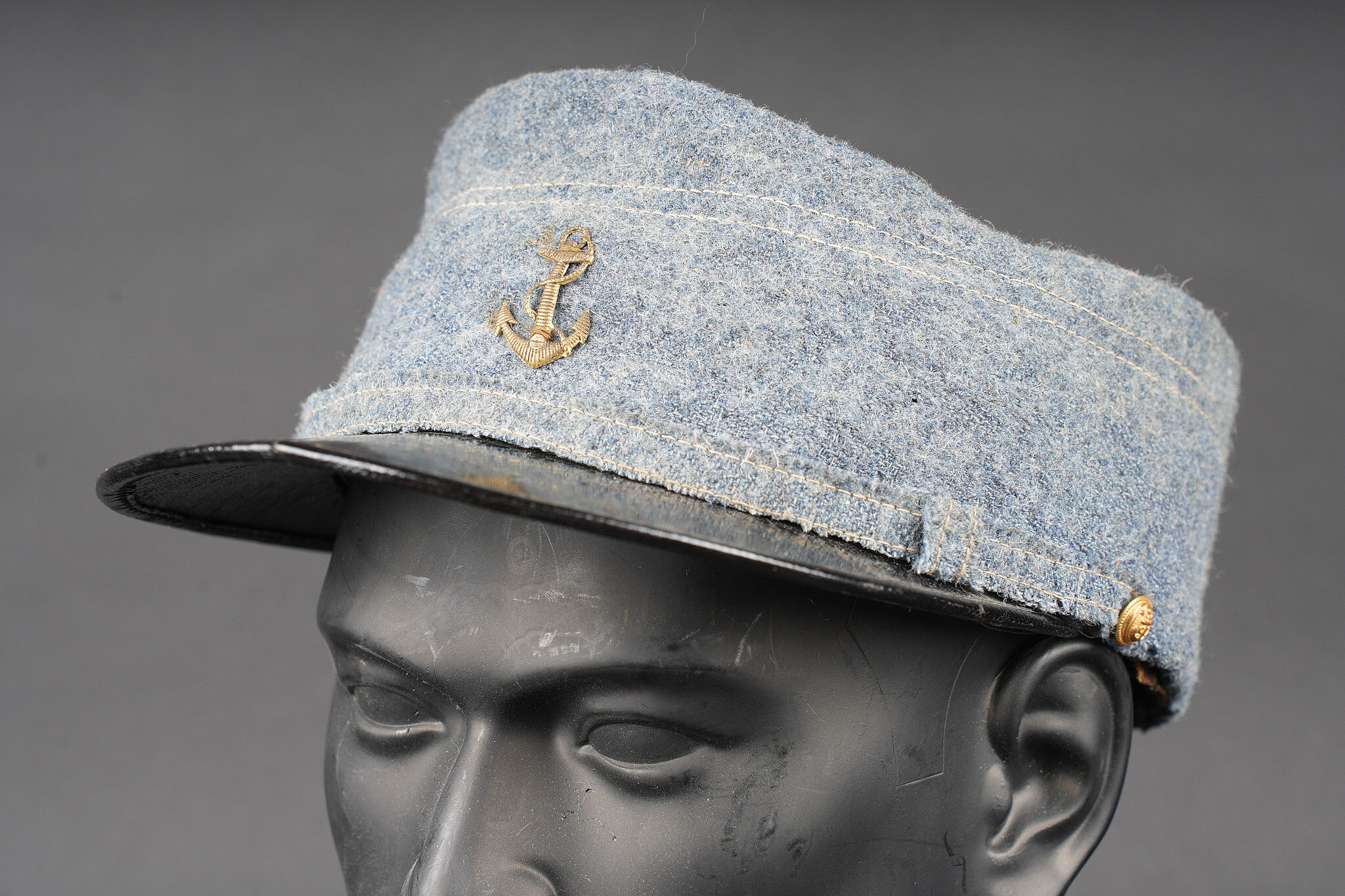 Képi du commerce troupes coloniale. Confectionné en drap bleu horizon troupe, fausse jugulaire en drap bleu horizon retenue par deux boutons de l’infanterie coloniale. Plateau présentant une réparation postérieure d’environ 3x3cm, plusieurs reprises. Ancre en métal rapporté, visière en cuir fin, bandeau en cuir noir accidenté, doublure en coton noir. Hauteur 9cm. Private-purchase colonial troops kepi. Other ranks’ horizon-blue cloth, false chinstrap in matching cloth held by two colonial infantry buttons. Top with period repair approx. 3 × 3 cm and several darns. Applied metal anchor badge. Thin leather visor, damaged black leather sweatband, black cotton lining. Height 9 cm.