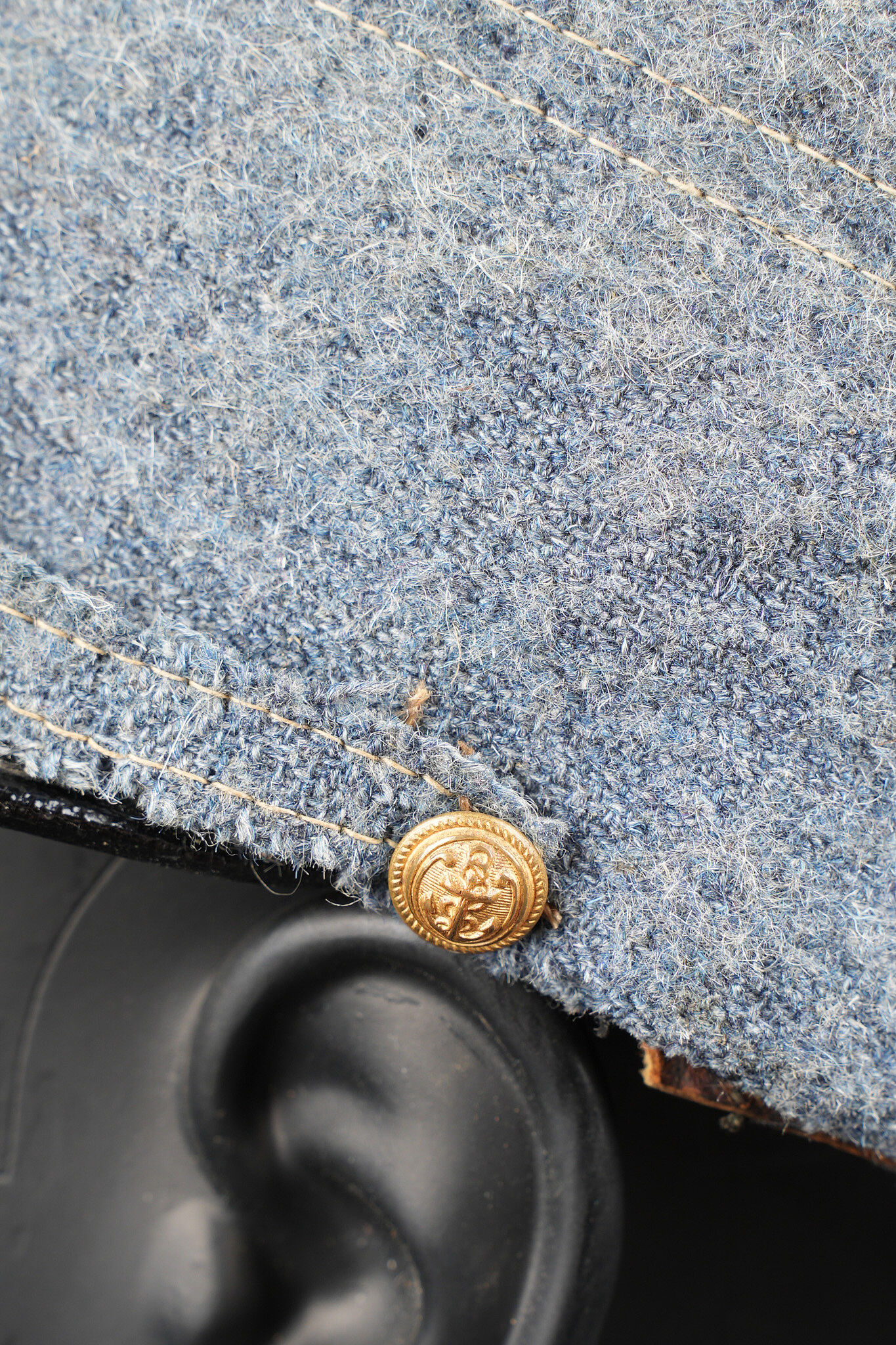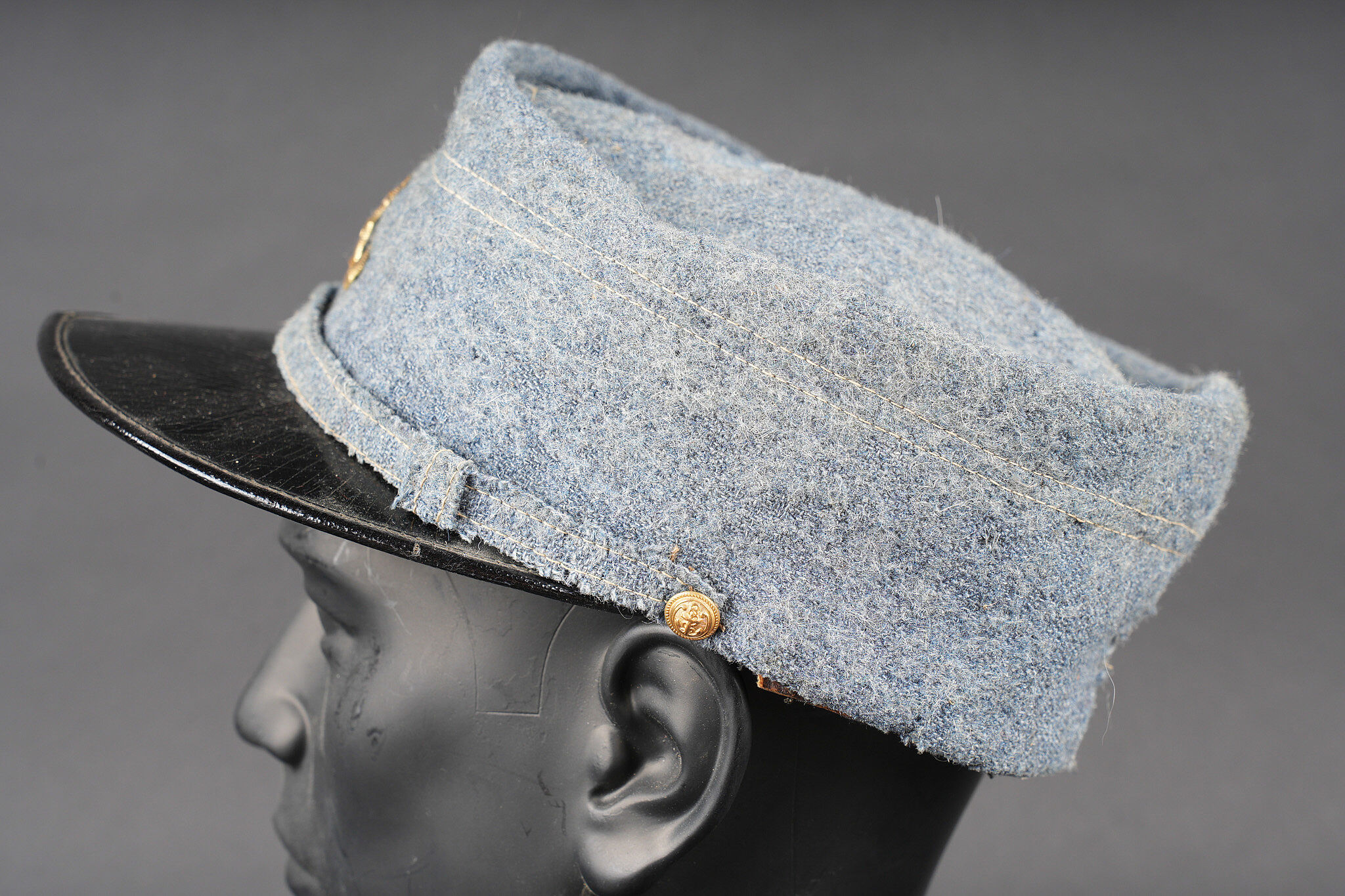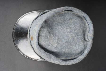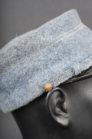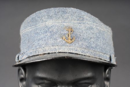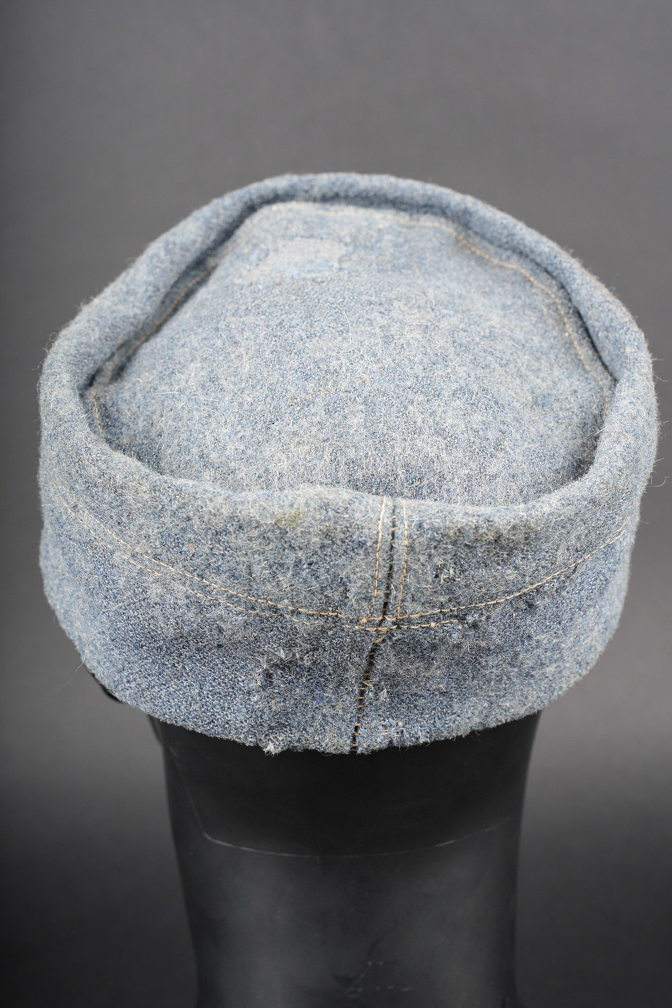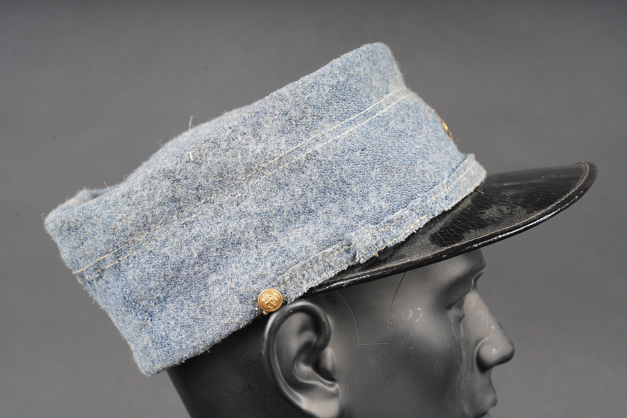 Képi du commerce troupes coloniale. Confectionné en drap bleu horizon troupe, fausse jugulaire en drap bleu horizon retenue par deux boutons de l’infanterie coloniale. Plateau présentant une réparation postérieure d’environ 3x3cm, plusieurs reprises. Ancre en métal rapporté, visière en cuir fin, bandeau en cuir noir accidenté, doublure en coton noir. Hauteur 9cm. Private-purchase colonial troops kepi. Other ranks’ horizon-blue cloth, false chinstrap in matching cloth held by two colonial infantry buttons. Top with period repair approx. 3 × 3 cm and several darns. Applied metal anchor badge. Thin leather visor, damaged black leather sweatband, black cotton lining. Height 9 cm.